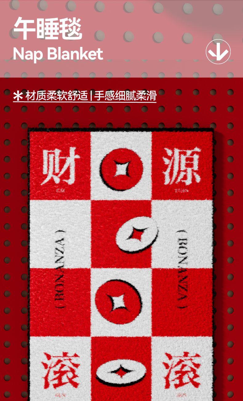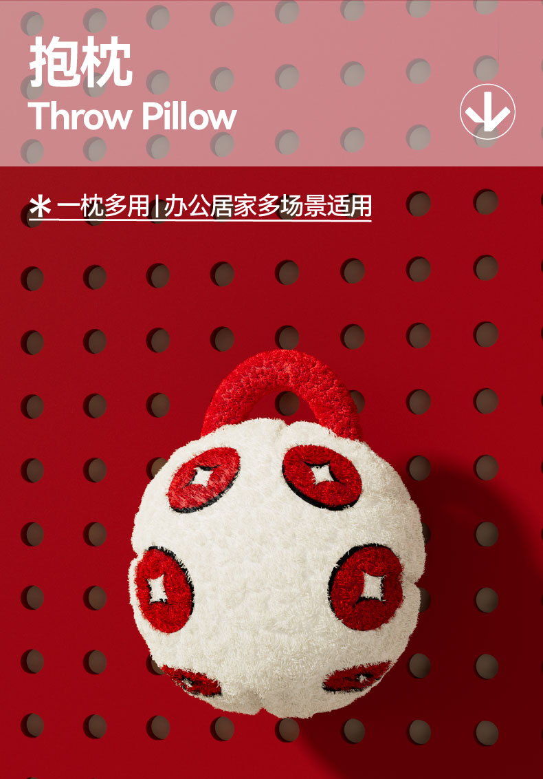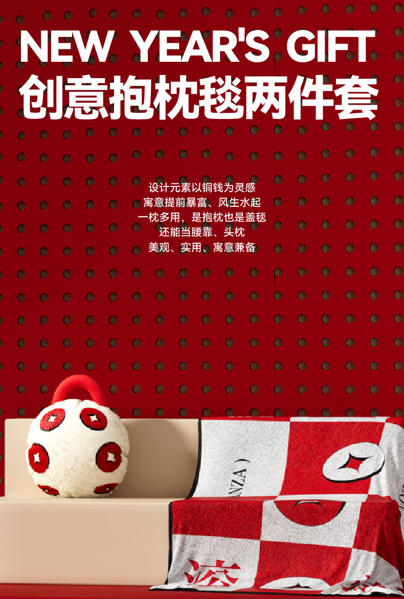 设计元素以铜钱为灵感 寓意提前暴富、风生水起 一枕多用,是抱枕也是盖毯 还能当腰靠、头枕 美观、实用、寓意兼备 午睡毯 尺寸:100x150cm 材质:牛奶绒 抱枕 尺寸:35cm直径 材质:外壳-珊瑚绒 内胆-棉 卖点:材质柔软舒适/一枕多用