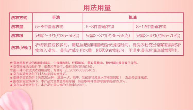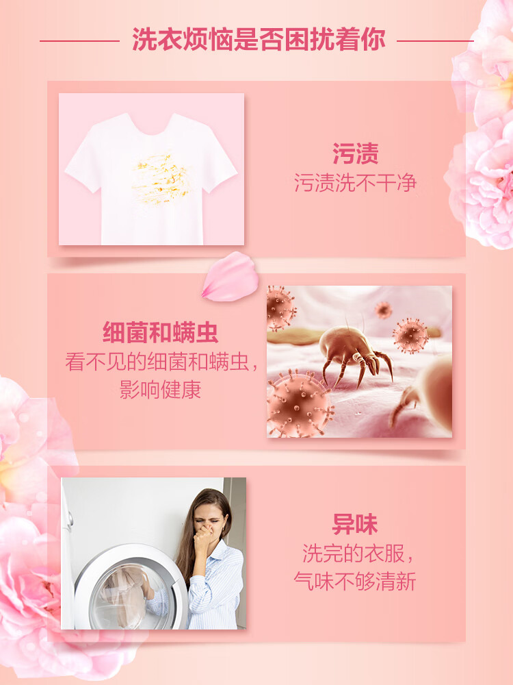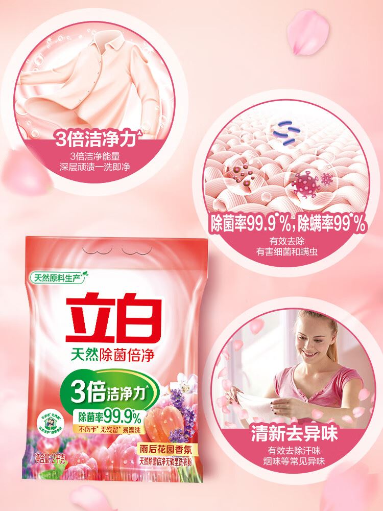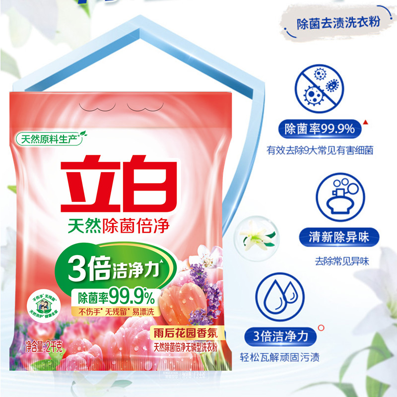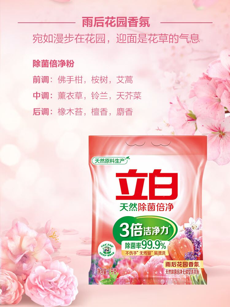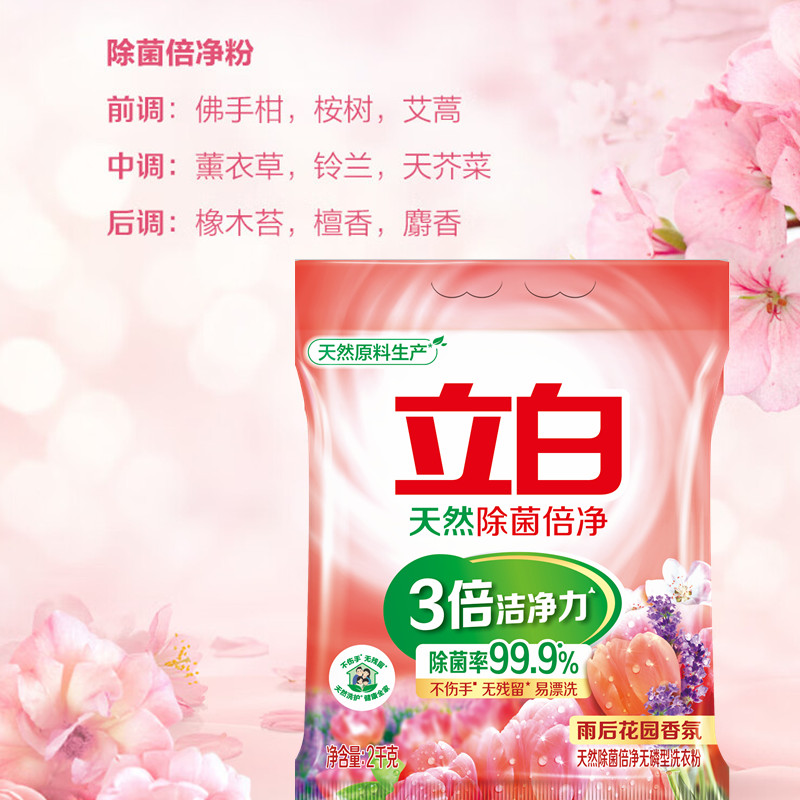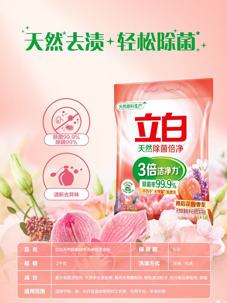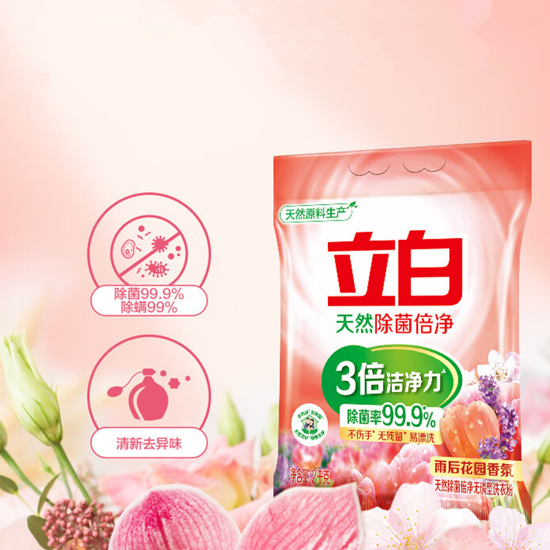 保质期:三年 香型:雨后花园香氛 产品成分:复合表面活性剂、不烫手去渍助剂、复合生物酶制剂、绿色速洁粒子、抗污垢回渗助剂、香精 卖点: 3倍洁净力、除 菌率99.9%、清新去异味