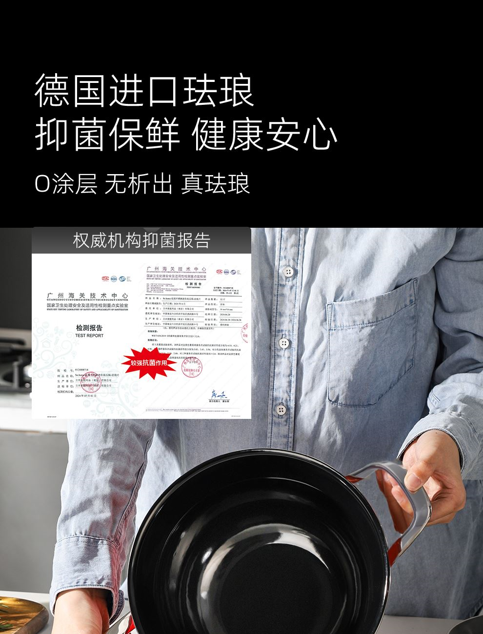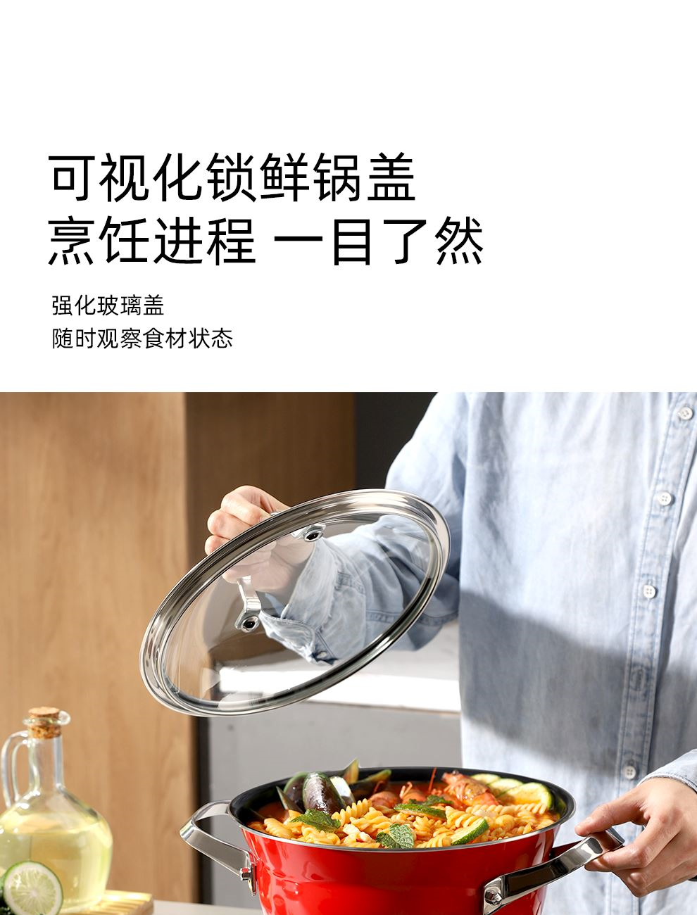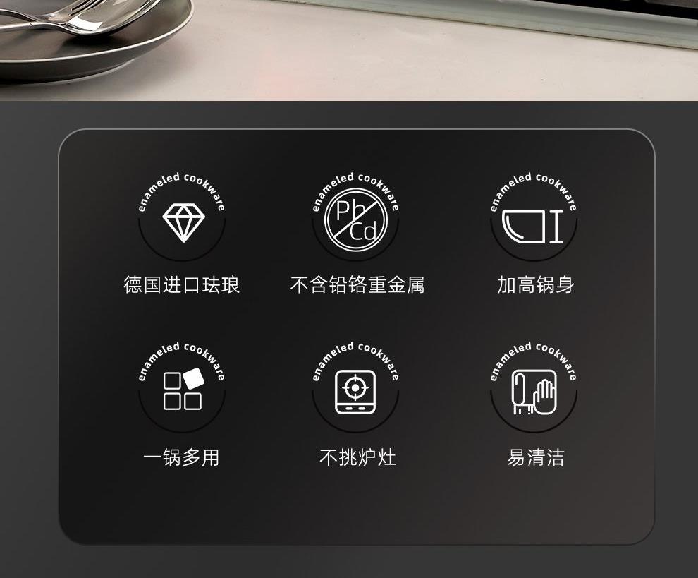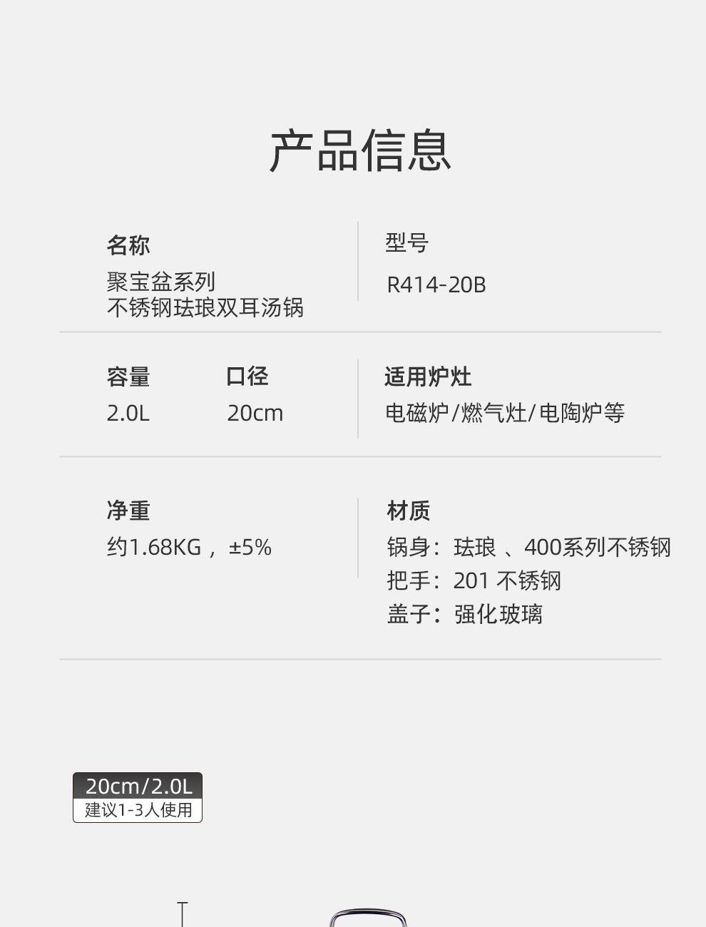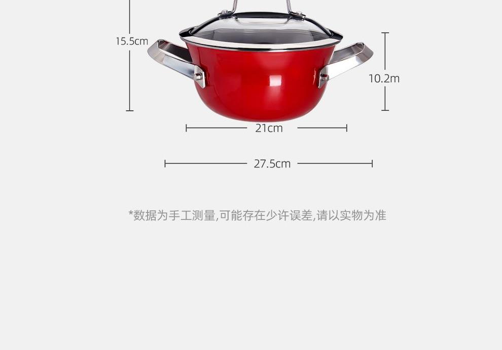 产品尺寸:口径20cm 高:10.2cm 产品容量:2.0L 产品材质: 锅身:珐琅、400系列不锈钢 把手:201不锈钢 盖子:强化玻璃 1、德国进口珐琅与不锈钢流光锁鲜,还原食材本真; 2、无铅无异味,健康无害,外扩盘壁.翻面方便,出锅顺畅。 3、加宽防烫把手,锅身受热快速,全灶具通用。