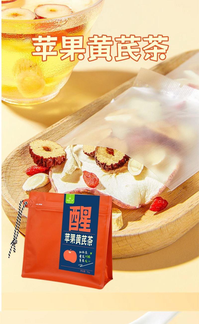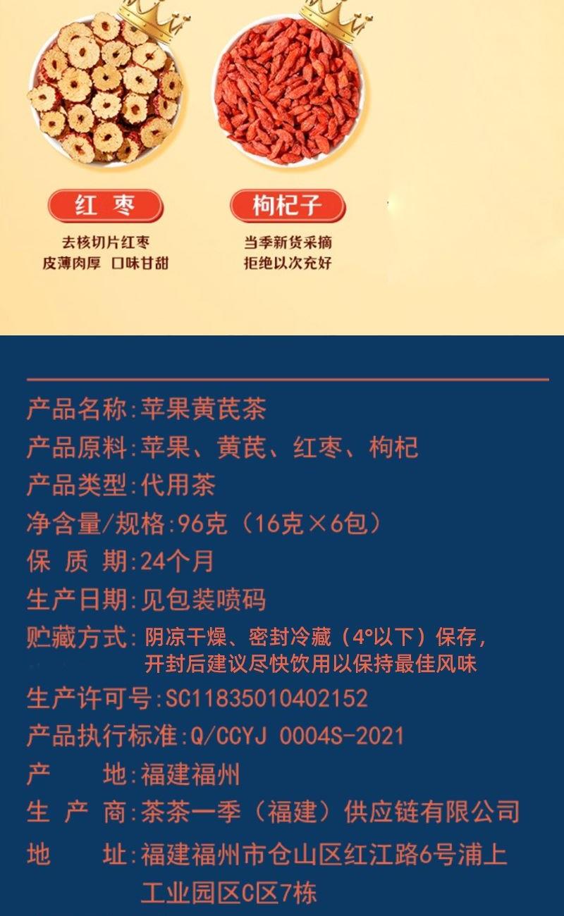 茶茶一季苹果黄芪茶16g*6袋,以“果香入茶·元气补给”为核心卖点、茶包独立包装,冲泡便捷,5分钟即得金黄透亮茶汤,苹果清甜与黄芪药香交织,口感清润无苦涩,回甘持久;