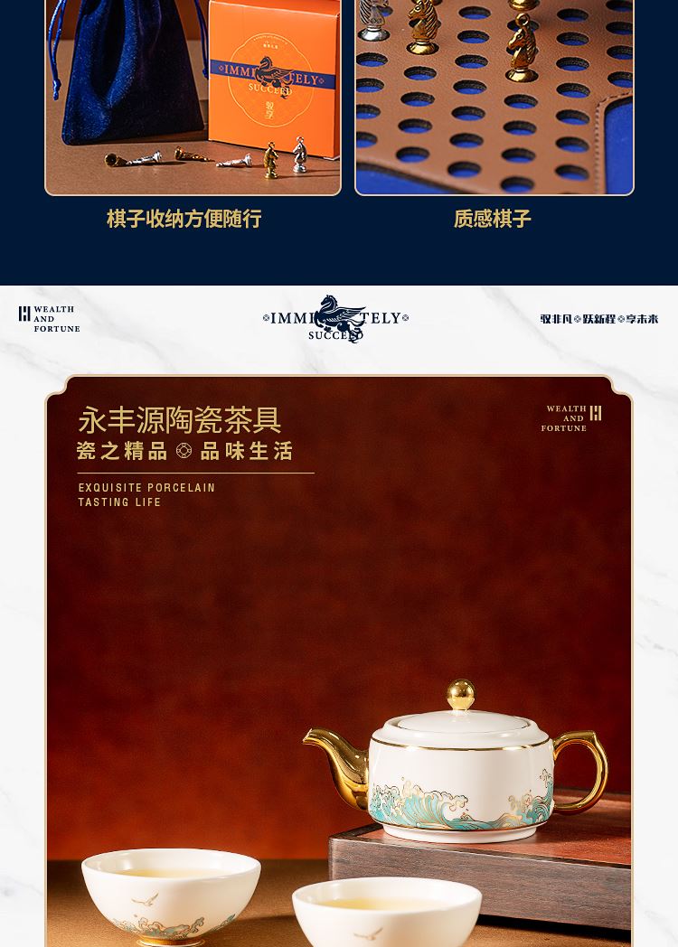 礼品配置清单: 双层主题礼盒、团圆皮革棋盘、马头棋子、精品柠檬古树红茶*6颗 、永丰源陶瓷快客茶具一壶二杯组合、 老白茶*2盒、新会陈皮*2盒