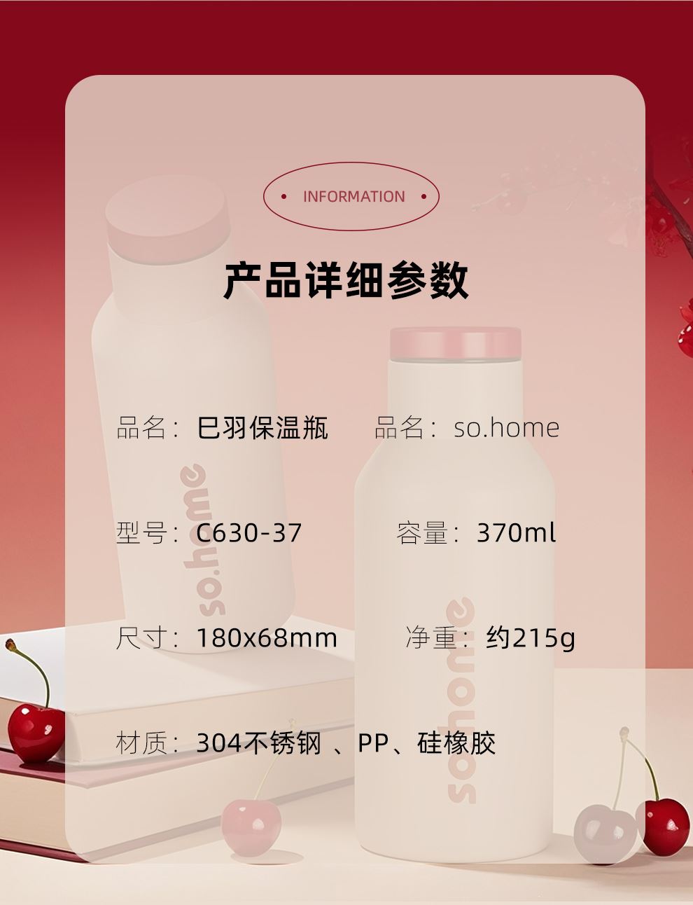 产品容量:370ml 产品材质:杯身:内外304不锈钢;杯盖:PP+430不锈钢;密封圈:硅橡胶 1、副科小酒瓶,职场摸鱼神器, 领导以为你在喝酒,实际你在喝枸杞茶; 2、304内胆,拒绝运动后补水异味残留; 3、防社死密封,包中翻滚无潮损。