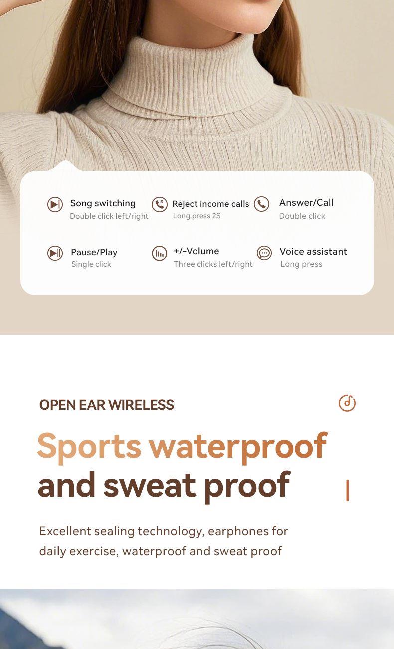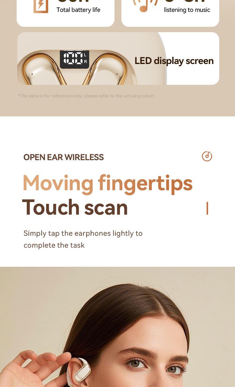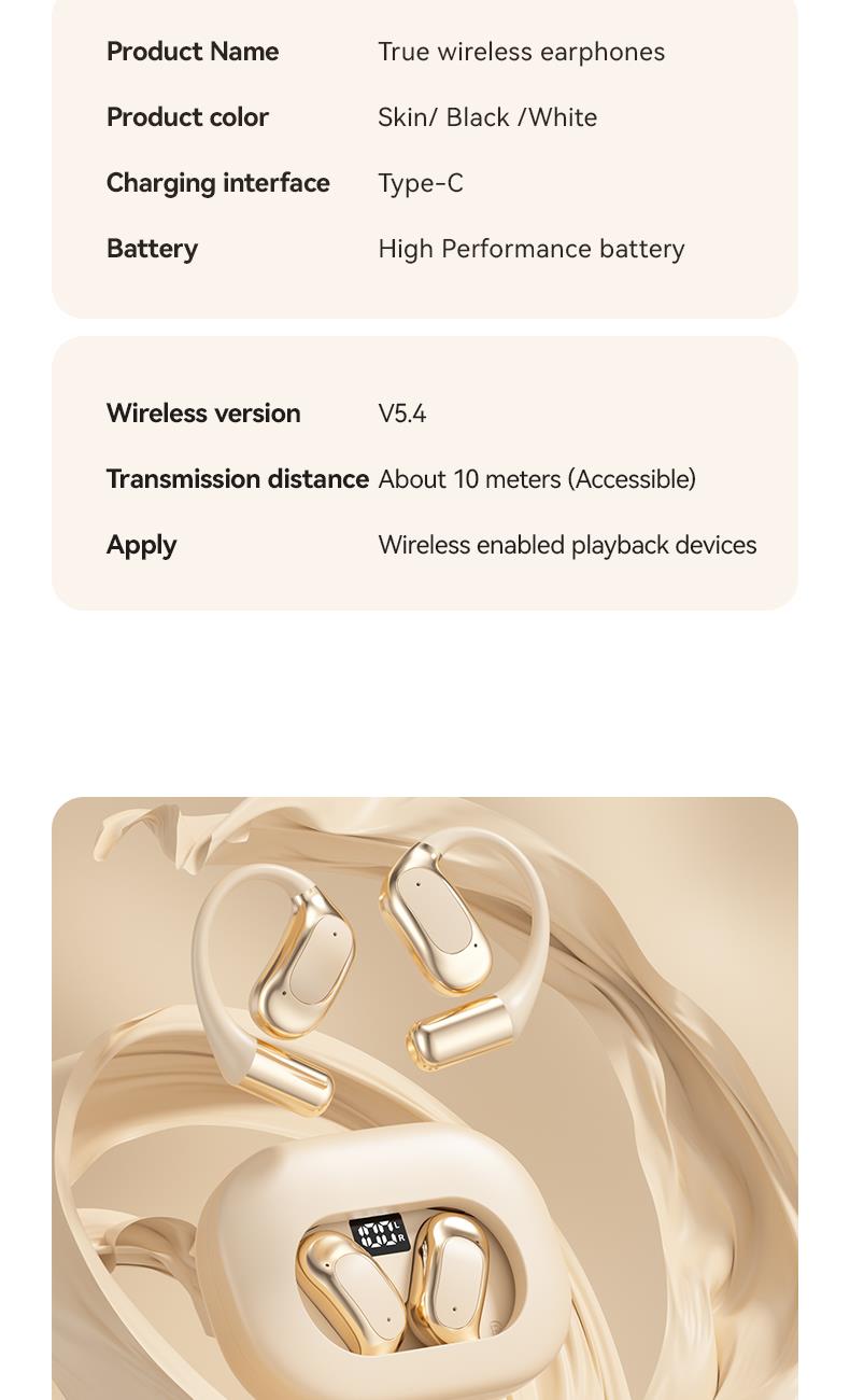电镀镂空OWS蓝牙耳机 型 号: M115 产品颜色:黑色、肤色、白色 带包装重量1PCS:104.6g 外箱尺寸:58.5*37*20.5CM 整箱数量:100 PCS 整箱重量:11.5KG 耳机尺寸: 5.2*4.2*1.25 CM 单耳重量:7.49 机仓尺寸:8.3*6.2*2.1CM 彩盒尺寸:11.5*9.2*3.6cm 裸机重量:56.8g 【功能特点】: 方案:蓝讯5756C蓝牙版本:V5.4支持协议:A2DP,AVRCP,HFP传输距离:10米耳机电池:500815机仓电池:602030-300毫安(带保护板)喇叭尺寸:F13真铜环