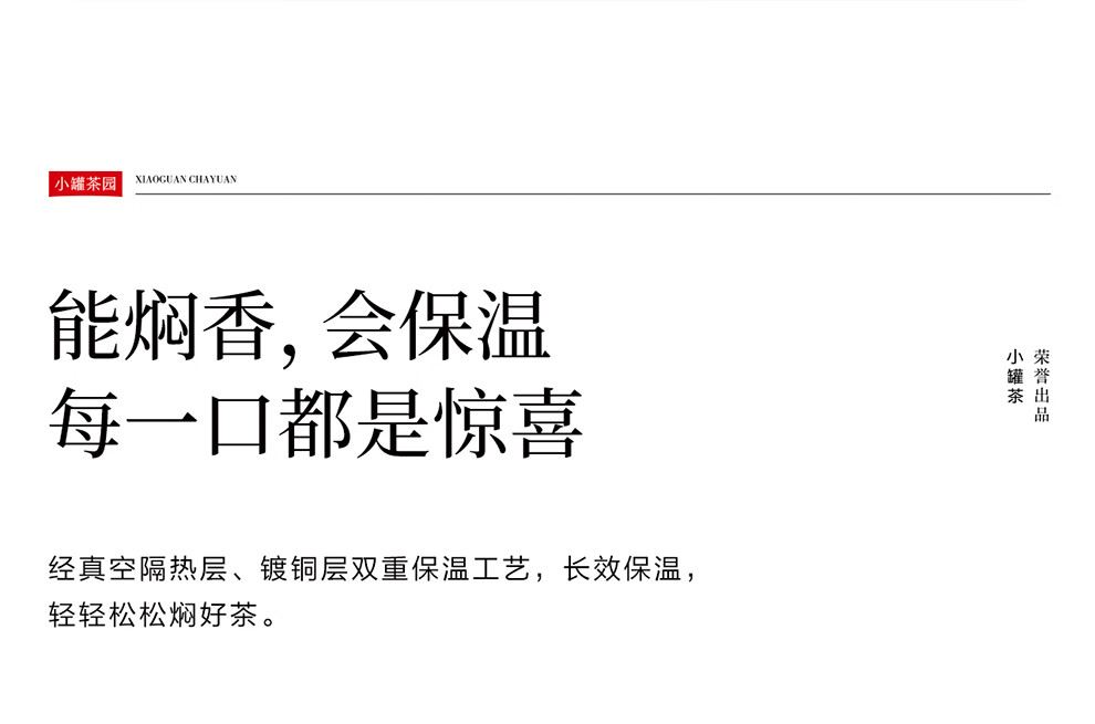 经真空隔热层、镀铜层双重保温工艺,长效保温,轻轻松松焖好茶。