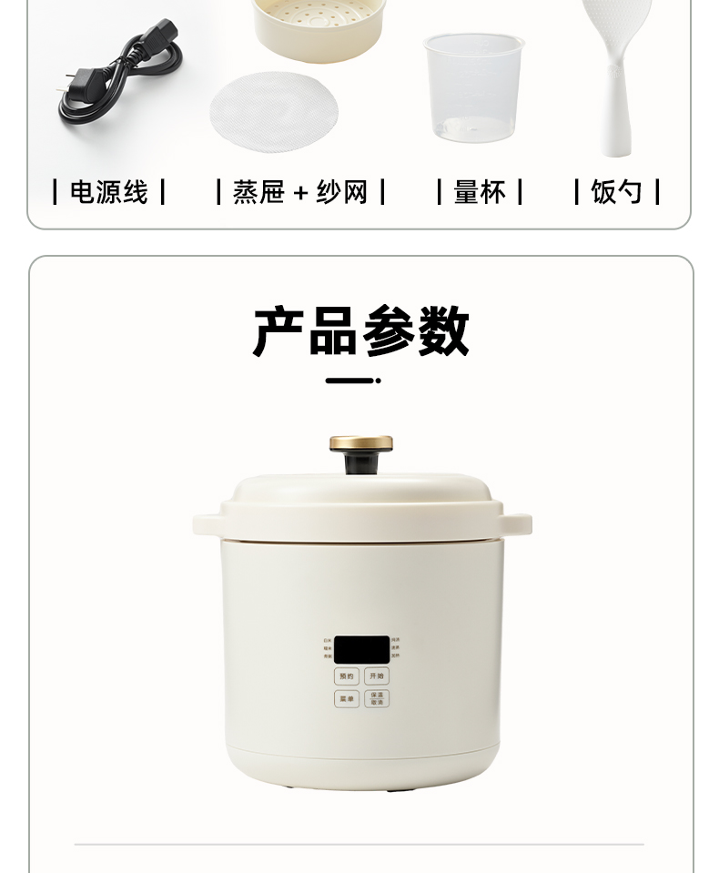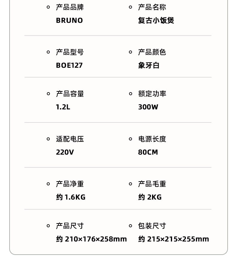 产品型号:BOE127 产品颜色:象牙白 产品容量:1.2L(内胆容量) 额定功率:300W 产品净重:约1.6KG 产品毛重:约2KG 产品尺寸:约210*176*258mm 包装尺寸:约215*215*255mm
