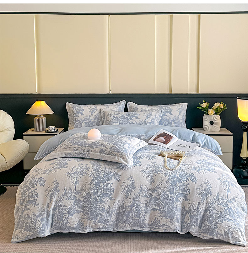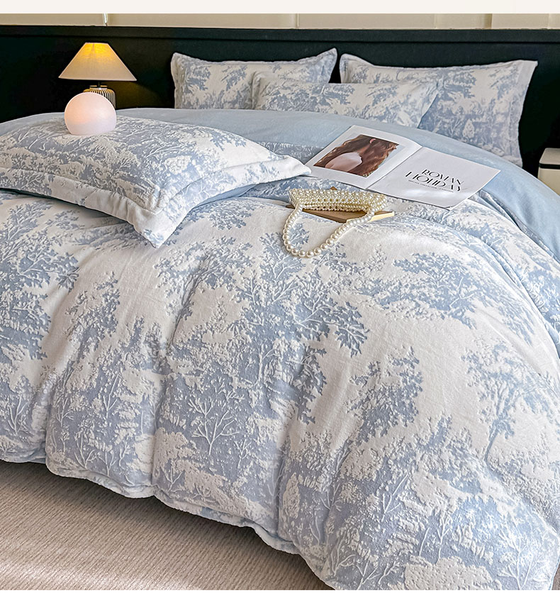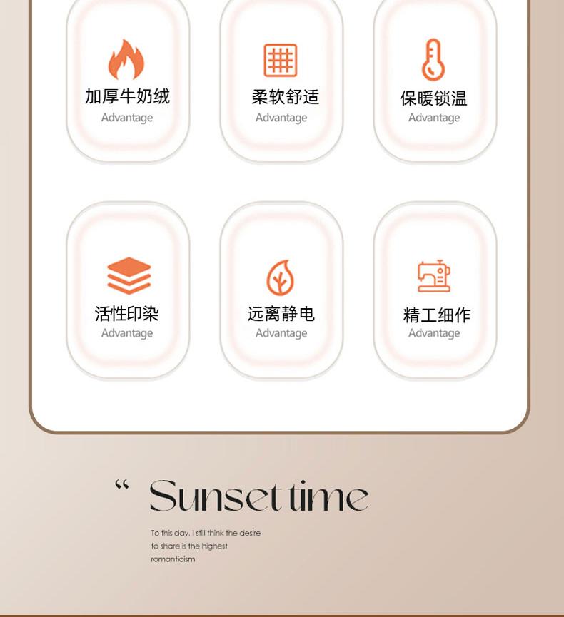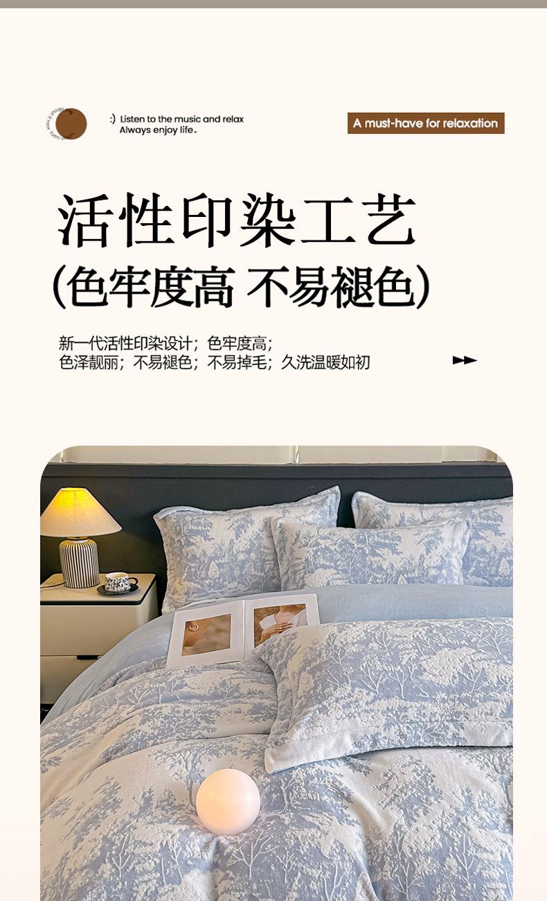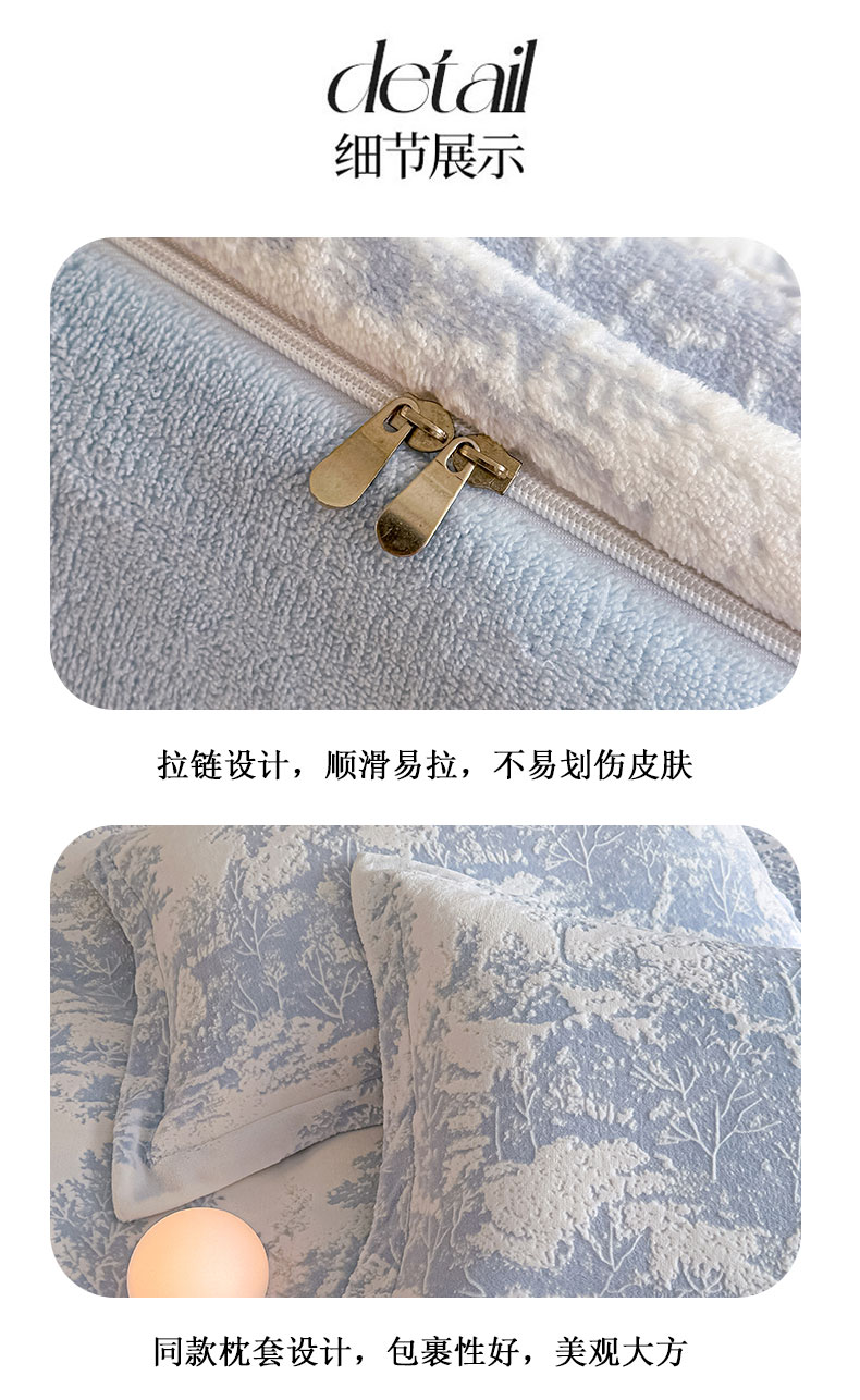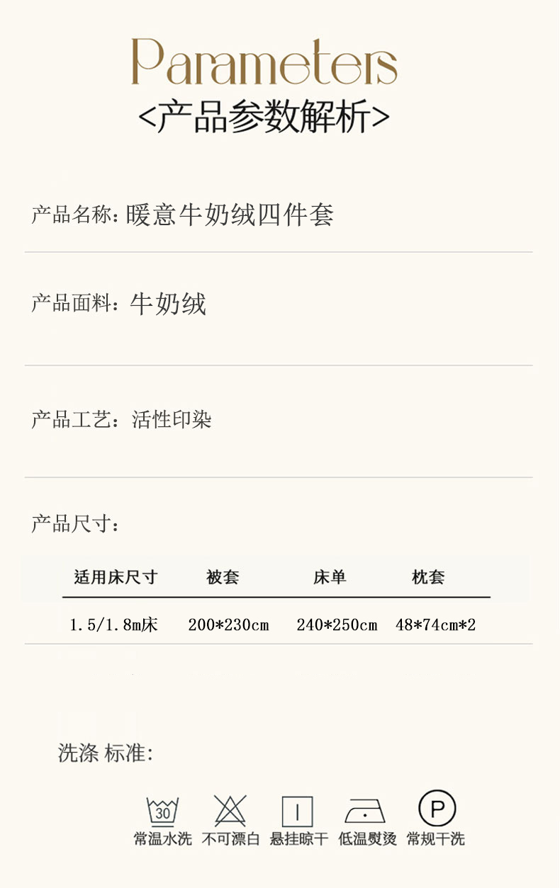 被套:200*230cm 床单:240*250cm 枕套:48*74cm*2 面料:牛奶绒 ▶牛奶绒面料,享温暖,用身体去感触。 ▶牛奶绒面料质地蓬松,透气性好,温暖舒适,云朵般细腻。