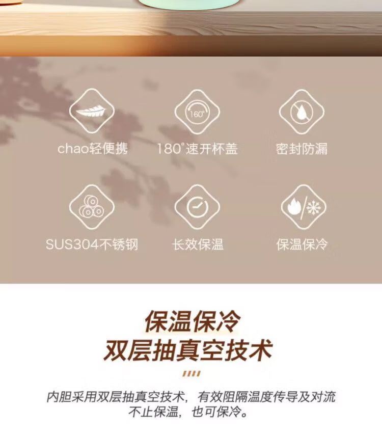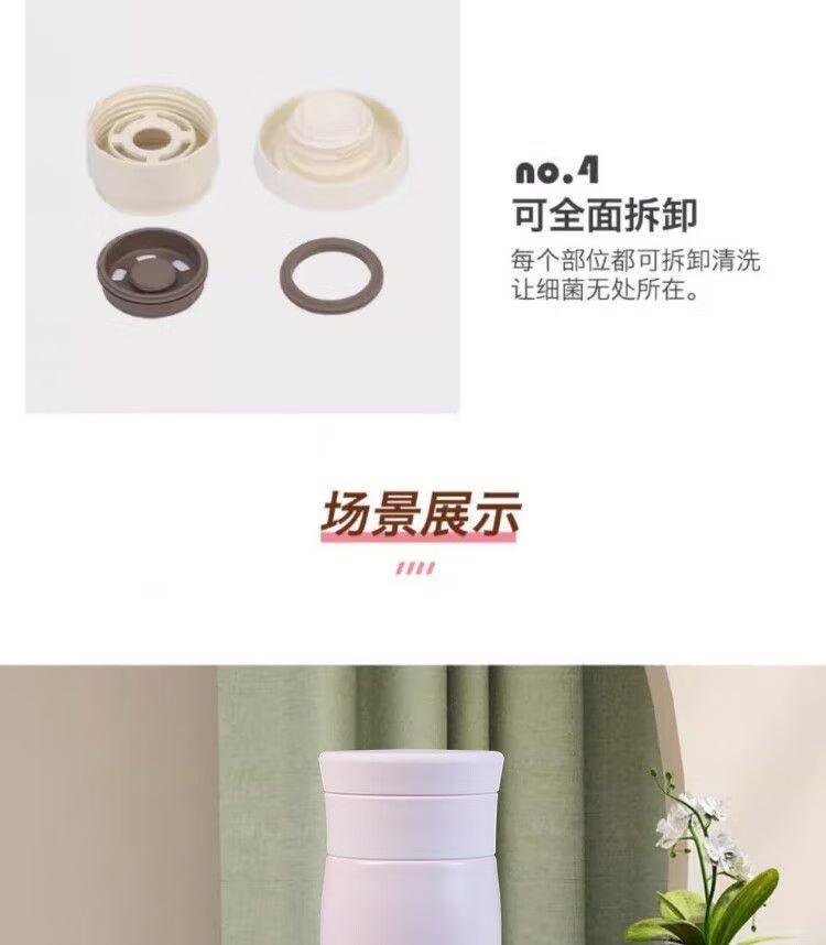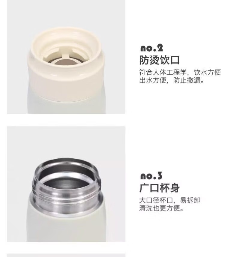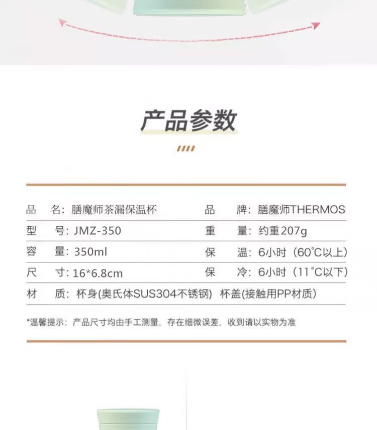 颜 色: WH白色 /MBK黑色/GR绿色/PL粉紫色/LC藕粉/OR红色 容 量:350毫升 保温效力:68℃以上/6小时 保冷效力:10C以下(6小时) 外管材质:304不锈钢 内管材质:304不锈钢 密封圈:食品级硅胶 杯盖材质:食品级PP 【480毫升和600毫升具体详询】