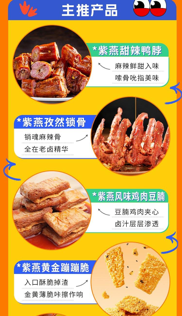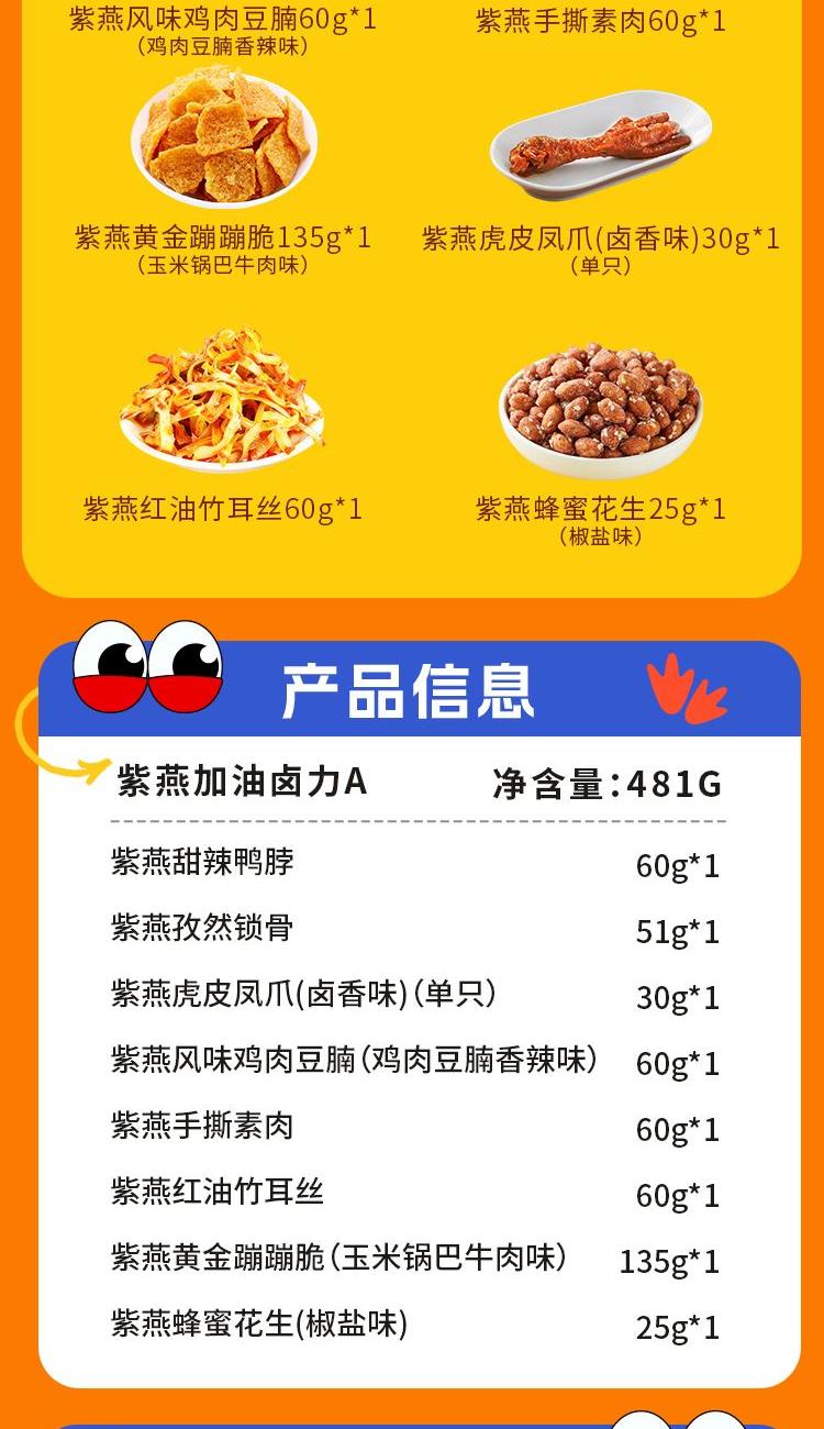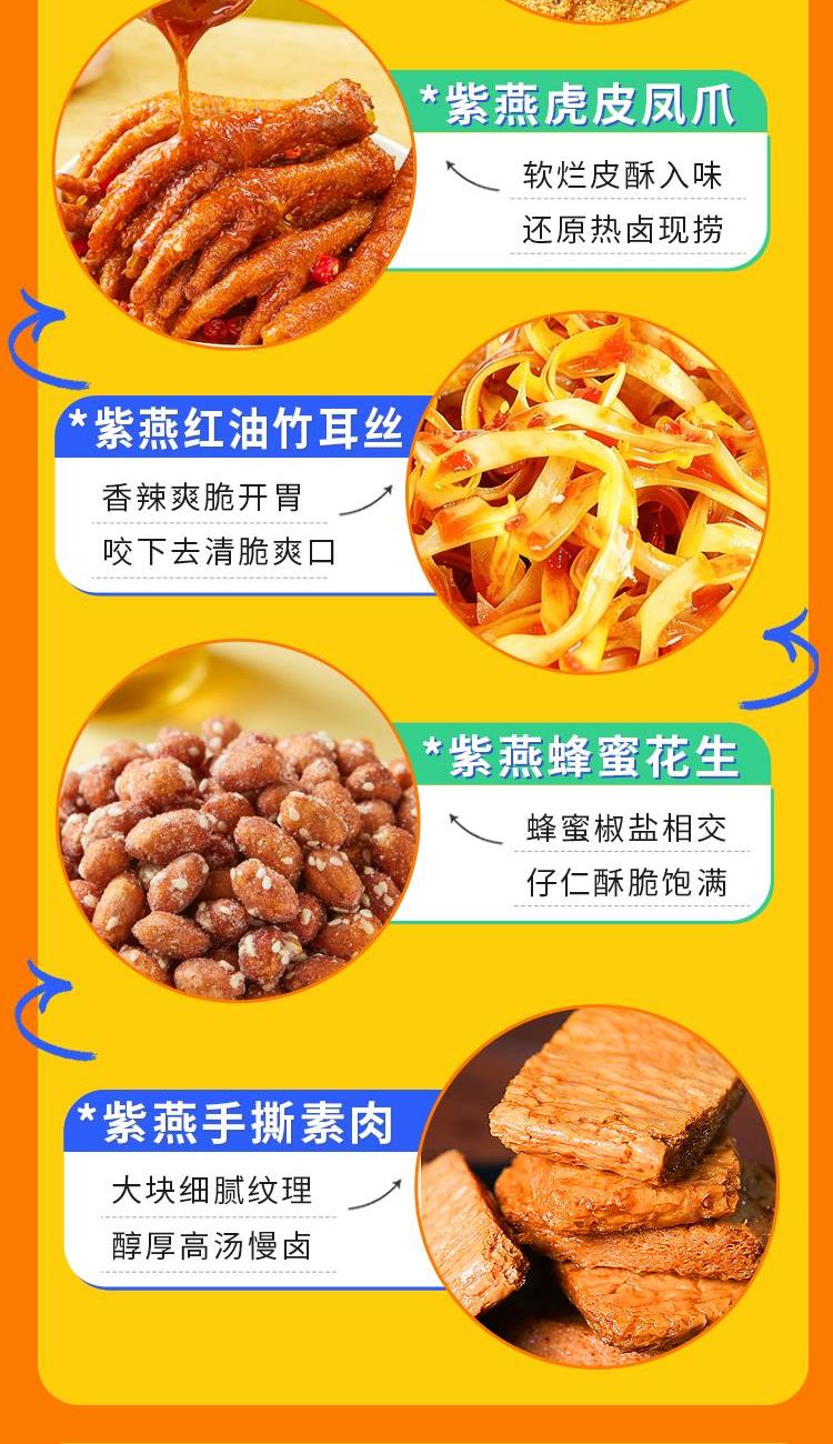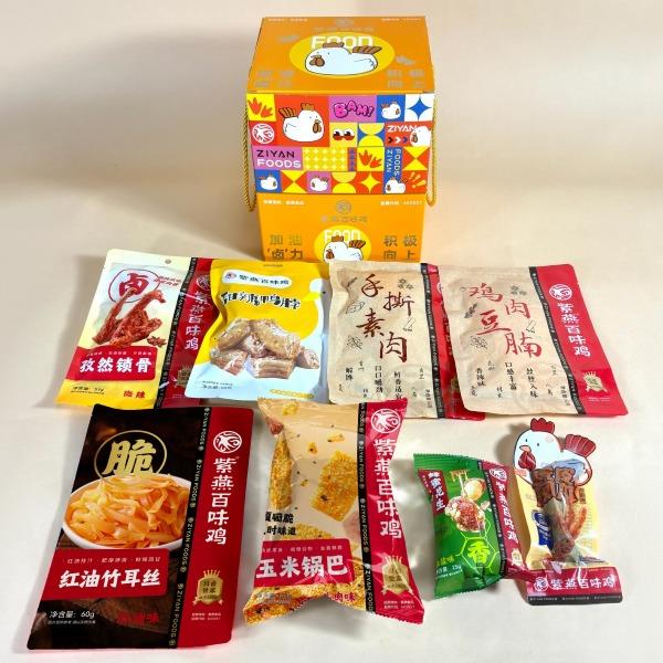 紫燕甜辣鸭脖60g*1 紫燕孜然锁骨51g*1 紫燕虎皮凤爪(卤香味)(单只)30g*1 紫燕风味鸡肉豆腩(鸡肉豆腩香辣味)60g*1 紫燕手撕素肉60g*1 紫燕红油竹耳丝60g*1 紫燕黄金蹦蹦脆(玉米锅巴牛肉味)135g*1 紫燕蜂蜜花生(椒盐味)25g*1 礼盒+组装+外盒