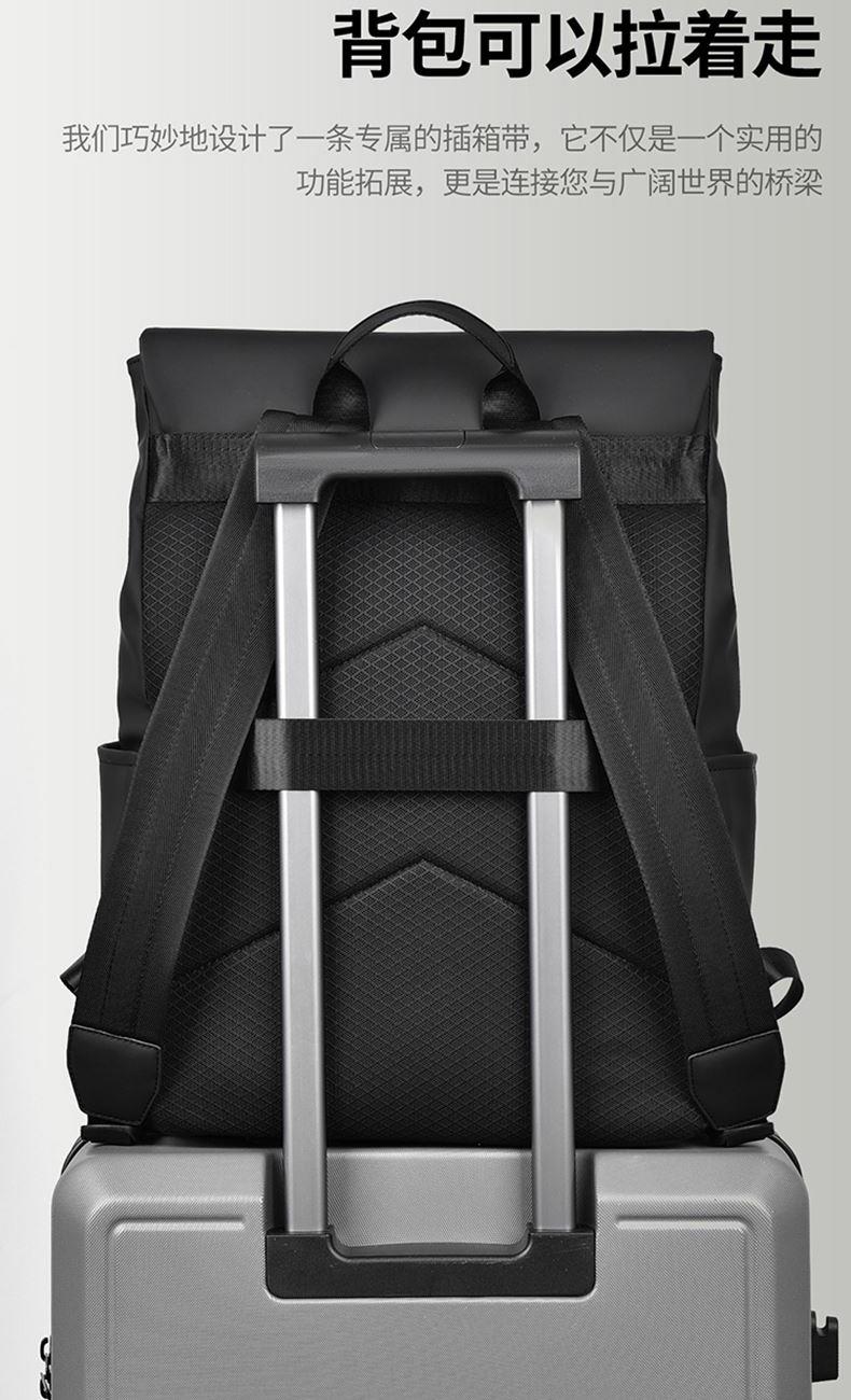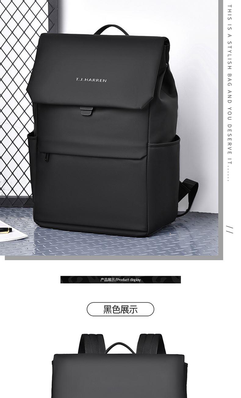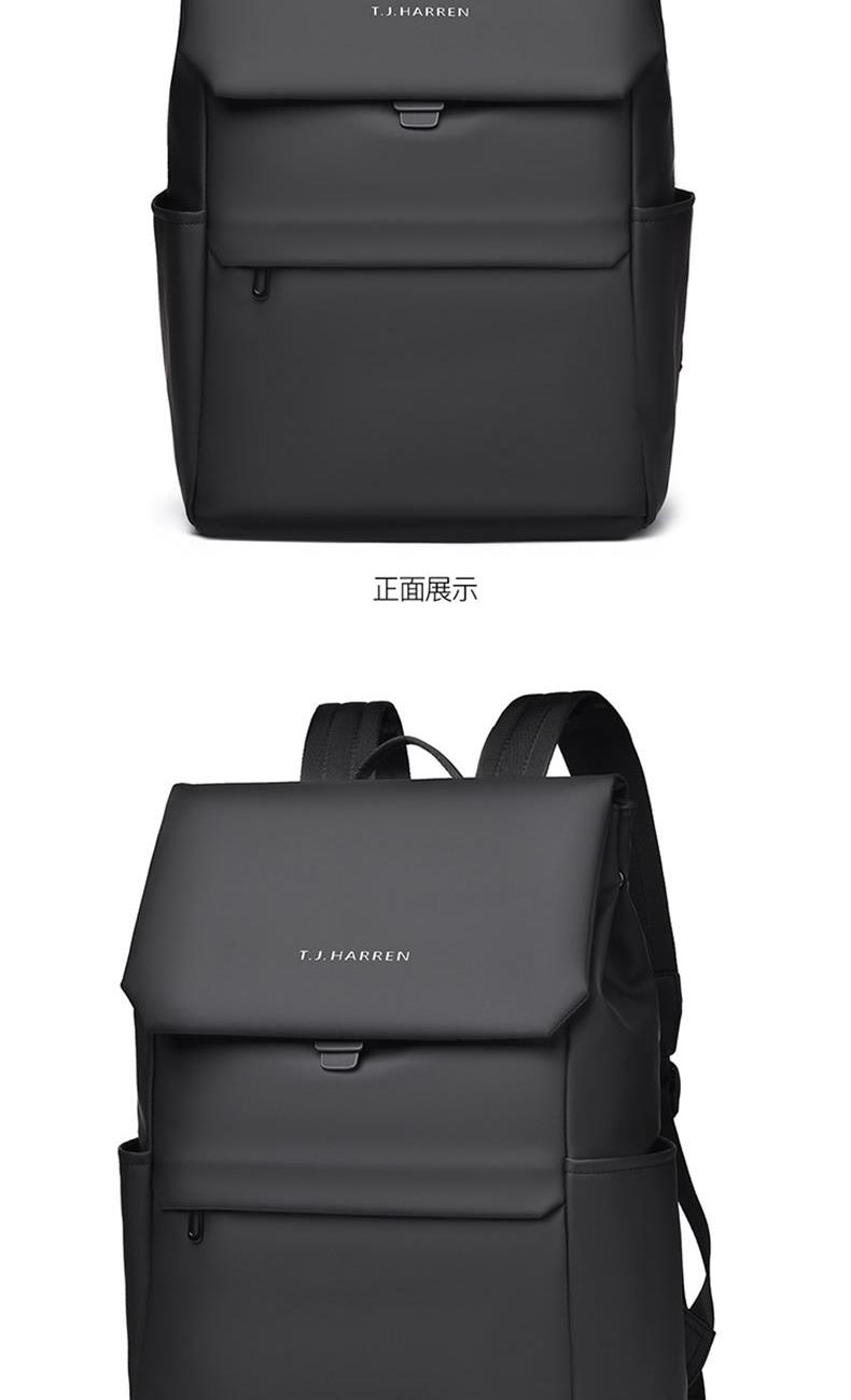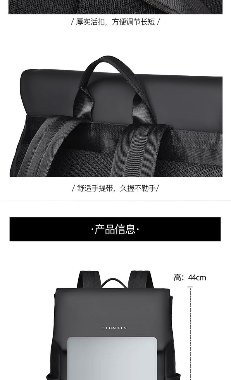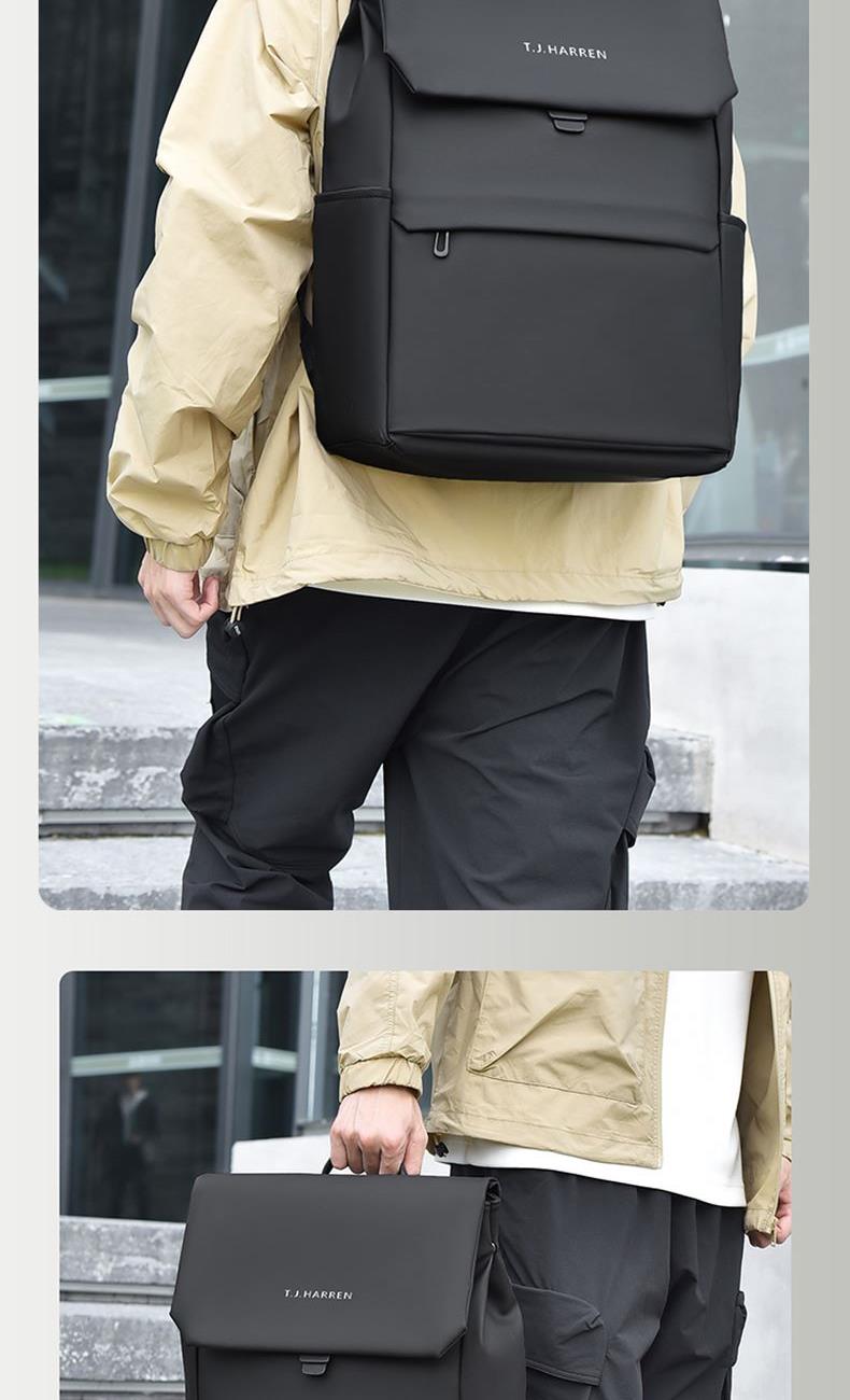 型号:TJ8512 颜色:黑色 尺寸:约45*15*31CM 容量:约20L 面料:柔性防水皮膜织物 里料:织物 重量:约0.78KG 等级:一等合格品 执行标准:QB/T 1333-2018 产品特点: 1、新款多功能设计,时尚大方,旅行休闲商务三用;2、柔性防水皮膜面料,一擦即干,轻松打理;3、多隔层结构,分区合理,轻松收纳;4、主袋约20L大容量,装的更多;5、独立加棉加厚电脑隔层袋,可放置15.6寸电脑;6、前置拉链袋、侧袋及内置袋,放置贴身物品;7、拉杆固定束带设计,解放双手;8、透气背负系统,配合加大加厚提手与肩带,可背可提、透气干爽,舒适减压出行;9、支持客户定制。