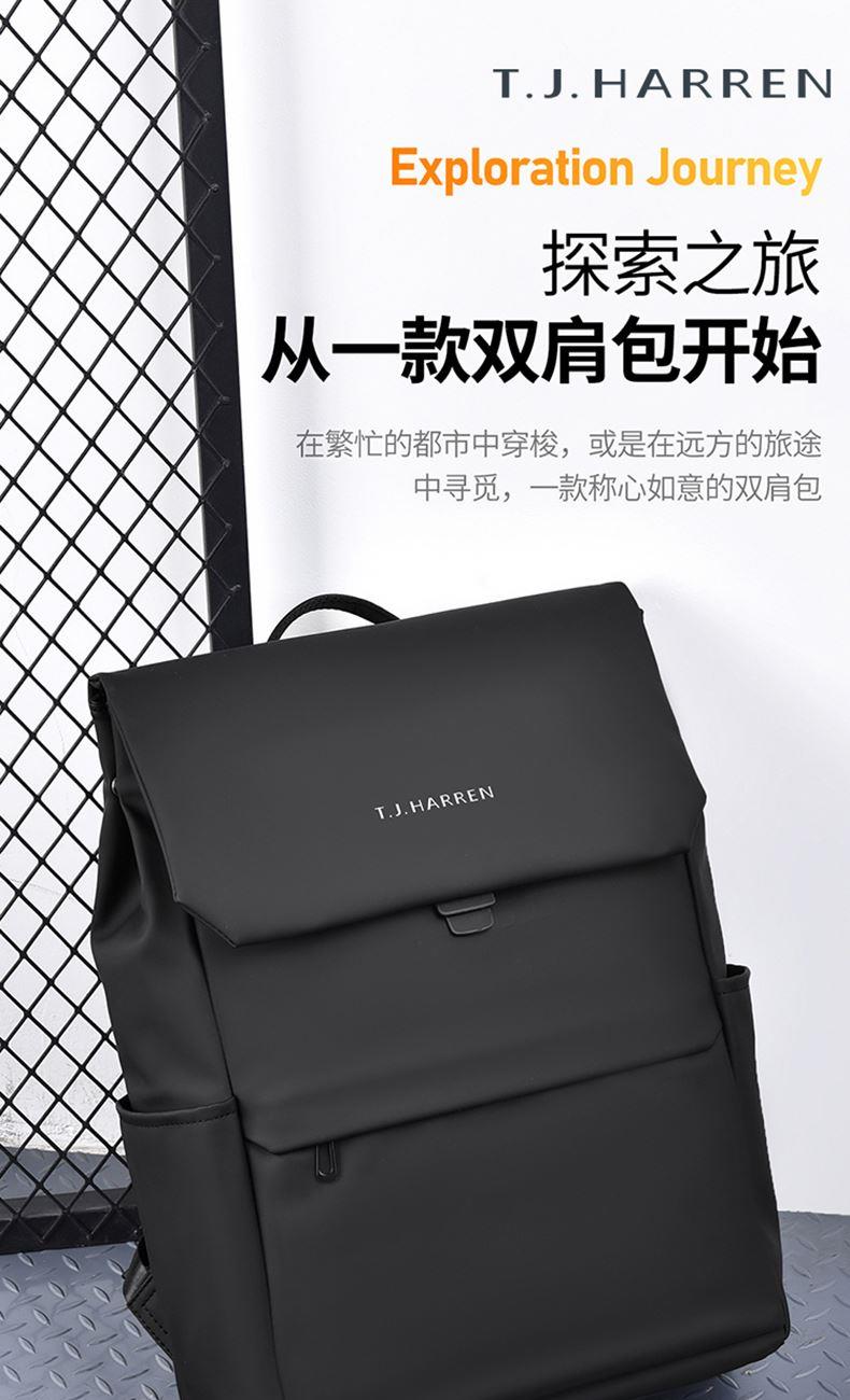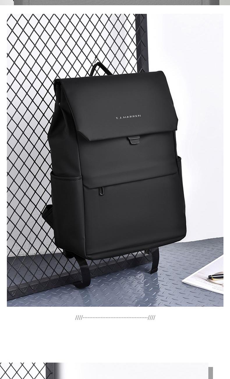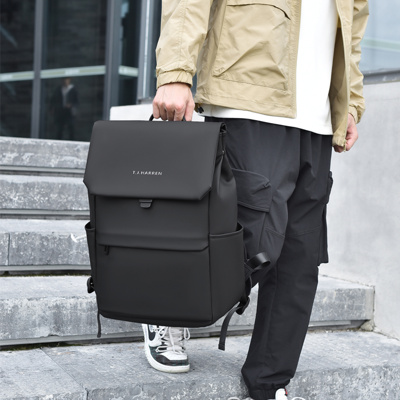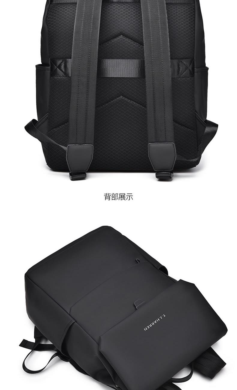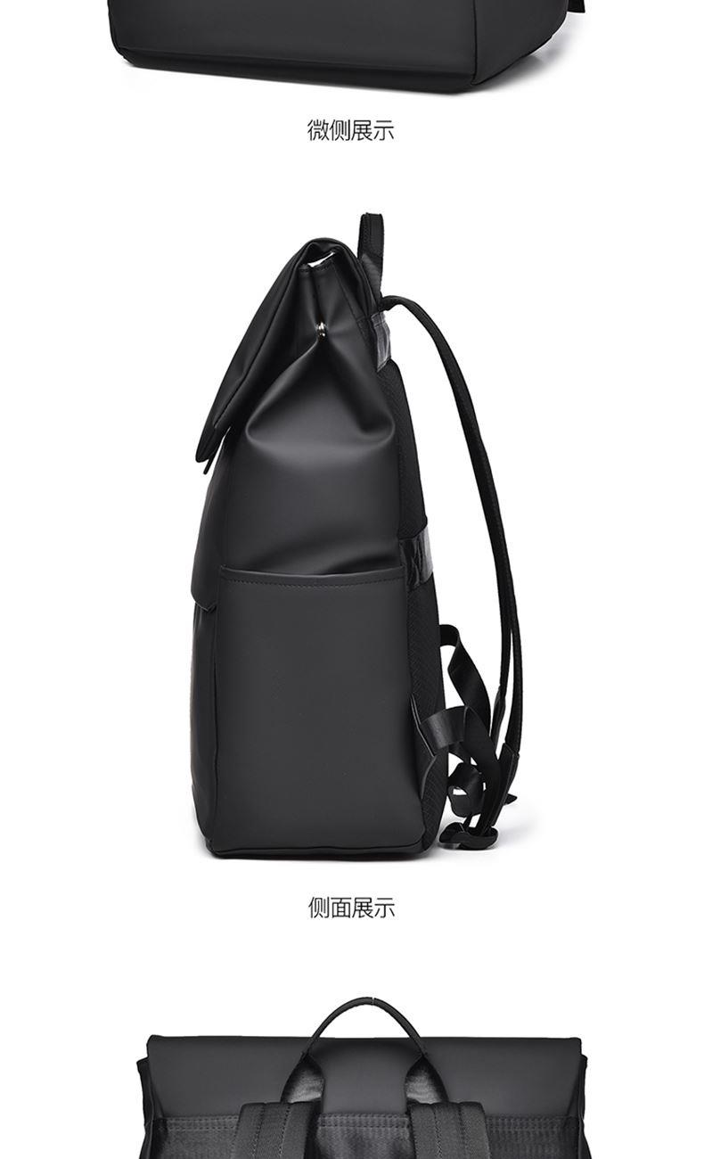 型号:TJ8512 颜色:黑色 尺寸:约45*15*31CM 容量:约20L 面料:柔性防水皮膜织物 里料:织物 重量:约0.78KG 等级:一等合格品 执行标准:QB/T 1333-2018 产品特点: 1、新款多功能设计,时尚大方,旅行休闲商务三用;2、柔性防水皮膜面料,一擦即干,轻松打理;3、多隔层结构,分区合理,轻松收纳;4、主袋约20L大容量,装的更多;5、独立加棉加厚电脑隔层袋,可放置15.6寸电脑;6、前置拉链袋、侧袋及内置袋,放置贴身物品;7、拉杆固定束带设计,解放双手;8、透气背负系统,配合加大加厚提手与肩带,可背可提、透气干爽,舒适减压出行;9、支持客户定制。