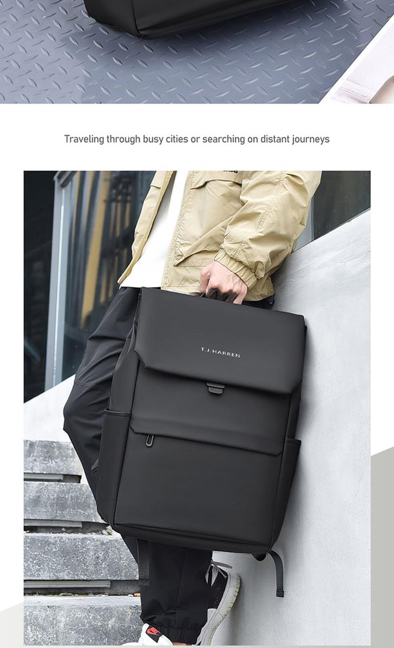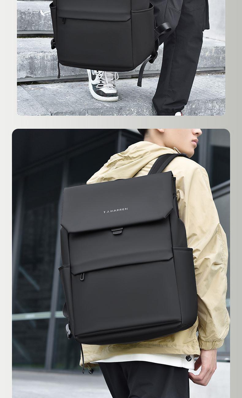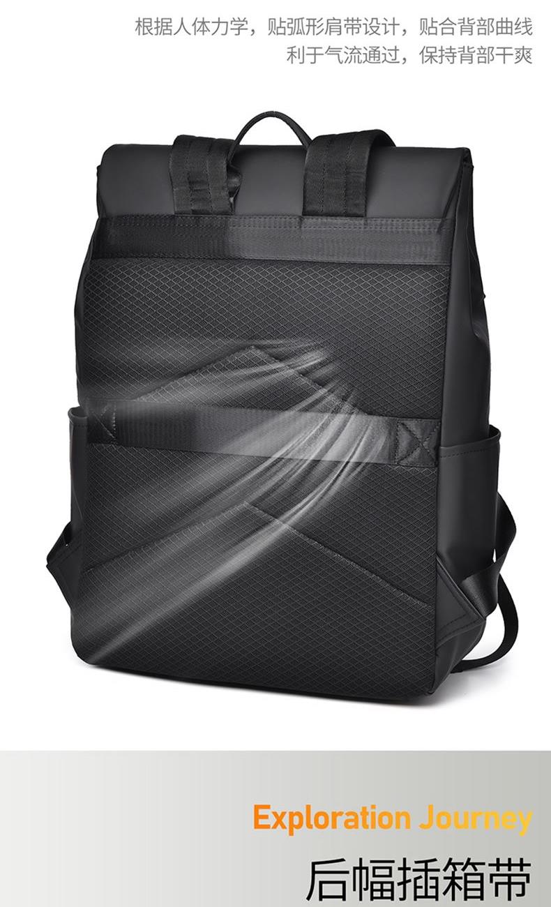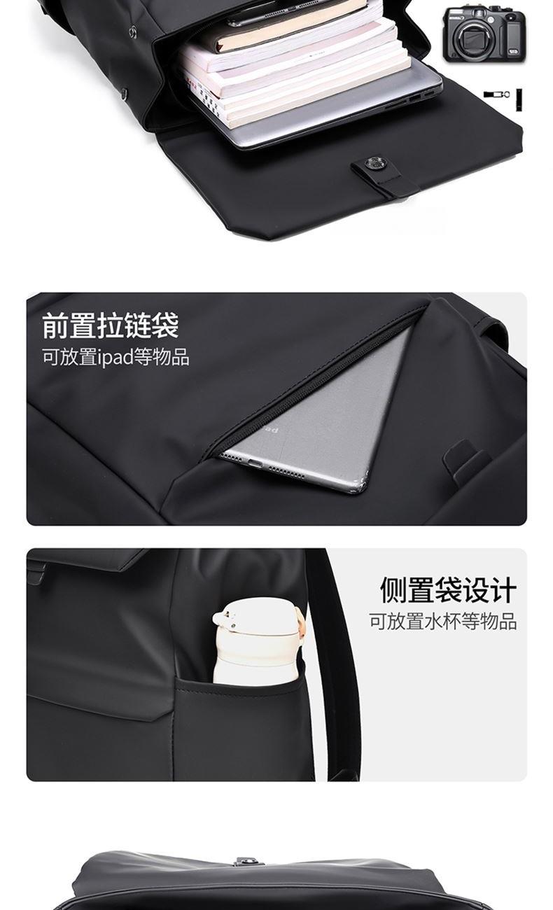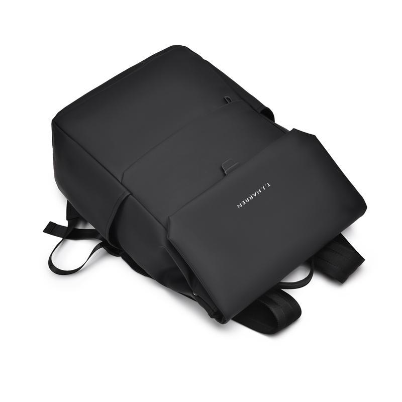 型号:TJ8512 颜色:黑色 尺寸:约45*15*31CM 容量:约20L 面料:柔性防水皮膜织物 里料:织物 重量:约0.78KG 等级:一等合格品 执行标准:QB/T 1333-2018 产品特点: 1、新款多功能设计,时尚大方,旅行休闲商务三用;2、柔性防水皮膜面料,一擦即干,轻松打理;3、多隔层结构,分区合理,轻松收纳;4、主袋约20L大容量,装的更多;5、独立加棉加厚电脑隔层袋,可放置15.6寸电脑;6、前置拉链袋、侧袋及内置袋,放置贴身物品;7、拉杆固定束带设计,解放双手;8、透气背负系统,配合加大加厚提手与肩带,可背可提、透气干爽,舒适减压出行;9、支持客户定制。