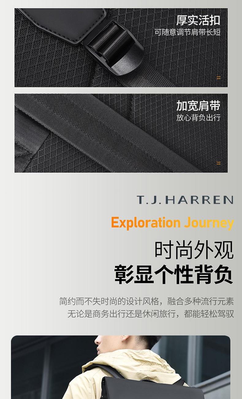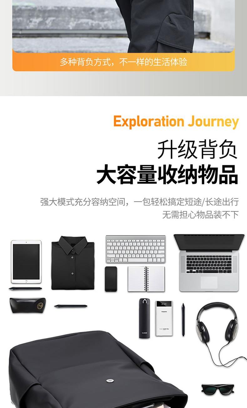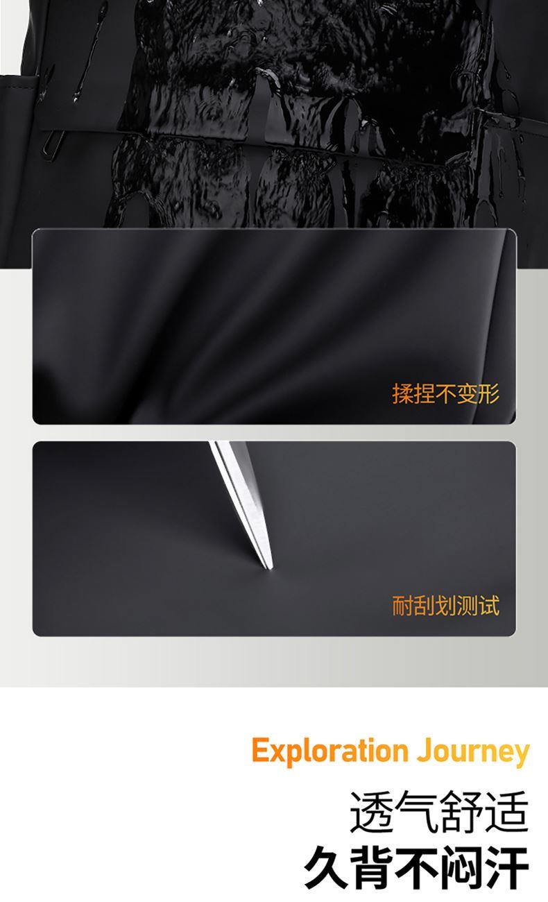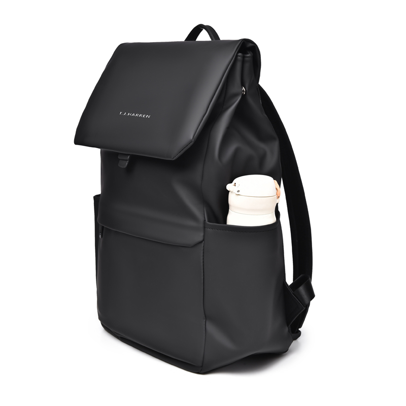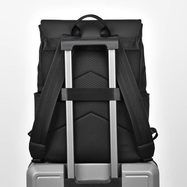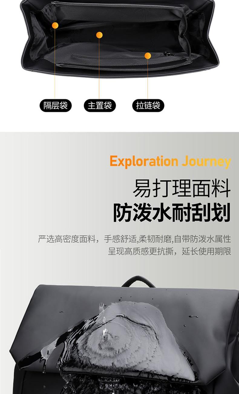 型号:TJ8512 颜色:黑色 尺寸:约45*15*31CM 容量:约20L 面料:柔性防水皮膜织物 里料:织物 重量:约0.78KG 等级:一等合格品 执行标准:QB/T 1333-2018 产品特点: 1、新款多功能设计,时尚大方,旅行休闲商务三用;2、柔性防水皮膜面料,一擦即干,轻松打理;3、多隔层结构,分区合理,轻松收纳;4、主袋约20L大容量,装的更多;5、独立加棉加厚电脑隔层袋,可放置15.6寸电脑;6、前置拉链袋、侧袋及内置袋,放置贴身物品;7、拉杆固定束带设计,解放双手;8、透气背负系统,配合加大加厚提手与肩带,可背可提、透气干爽,舒适减压出行;9、支持客户定制。