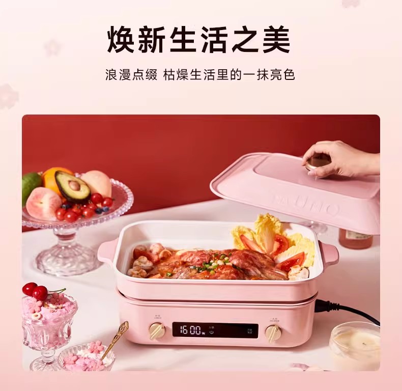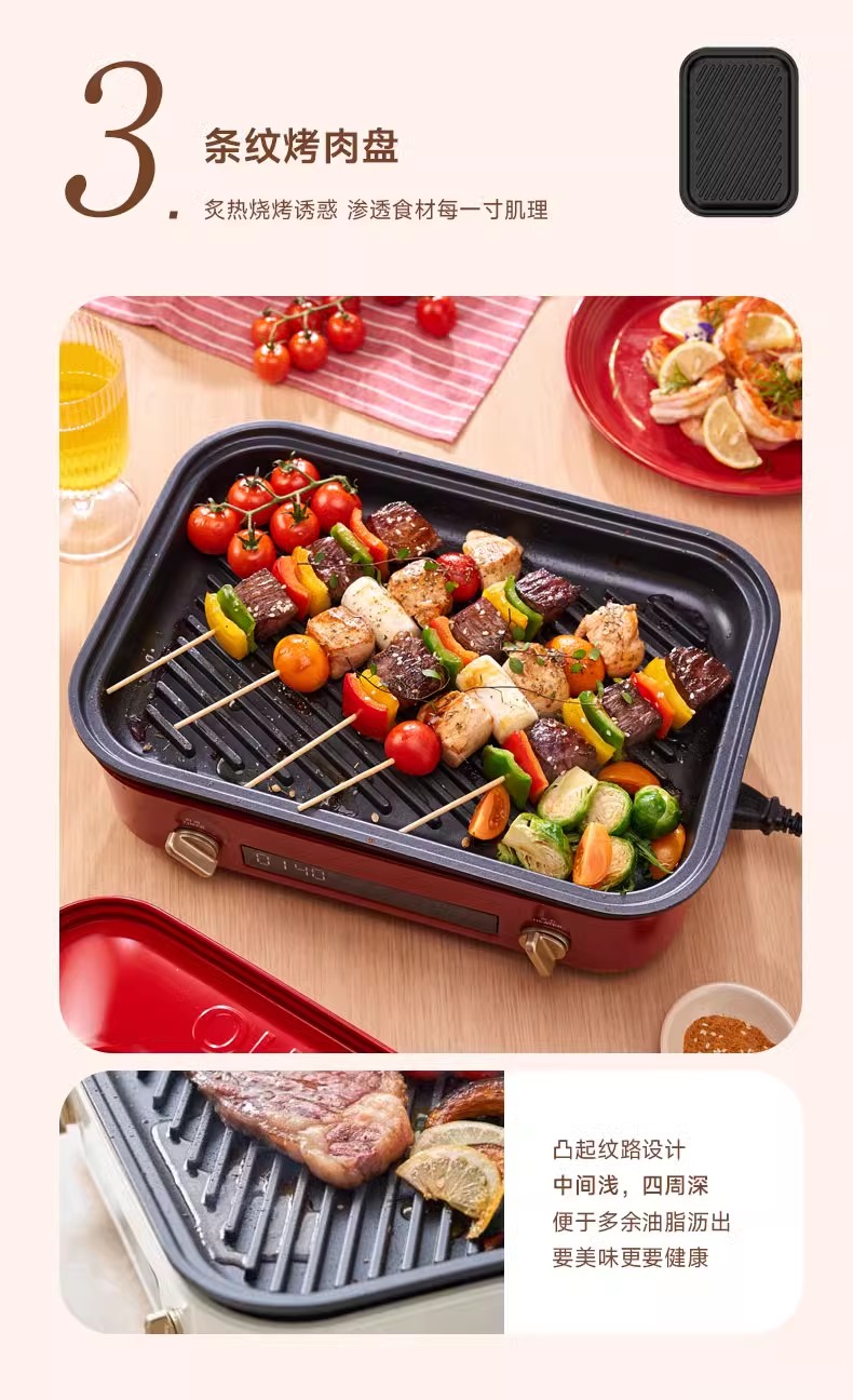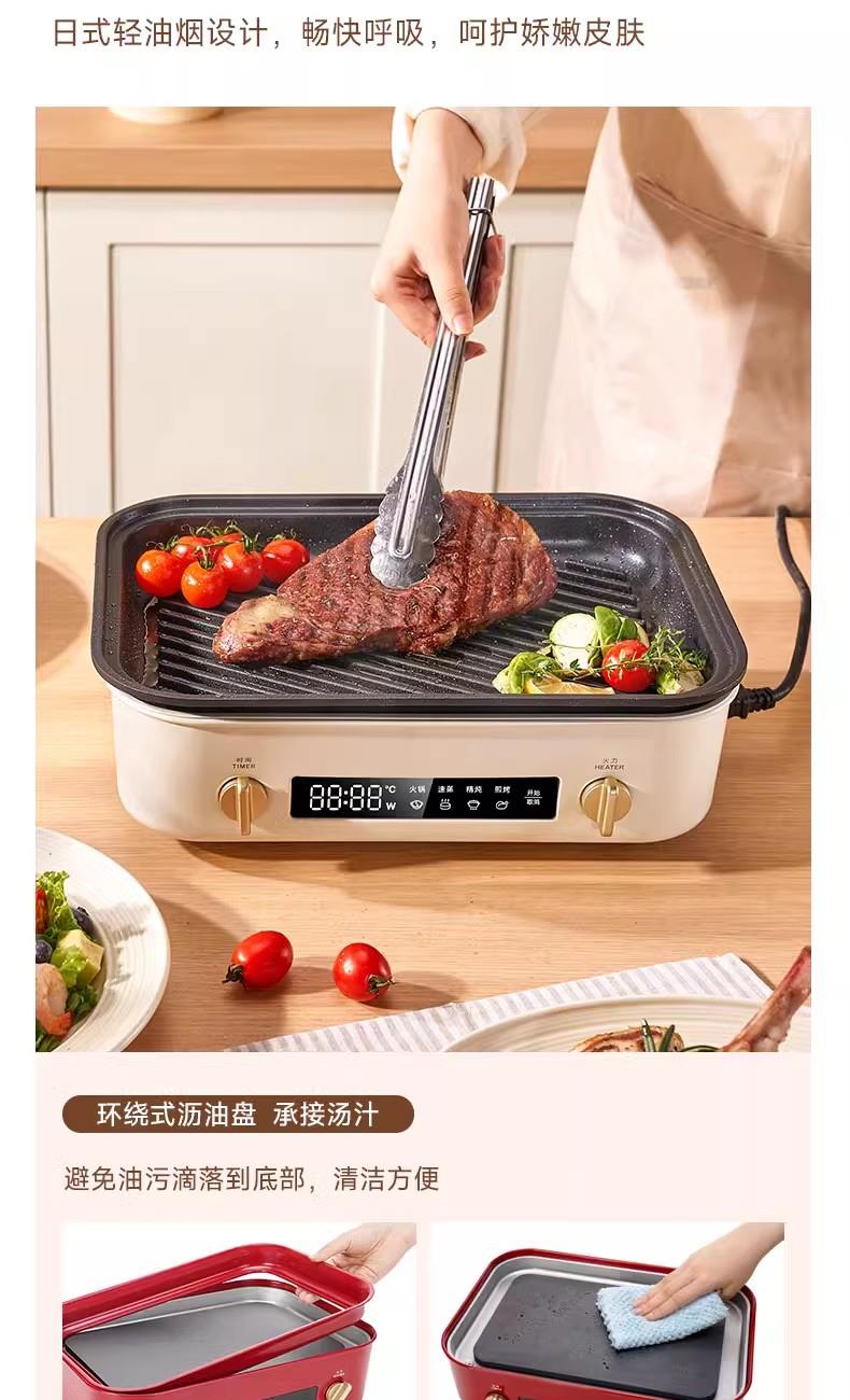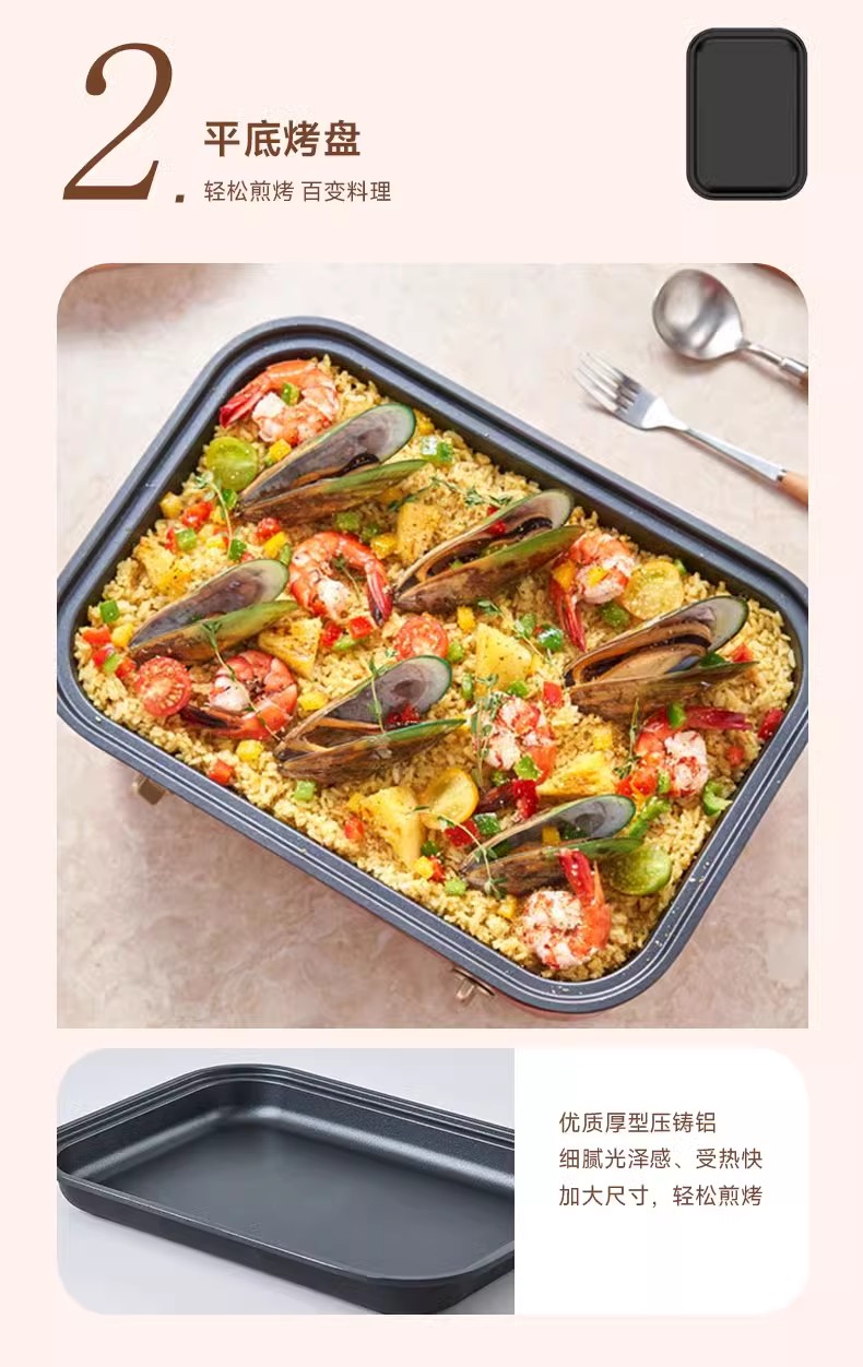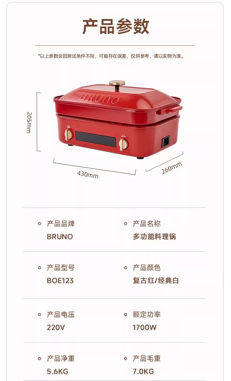 产品型号:BOE123 产品颜色:粉色 产品电压:220V 额定功率:1700W 产品净重:约6.2KG 产品毛重:7.6KG 产品尺寸:约430*260*205mm 标配:标配配件:深锅、不锈钢蒸架、条纹烤盘