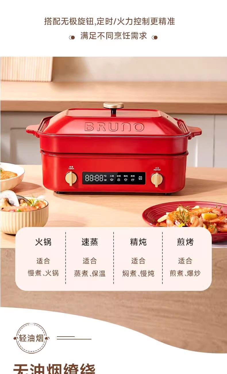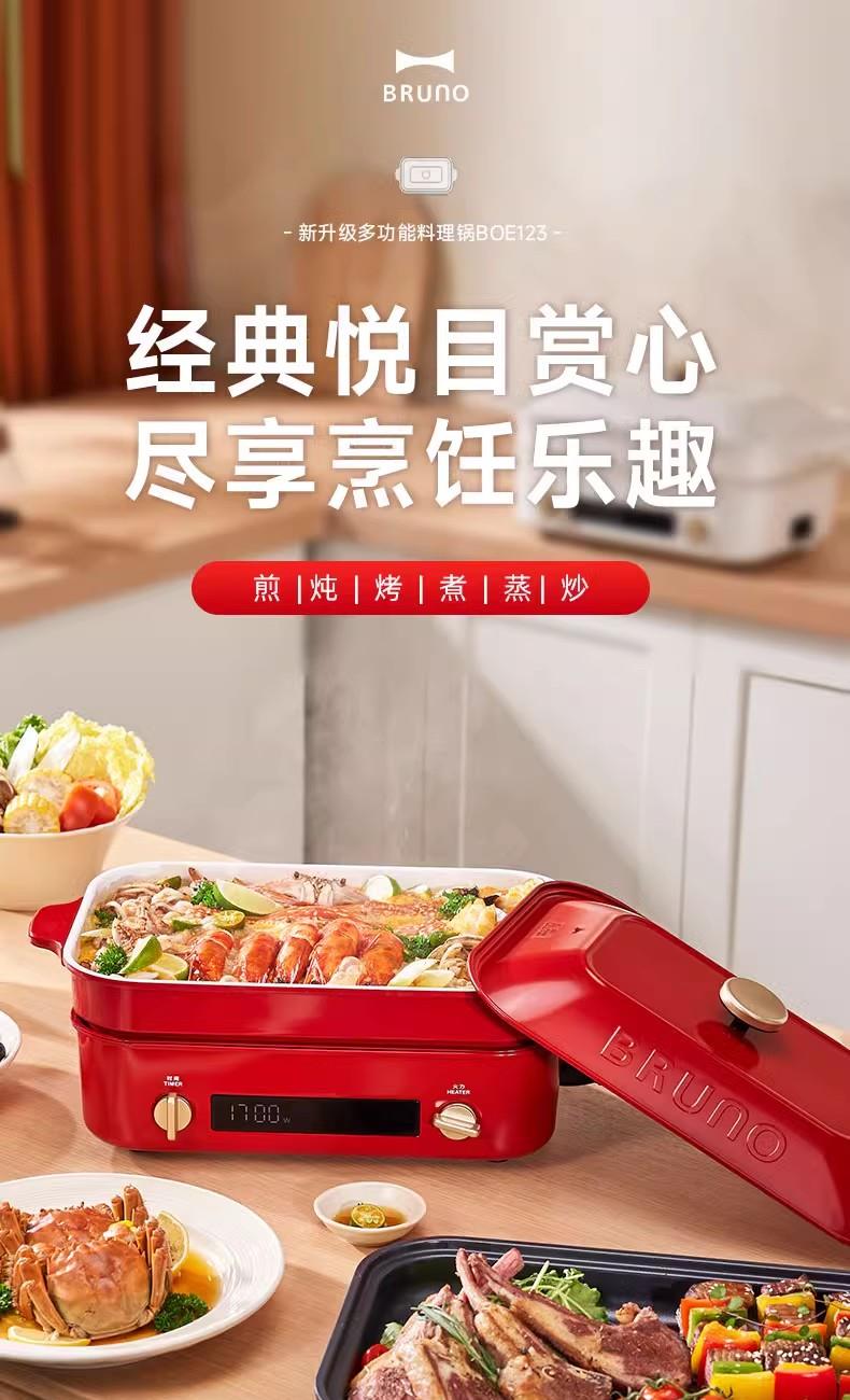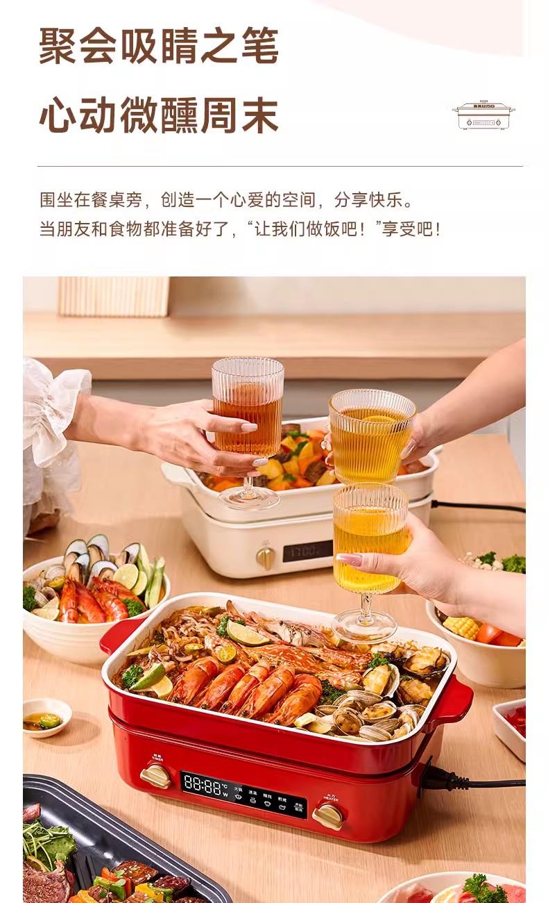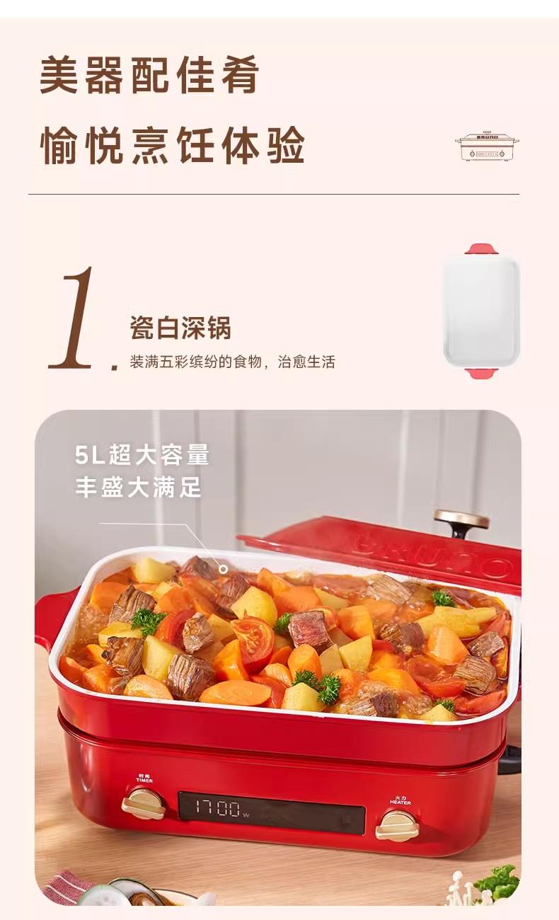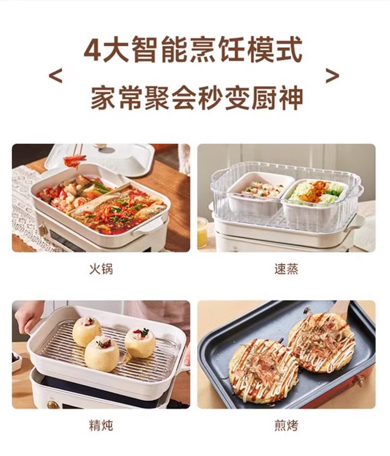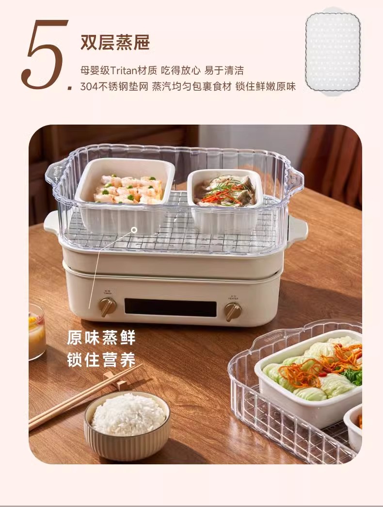 产品型号:BOE123 产品颜色:粉色 产品电压:220V 额定功率:1700W 产品净重:约6.2KG 产品毛重:7.6KG 产品尺寸:约430*260*205mm 标配:标配配件:深锅、不锈钢蒸架、条纹烤盘