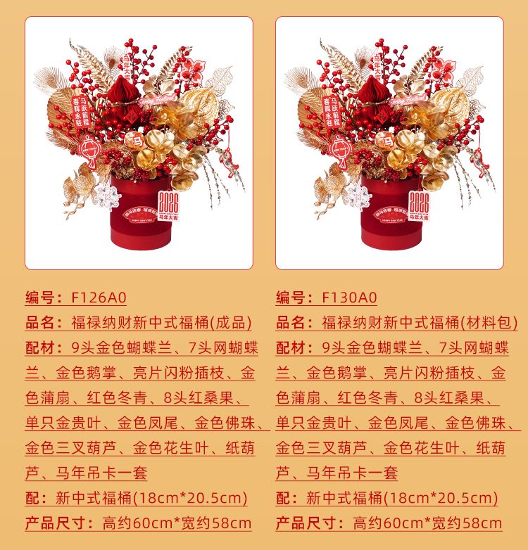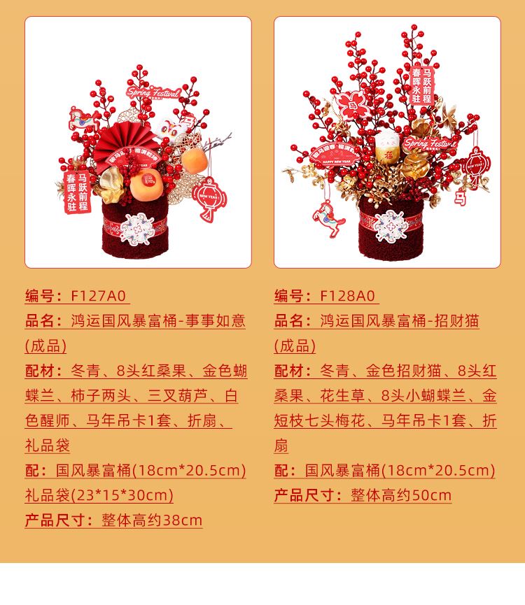 产品:马上发财福桶-折扇款 编码;F122A0 规格: 桶:15.5*12CM 年宵花整体高度60cm 冬青、金色蒲扇、金色红掌、金色百合、金色髙枝七头梅花、8头红桑果、马年吊卡1套、折扇
