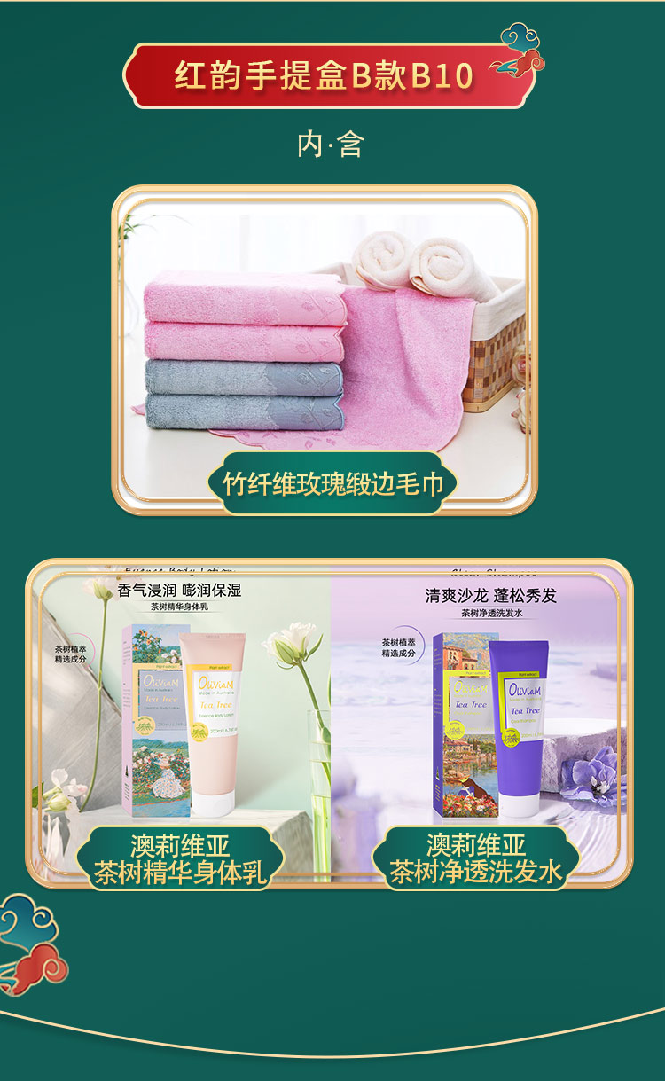 内含: OLIVIAM澳莉维亚茶树净透洗发水*1 OLIVIAM澳莉维亚茶树精华身体乳*1 爱竹人竹纤维玫瑰缎边加厚毛巾*1 澳大利亚原装进口:美妆新品 京东自营5W+销量 2025抖音小红书畅销产品 搭配爱竹人竹纤维毛巾 实用 美观 高颜值 开门红 节日礼品 随手礼 劳保 福利