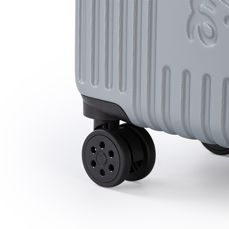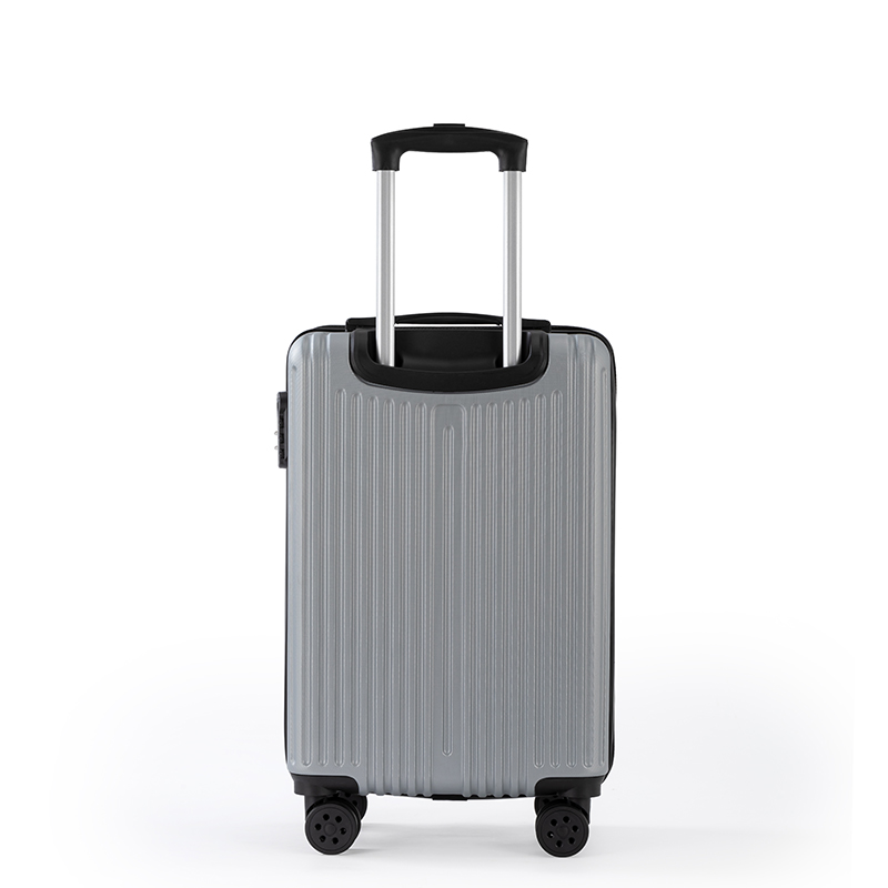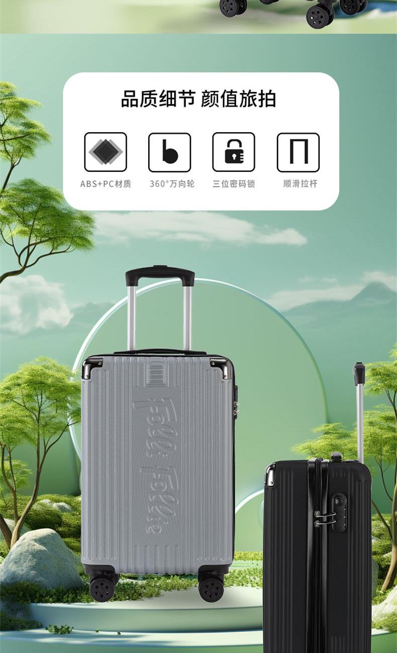 线条硬朗明显,均衡分散受力,增固抗压双重; 顺滑静音,灵活平纹,减震降噪; 安全便捷,稳妥可靠; 材质:ABS+PC 配锁:外置三位密码锁 轮子:双排万向轮 拉杆:合金拉杆 颜色:黑色、银灰色 尺寸:20英寸