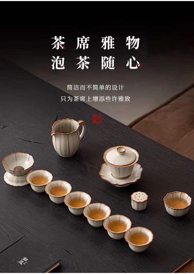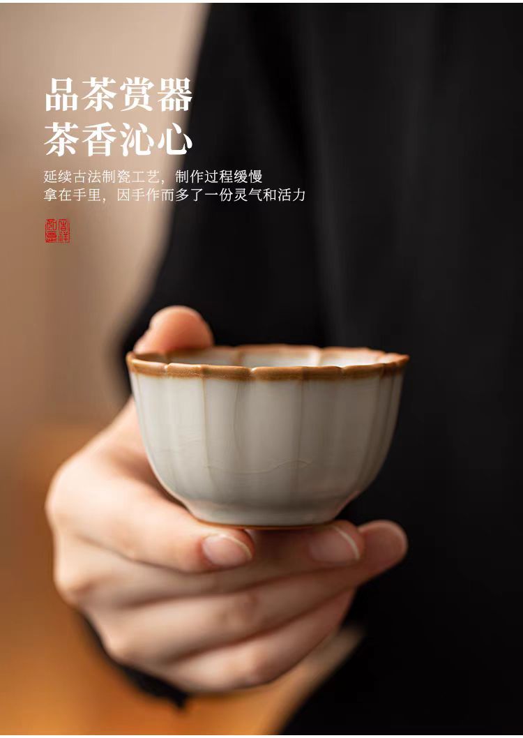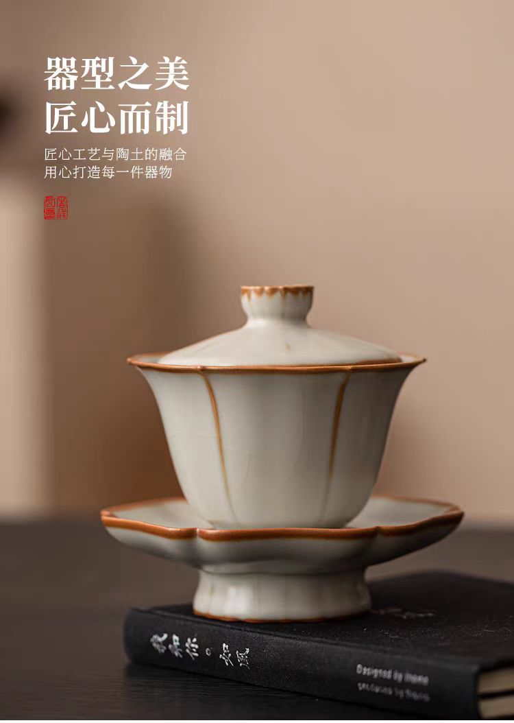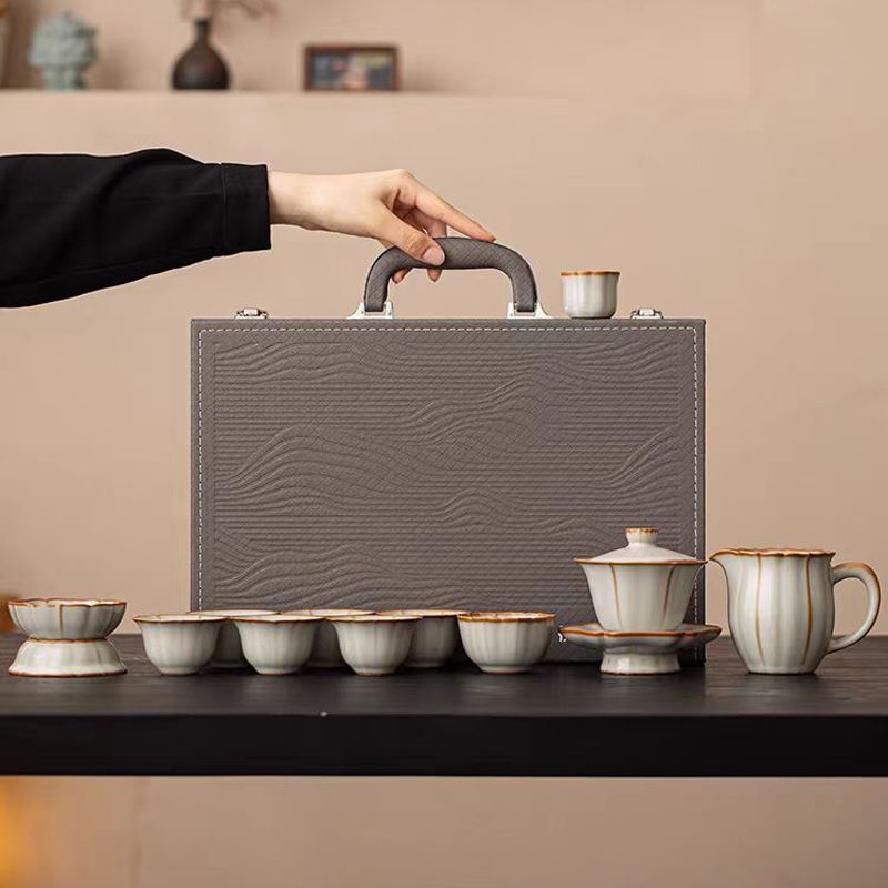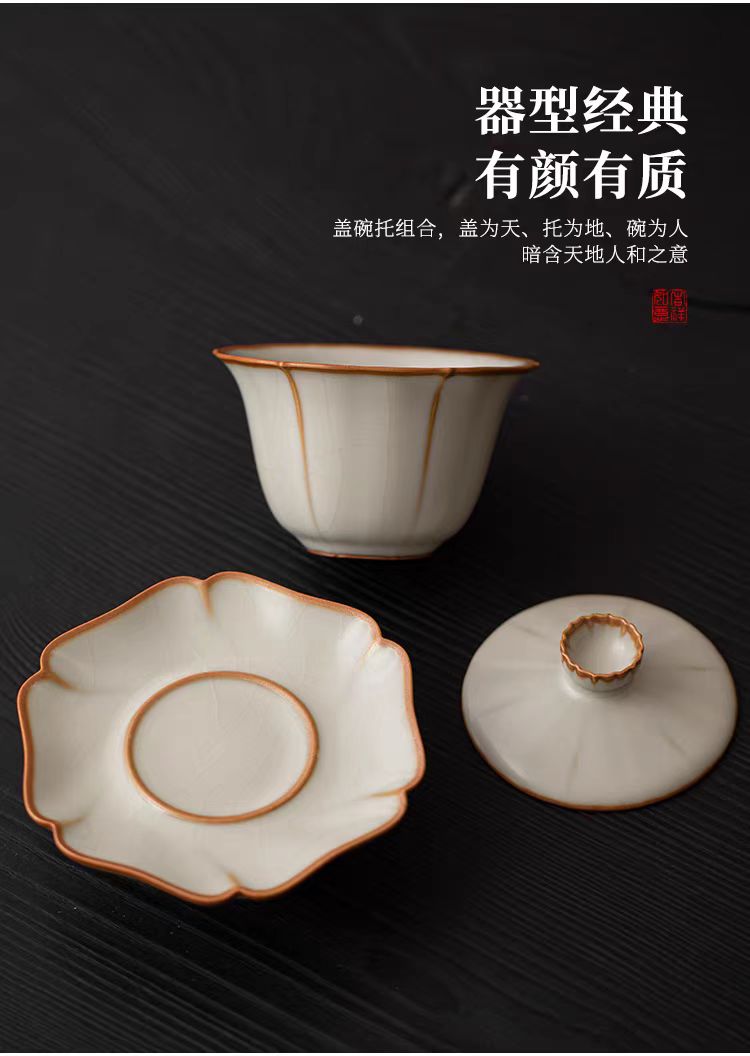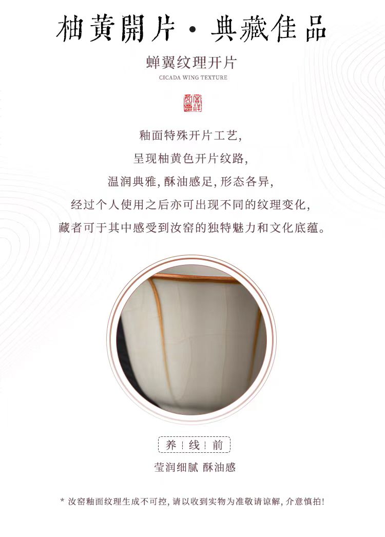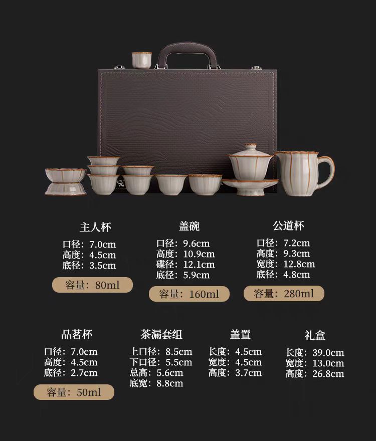 配制:1壶 1盖碗 6杯 1壶承 1主人杯 1公道杯1茶托1茶漏 1皮箱 材质:亚黄汝瓷 规格:盖碗:12.5*11.7cm 杯 7.2*4cm 推荐说明:玛瑙入釉,蝉翼开片。亚黄汝瓷,独技术新品,采用高价优质瓷土,紫口铁足,。立体浮雕杯身。杯身开片,可养瓷