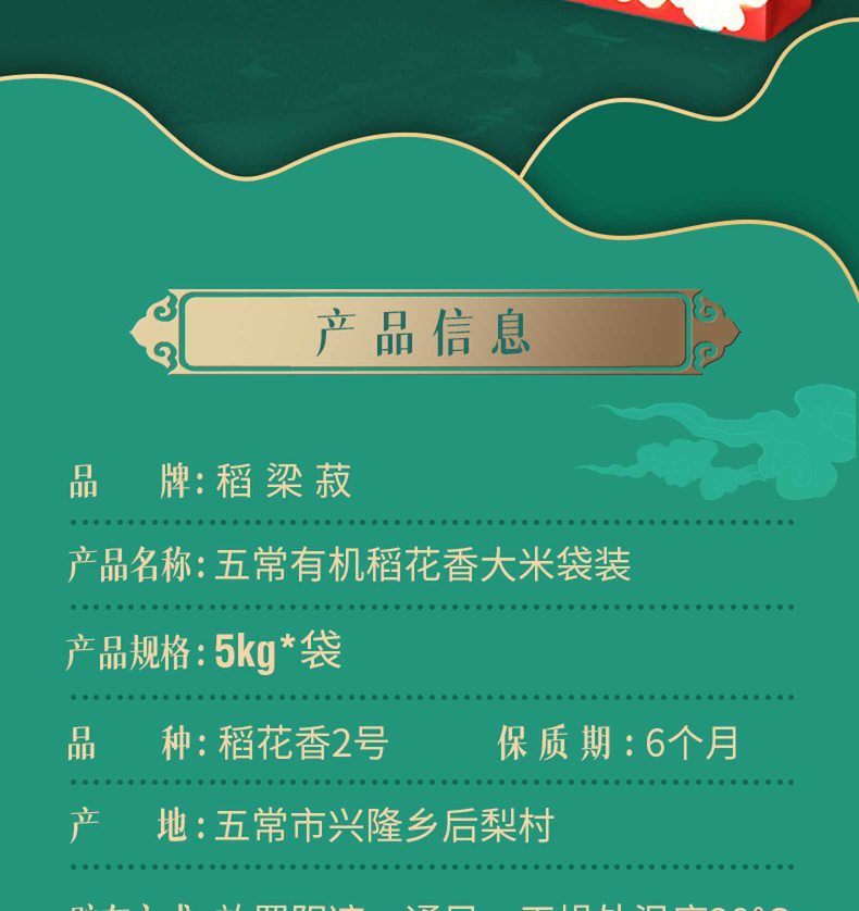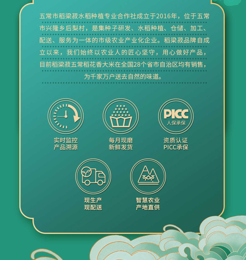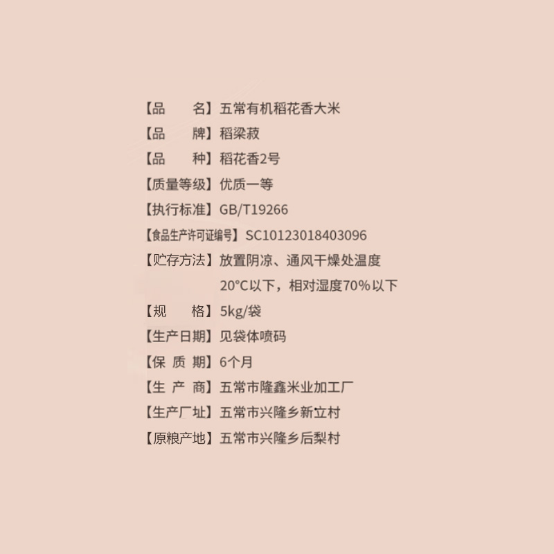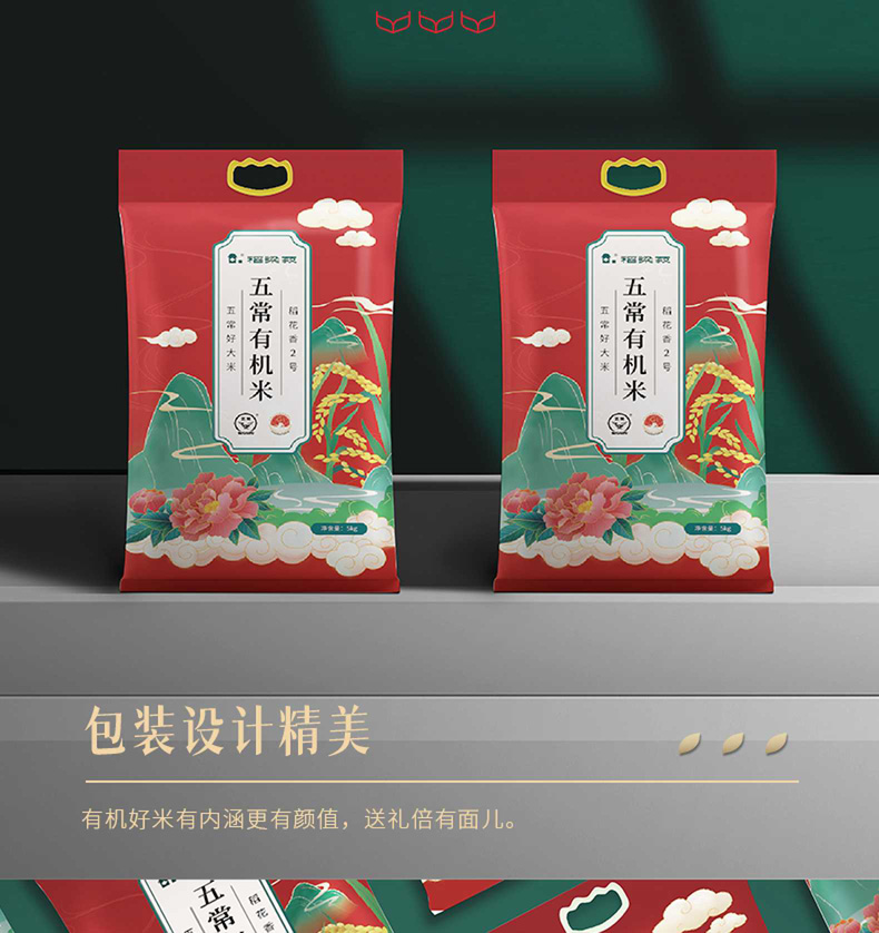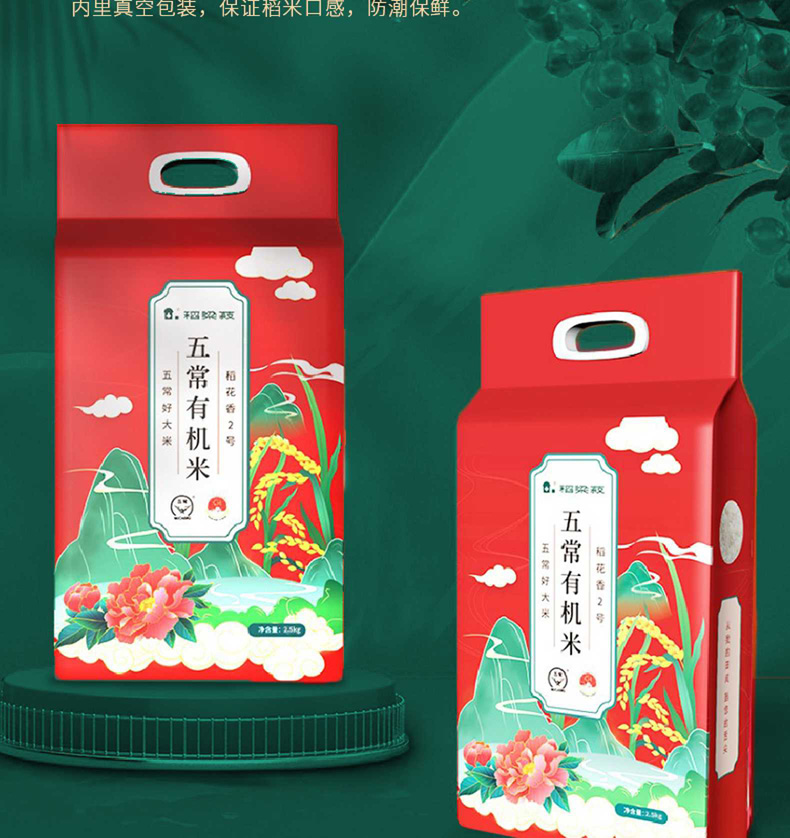 包装:真空袋装 执行标准:GB/T 19266 保质期:6个月质量等级:优质一级 产地:黑龙江五常市 产品尺寸:300mm*240mm*80mm 推荐理由: 1、五常有机稻花香2号米。 2、PICC人保承保产品。 3、稻田24小时实时监控。 4、智慧农业系统。 5、当月现磨新米发货。 6、独立溯源码。 7、双层真空保鲜。