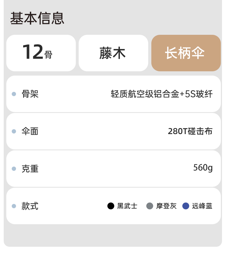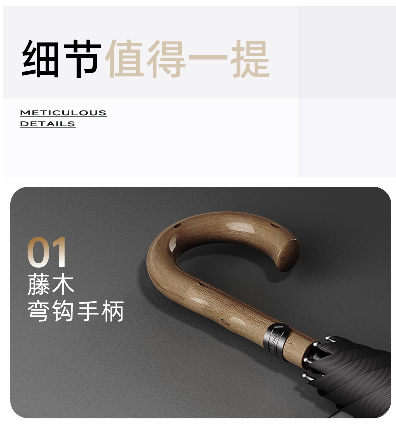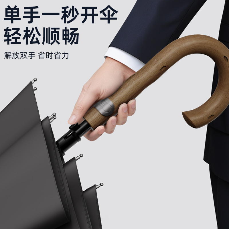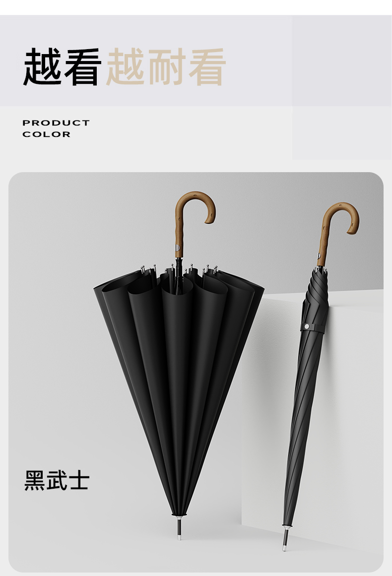 商品货号:ZD2560() 伞架材质:合金钢中棒 玻纤伞架 藤木手柄 伞面材质:280T抨击布 款式:12K半自动长柄伞 商品参数:直径:115cm 高度:92cm 收拢直径:6cm 收拢高度:92cm 商品毛重:560克 商品颜色:黑色 灰色 蓝色 配置及定制:支持伞面logo定制(具体定制费用高另外核算)