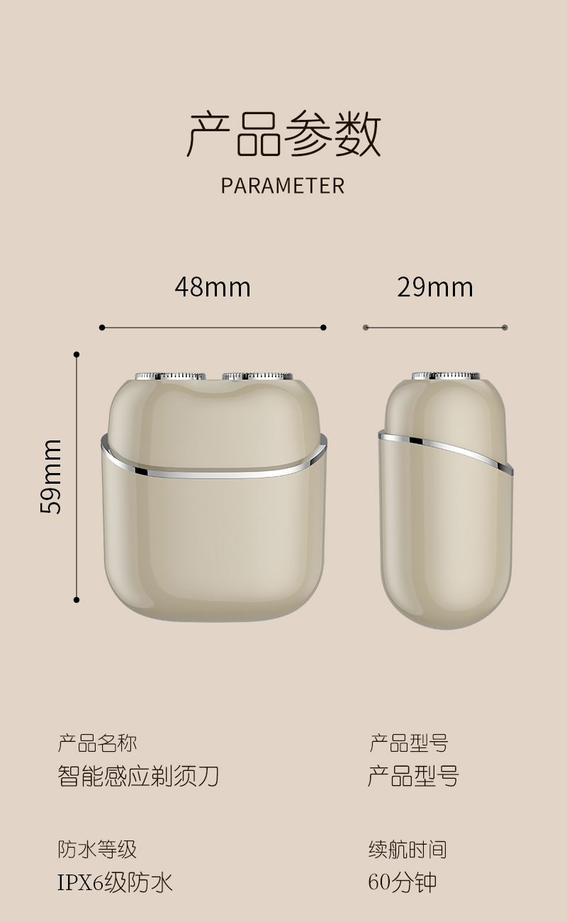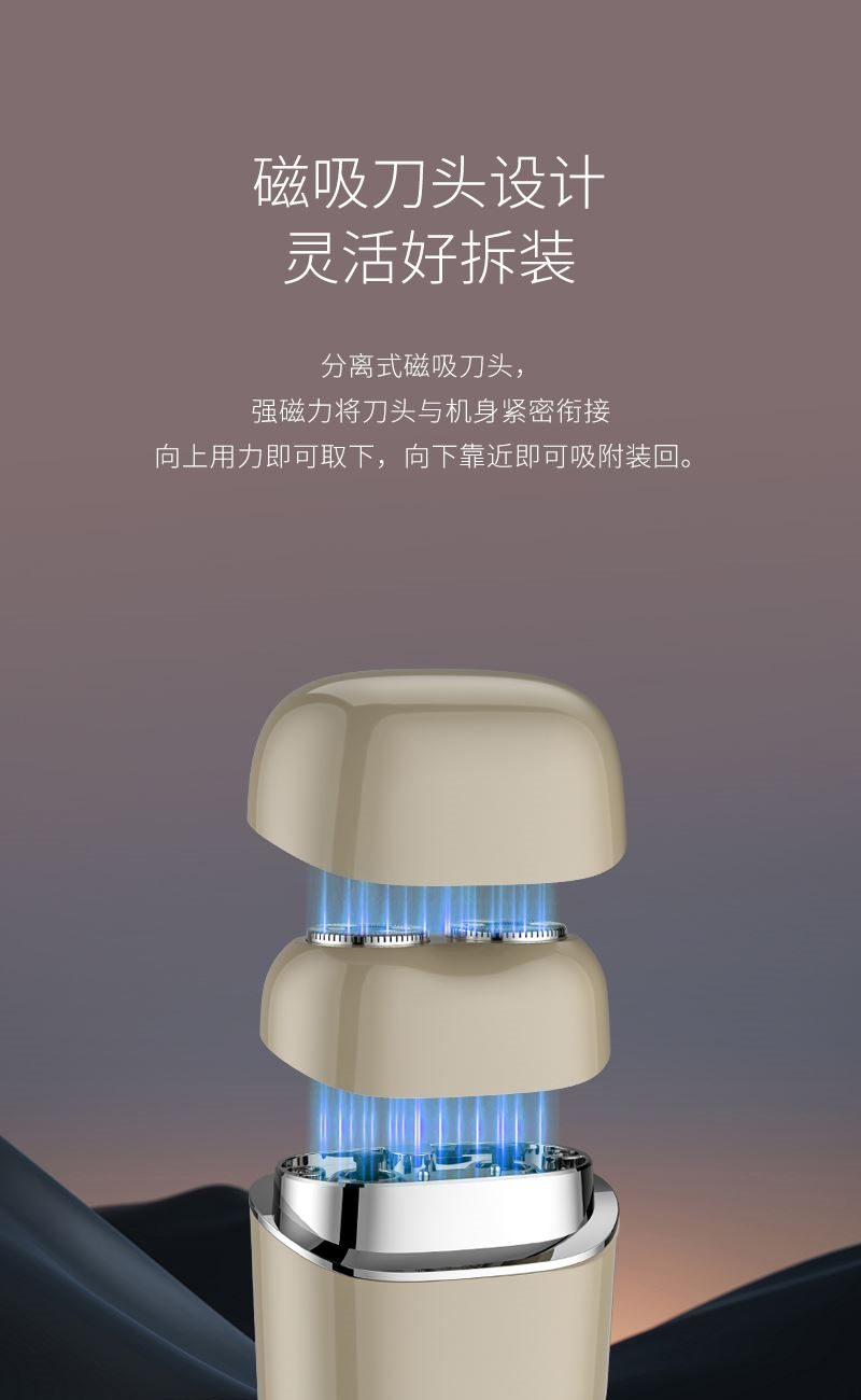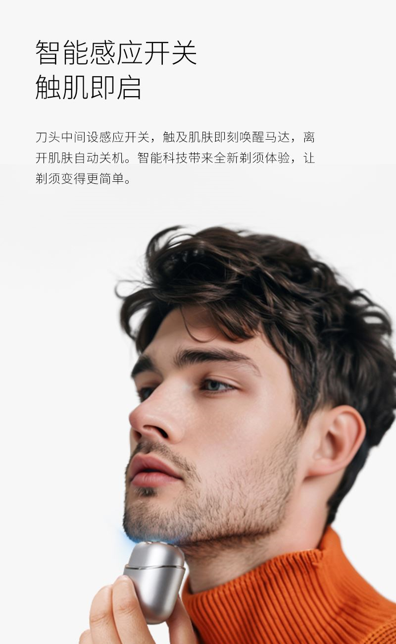 1. 双环弧面刀网,贴合面部舒适剃须; 2. 可分离式磁吸刀头,磁吸刀头拆装便捷; 3. 小巧便携,手掌般大小,携带方便; 4. IPX7全身防水,干湿双剃,水洗无忧; 5. 恒压恒速,稳定运行 减少夹须; 6.智能感应开关,触肌即启;