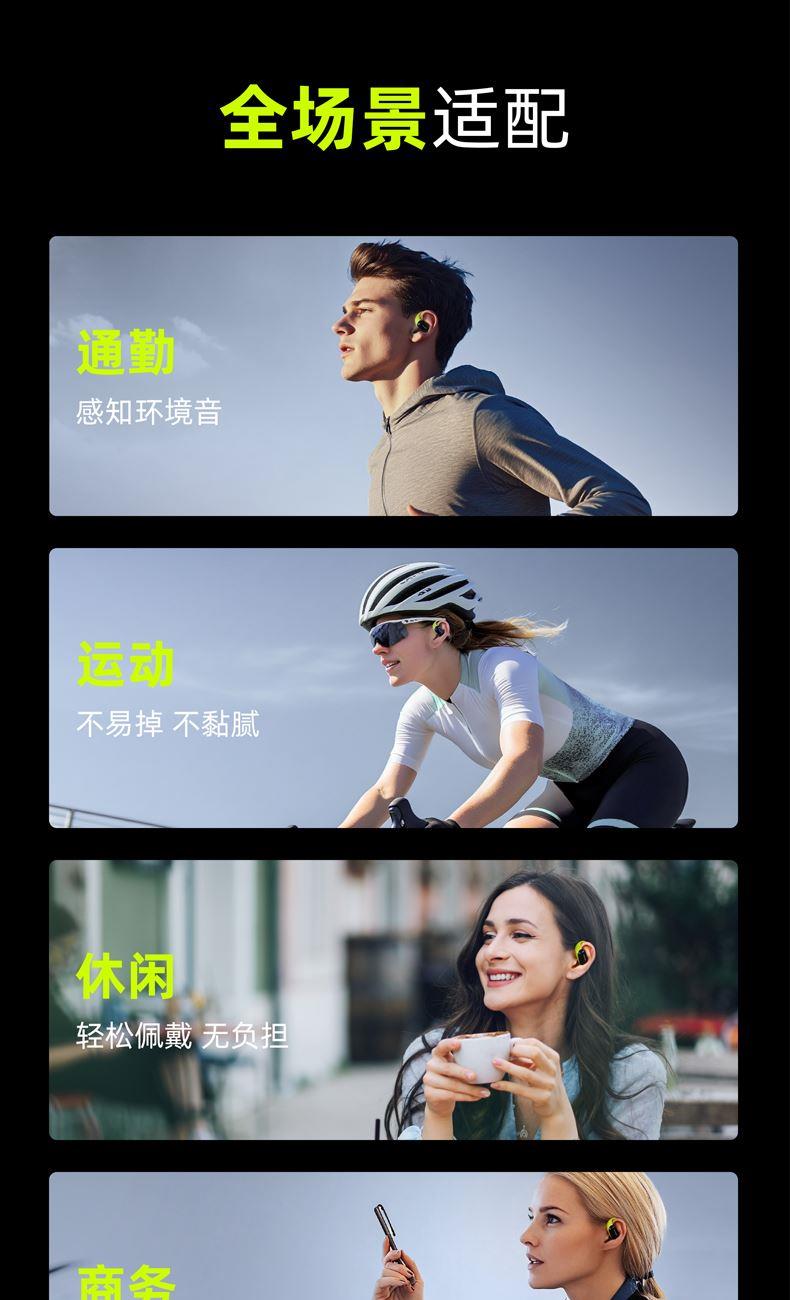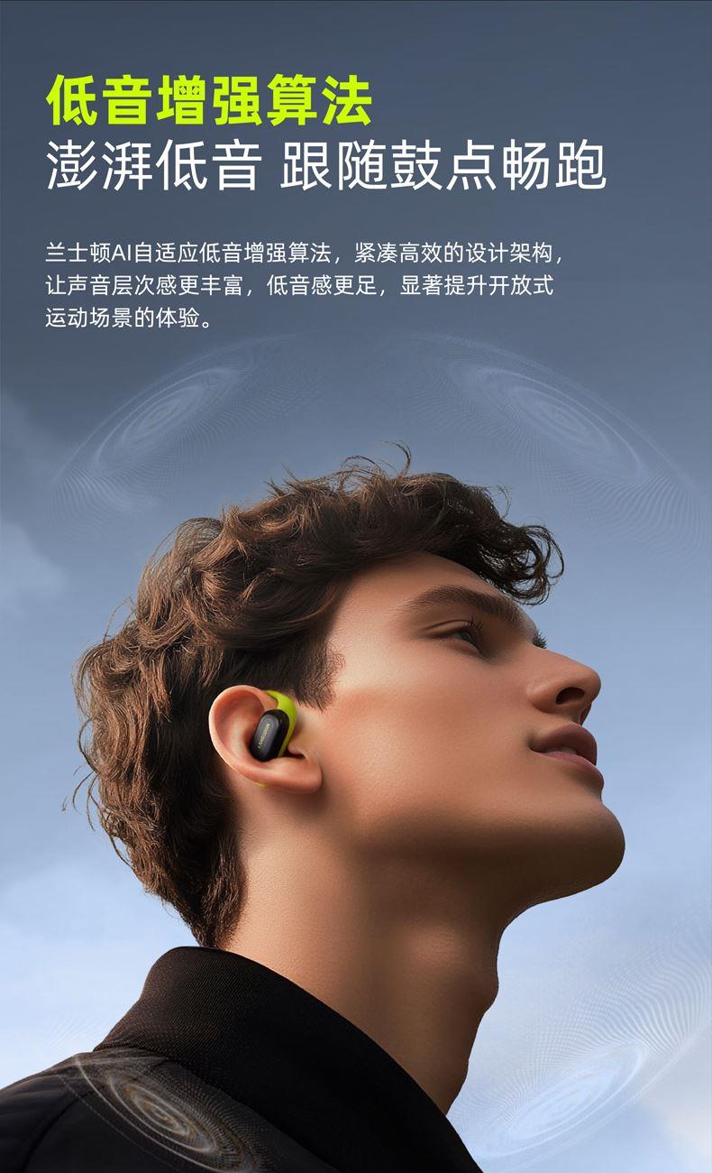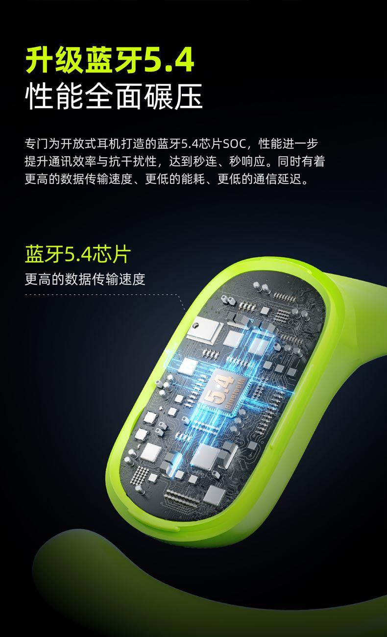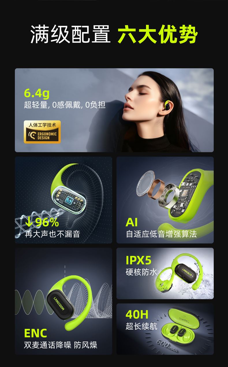 颜色:岩灰绿/素颜黑/灵动白 电池容量:40mAh*2 600mAh 包装尺寸:120*120*52mm 外箱尺寸:550*545*265mm 续航时间:40小时 充电时间:1.5小时 蓝牙版本:V5.4 防水级别:IPX5可水洗 6.4g超轻,比2张A4纸轻,耳朵无负担 弧形耳挂,不入耳防掉,运动安全 IPX5可水洗,雨中跑10小时无惧 AI音效,重低音增强10%,动感足 开放不入耳,比传统耳机舒适健康 单次7.5h,总续航40h,少充电 一年免费换新,7天无理由退换