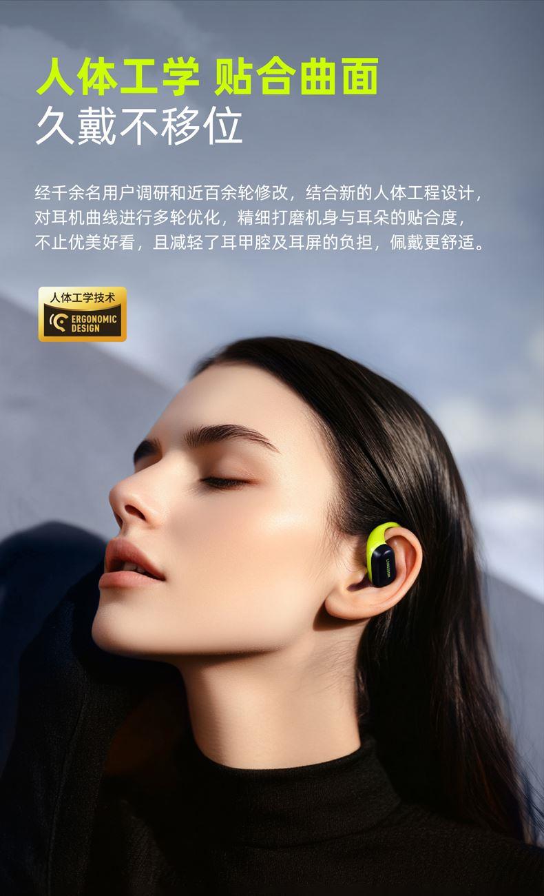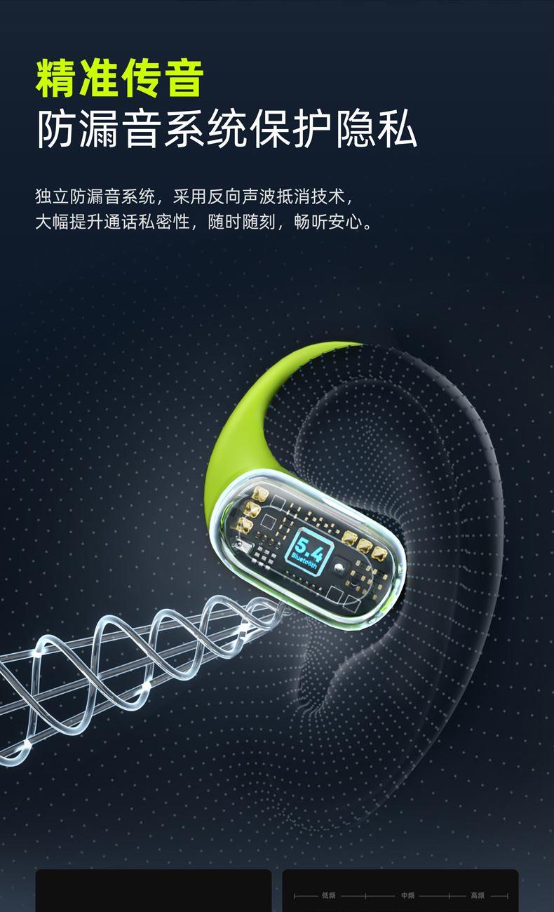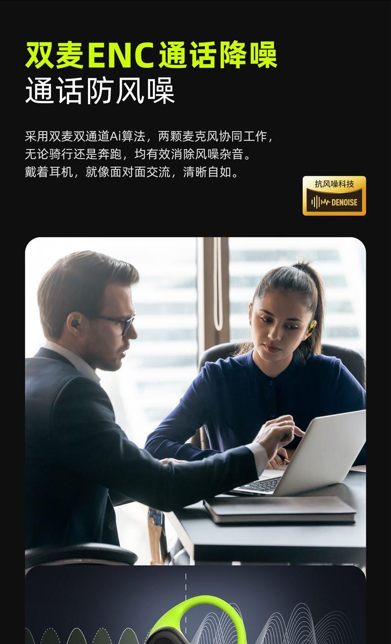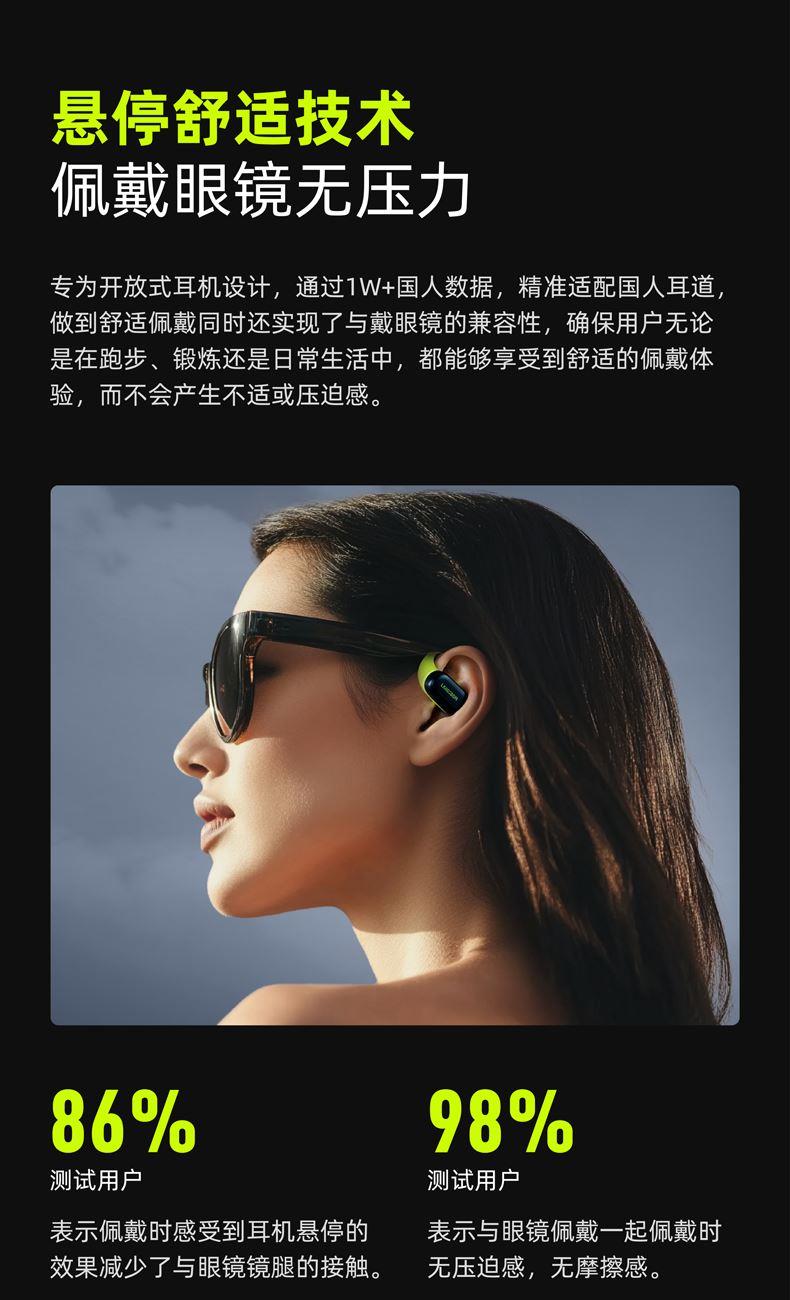 颜色:岩灰绿/素颜黑/灵动白 电池容量:40mAh*2 600mAh 包装尺寸:120*120*52mm 外箱尺寸:550*545*265mm 续航时间:40小时 充电时间:1.5小时 蓝牙版本:V5.4 防水级别:IPX5可水洗 6.4g超轻,比2张A4纸轻,耳朵无负担 弧形耳挂,不入耳防掉,运动安全 IPX5可水洗,雨中跑10小时无惧 AI音效,重低音增强10%,动感足 开放不入耳,比传统耳机舒适健康 单次7.5h,总续航40h,少充电 一年免费换新,7天无理由退换