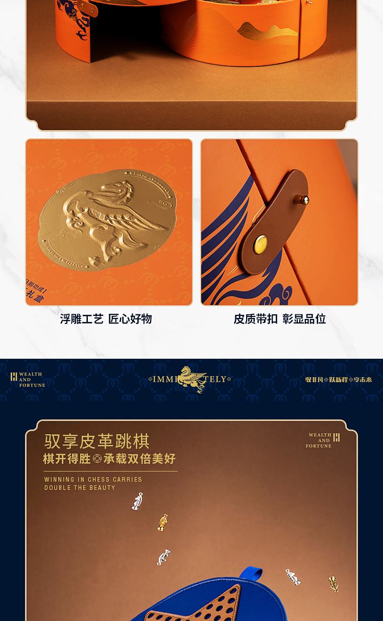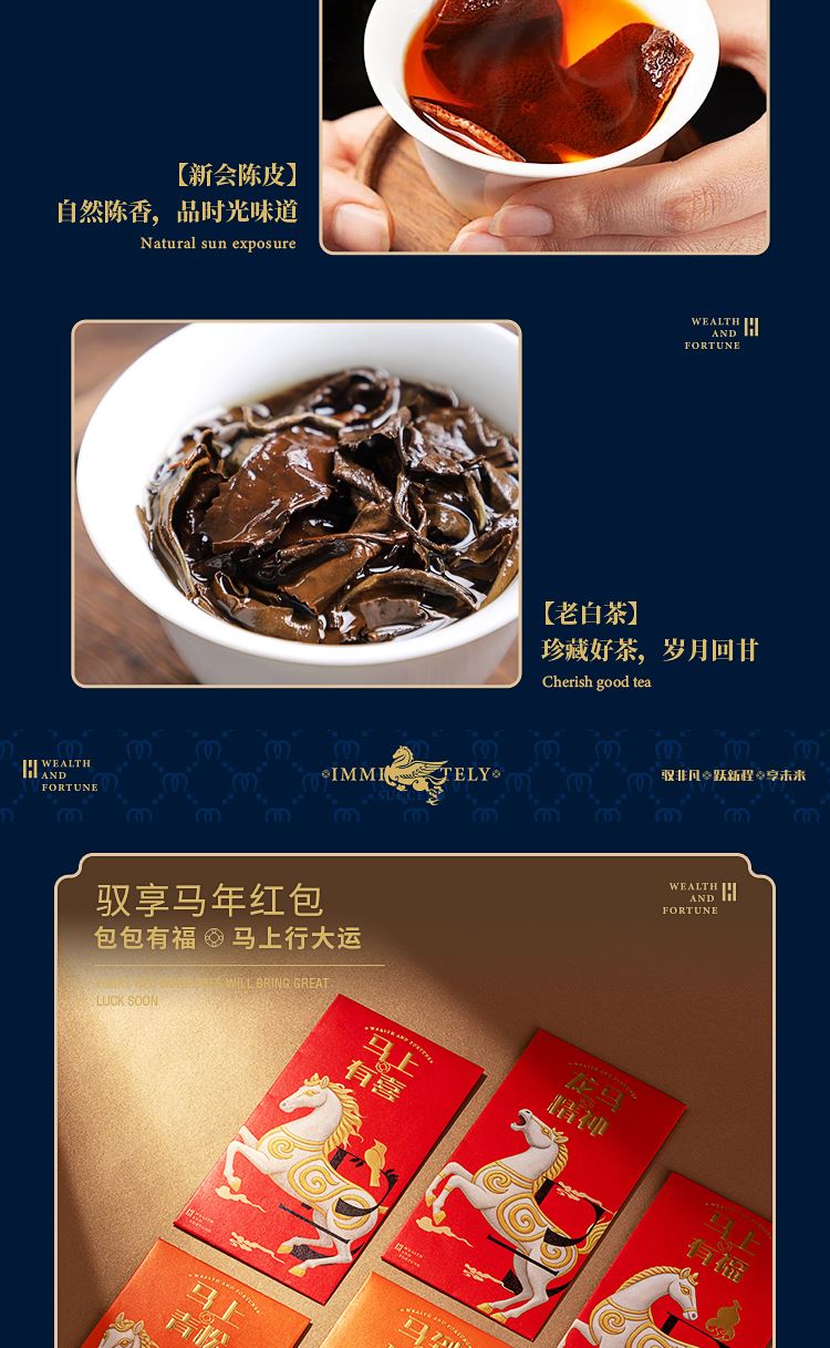 礼品配置清单: 双层主题礼盒、团圆皮革棋盘、马头棋子、磁吸纯钛保温杯*1、老白茶*2盒、新会陈皮*2盒
