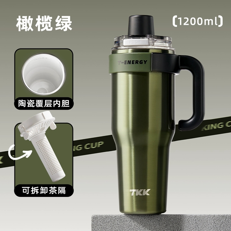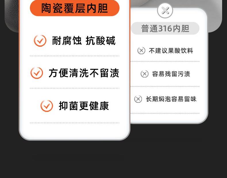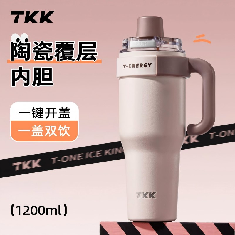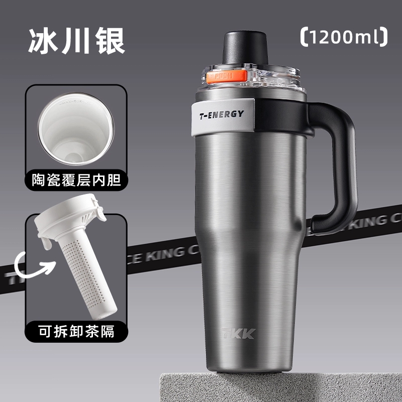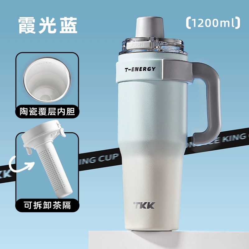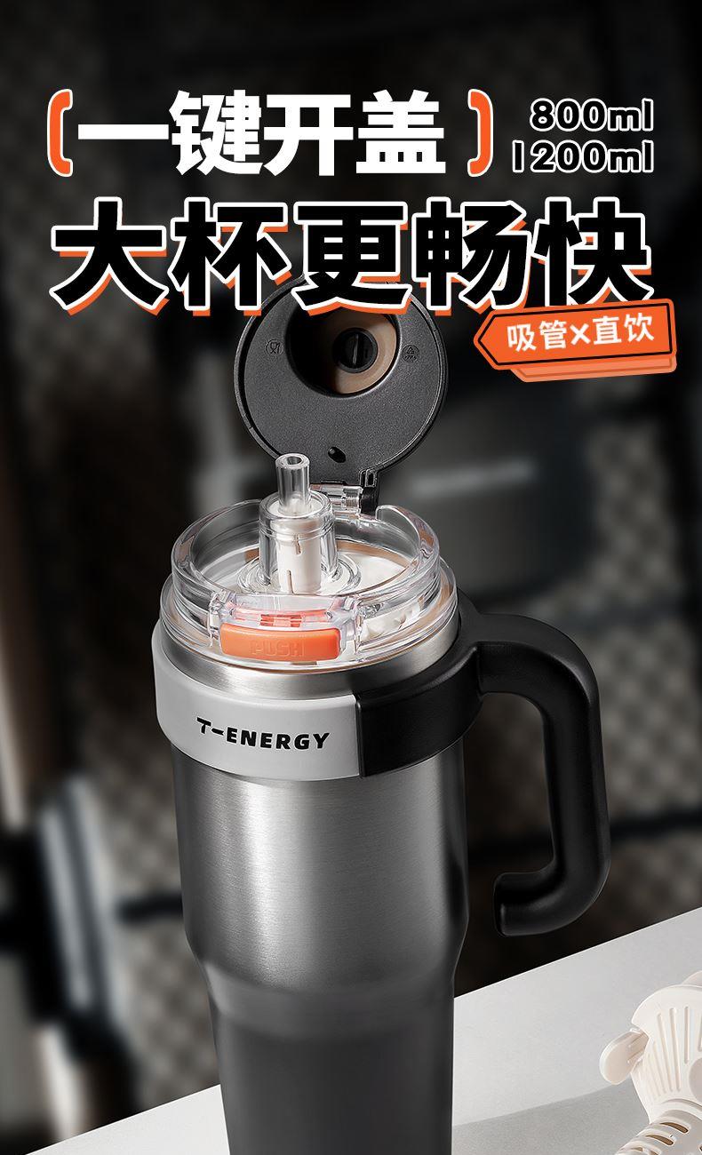 商品容量:1200ml 杯身材质:316不锈钢 包装方式:彩盒 商品净重:717g 商品尺寸:144.5X115.5X314MM 1、316 不锈钢+陶瓷覆层內胆;能保温和保冷,快速清理 ,放心饮用。 2、产品卖点: 大小容量选择,满足不同需求。PP大握把,舒适提拿。一键弹盖,方便补水。两种补水方式:直饮式和自动吸管式。 3、安全材质;运动补水更安心。