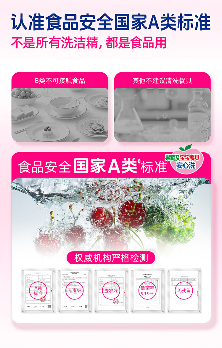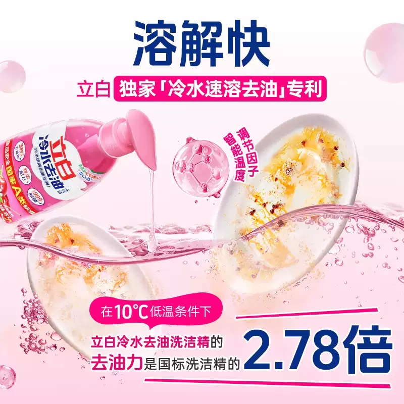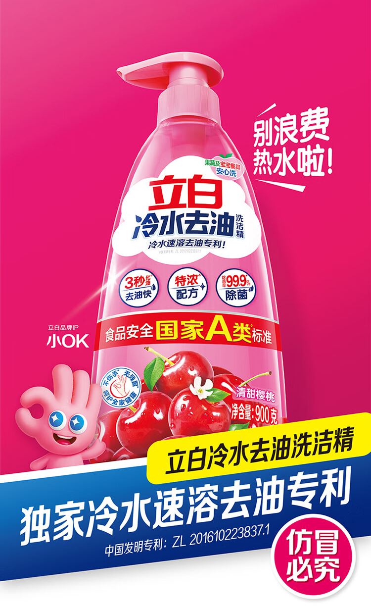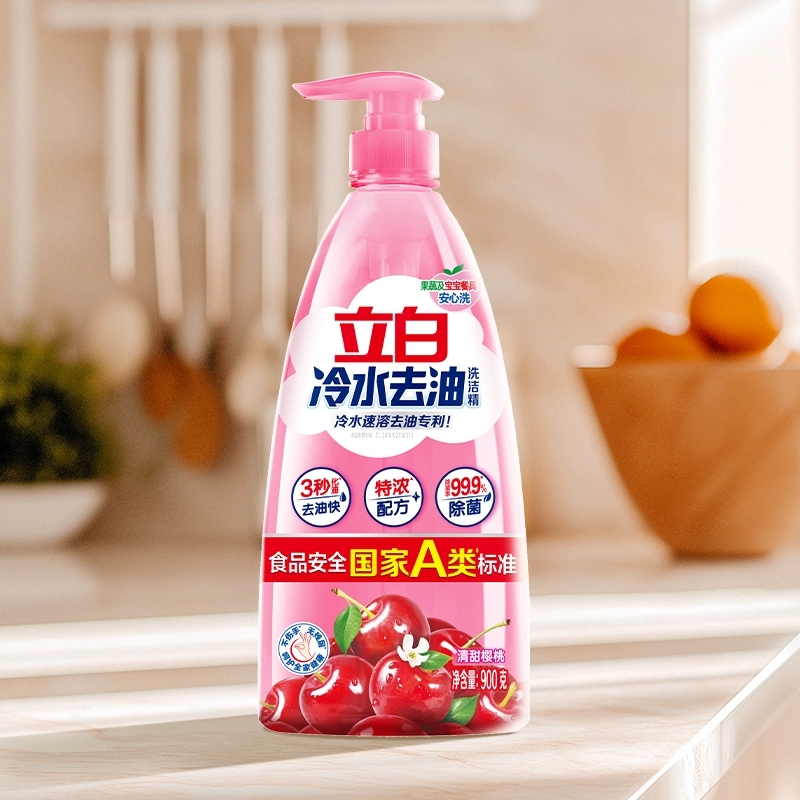 产品成分: 水、维生素E、樱桃提取物、脂肪酶、天然表面活性剂、C6-10脂肪醇聚氧乙烯聚氧丙烯醚、C10-16烷基苯磺酸钠、食用香精、助剂、甲基异噻唑啉酮、甲基氯异噻唑啉酮。 产品功效: 冷水速溶去油 冷水洗碗也去油