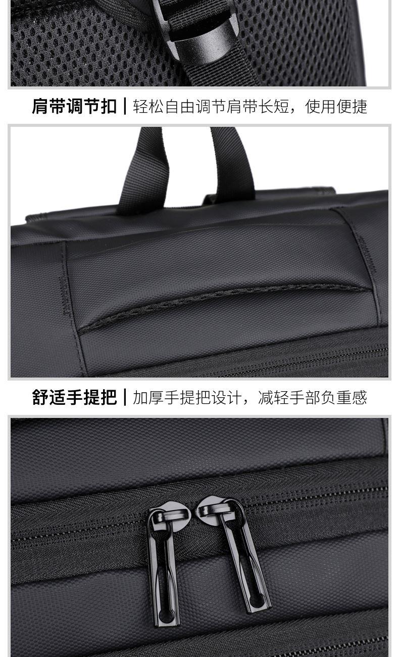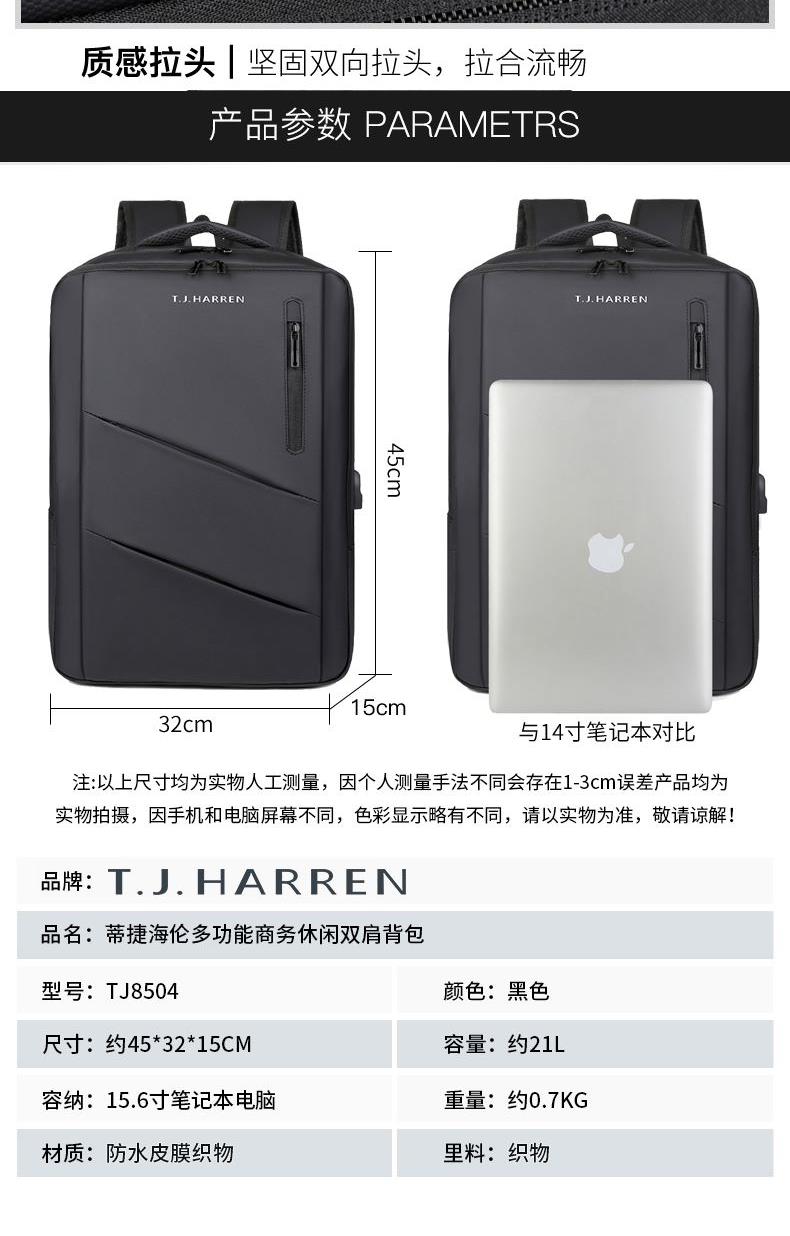 型号:TJ8504 颜色:黑色 尺寸:约45*32*15CM 容量:约21L 面料:柔性防水皮膜织物 里料:织物 重量:约0.7KG 等级:一等合格品 执行标准:QB/T 1333-2018 产品特点: 1、新款多功能设计,时尚大方,旅行休闲商务三用;2、柔性防水皮膜面料,一擦即干,轻松打理;3、多隔层结构,分区合理,轻松收纳;4、双主袋共约21L大容量,装的更多;5、独立加棉加厚电脑隔层袋,可放置15.6寸电脑;6、3个前置拉链袋加1个侧袋,放置贴身物品;7、带USB充电接口,充电更方便;8、多个内置物袋,方便收纳放置更多小物件;9、拉杆固定束带设计,解放双手;10、透气背负系统,配合加大加厚提手与肩带,可背可提、透气干爽,舒适减压出行;11、支持客户定制。