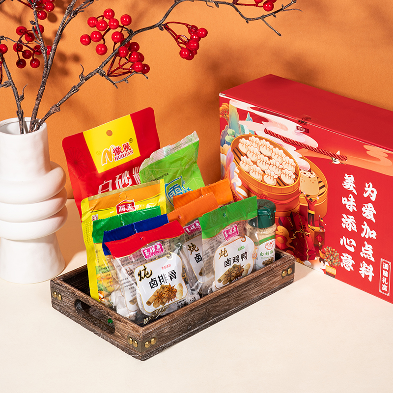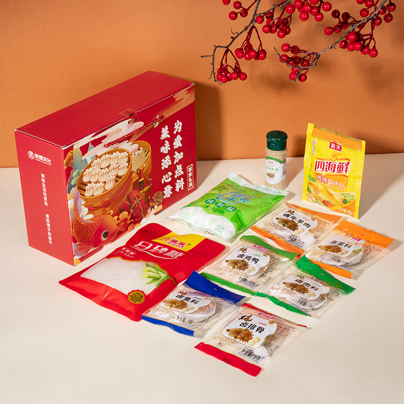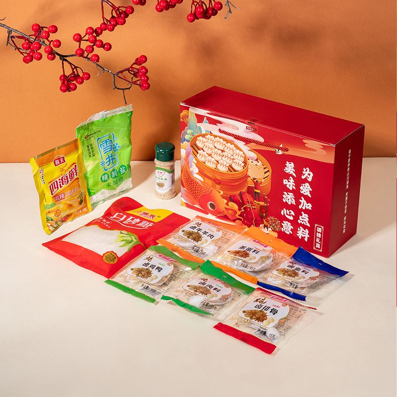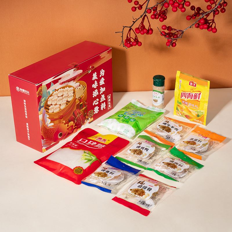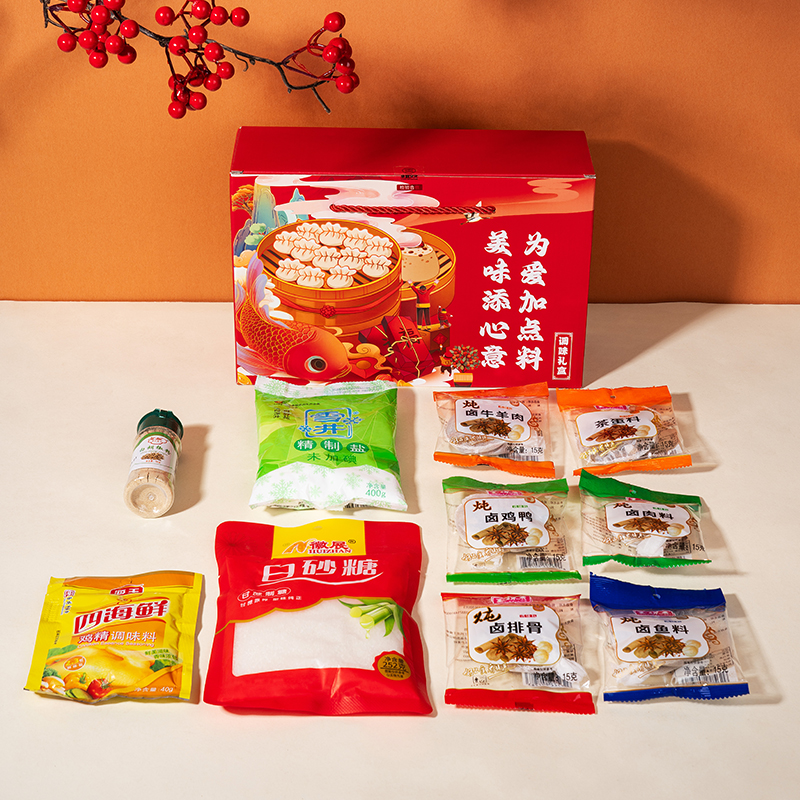 产品主题:十全十美满厨房 五福临门送健康 礼盒规格:300*200*100mm 产品配置:自贡雪井精制盐400g*1 海天四海鲜鸡精40g*1 白砂糖252g*1 白胡椒粉30g*1瓶 卤鸡鸭调料15g*1 炖排骨调料15g*1 炖鱼调料15g*1 包 炖肉料15g*1 茶蛋调料15g*1 炖牛羊肉调料15g*1 产品卖点: 1、国潮风瓦楞礼盒,家庭团圆主题。 2、大礼包包含十种厨房必备调料,家家需要。 3、十全食美满厨房,五福临门送健康,寓意好。 4、关注三餐健康,送上美味调料,让客户的餐桌上时刻拥有我们的关怀!