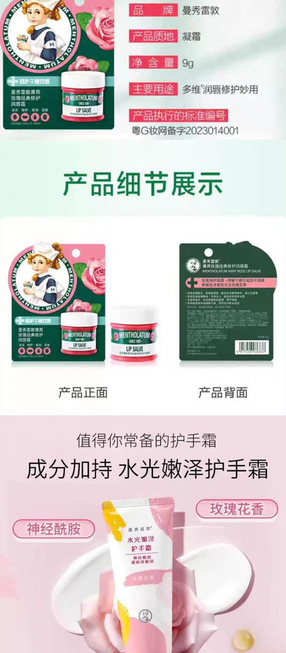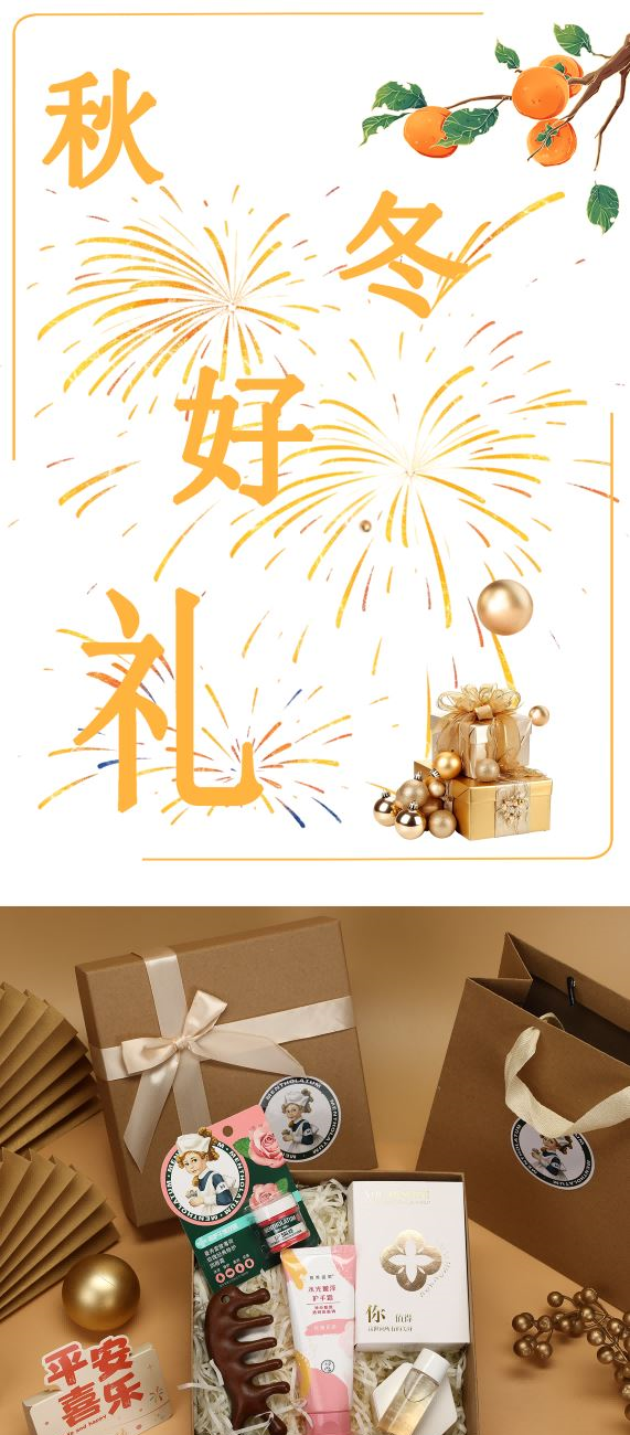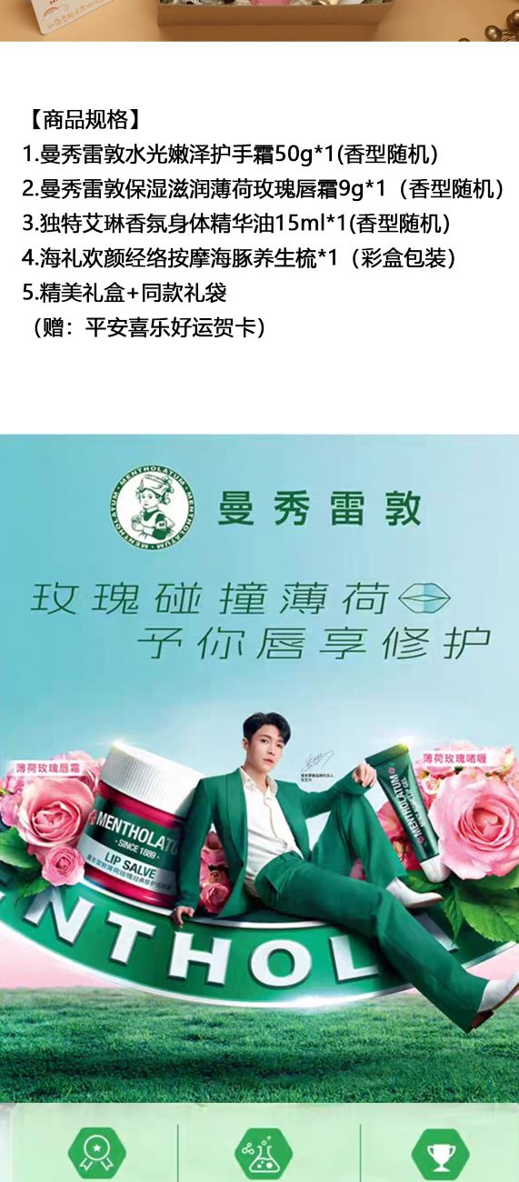 1.曼秀雷敦水光嫩泽护手霜50g*1(香型随机) 2.曼秀雷敦保湿滋润薄荷玫瑰唇霜9g*1(香型随机) 3.独特艾琳香氛身体精华油15ml*1(香型随机) 4.海礼欢颜经络按摩海豚养生梳*1(彩盒包装) 5.精美礼盒+同款礼袋 (赠:平安喜乐好运贺卡) 一套解决手、唇、身体护理需求,按摩梳提升放松体验,实用性与仪式感兼具,适合日常保养或节日赠礼。