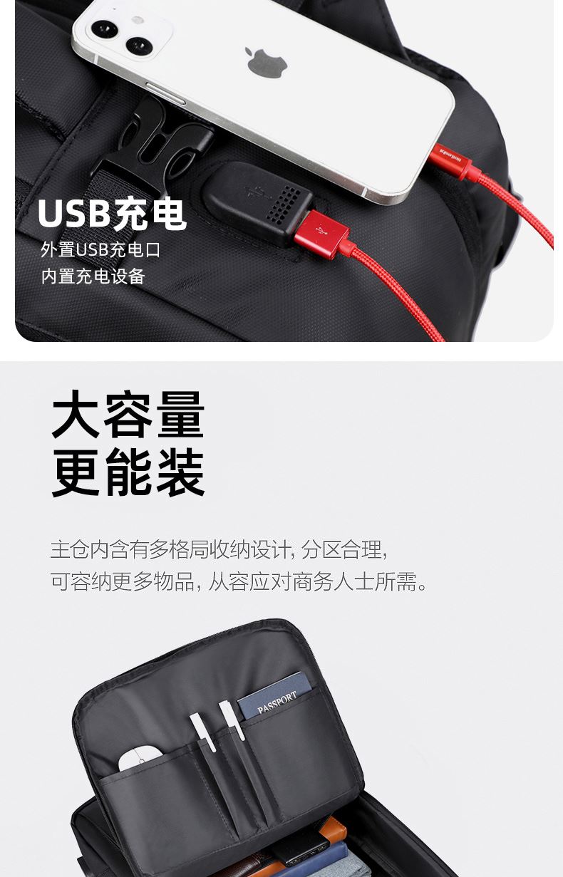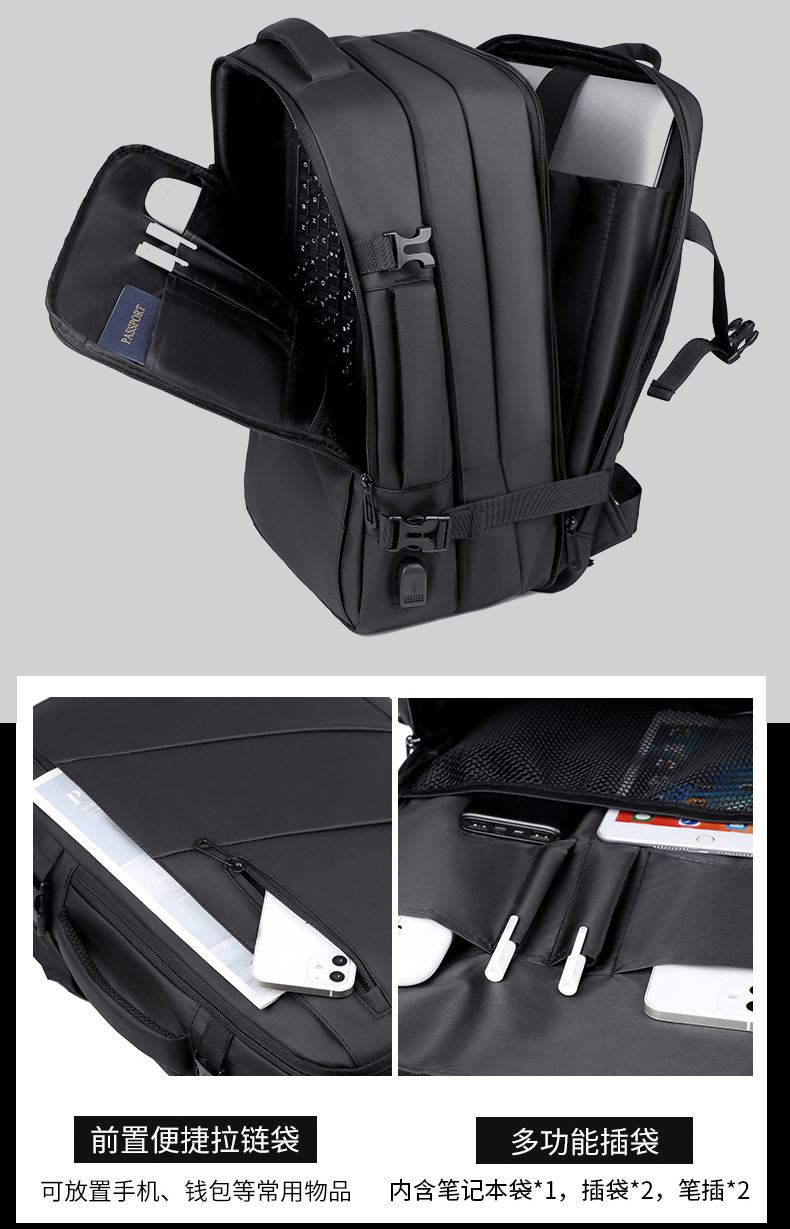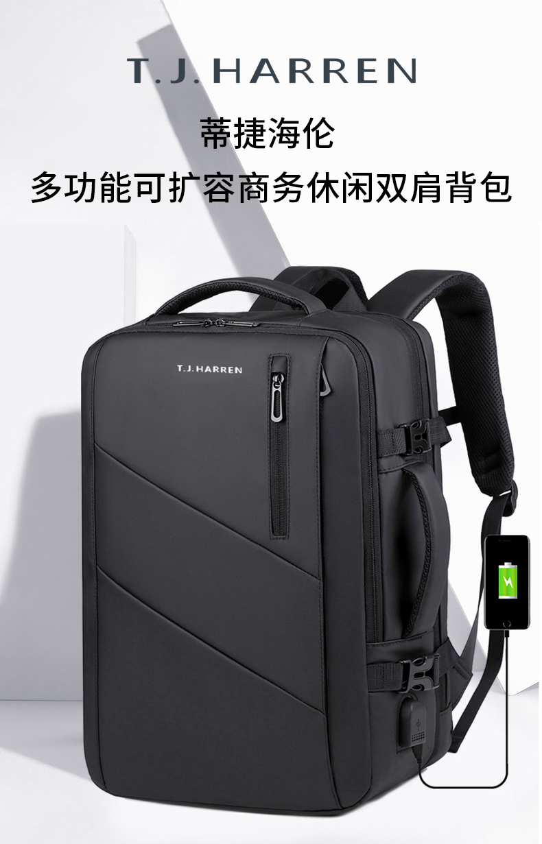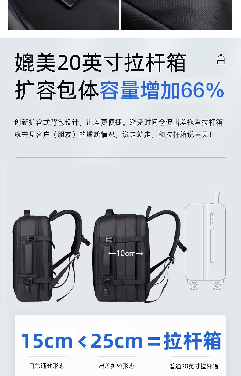 1、新款多功能可扩容设计,超大容量,旅行休闲商务三用;2、柔性防水皮膜面料,一擦即干,轻松打理;3、多隔层结构,分区合理,轻松收纳;4、双主袋扩容前共约22L大容量,适合日常通勤;5、双主袋扩容后共约36L大容量,适合长途旅行;6、独立加棉加厚电脑隔层袋,可放置15.6寸电脑;7、2个大容量前置拉链袋,放置贴身物品;8、带USB充电接口,充电更方便;9、多个内置物袋,方便收纳放置更多小物件;10、拉杆固定束带设计,解放双手;11、透气背负系统,配合加大加厚提手与肩带,可背可提、透气干爽,舒适减压出行;12、支持客户定制。