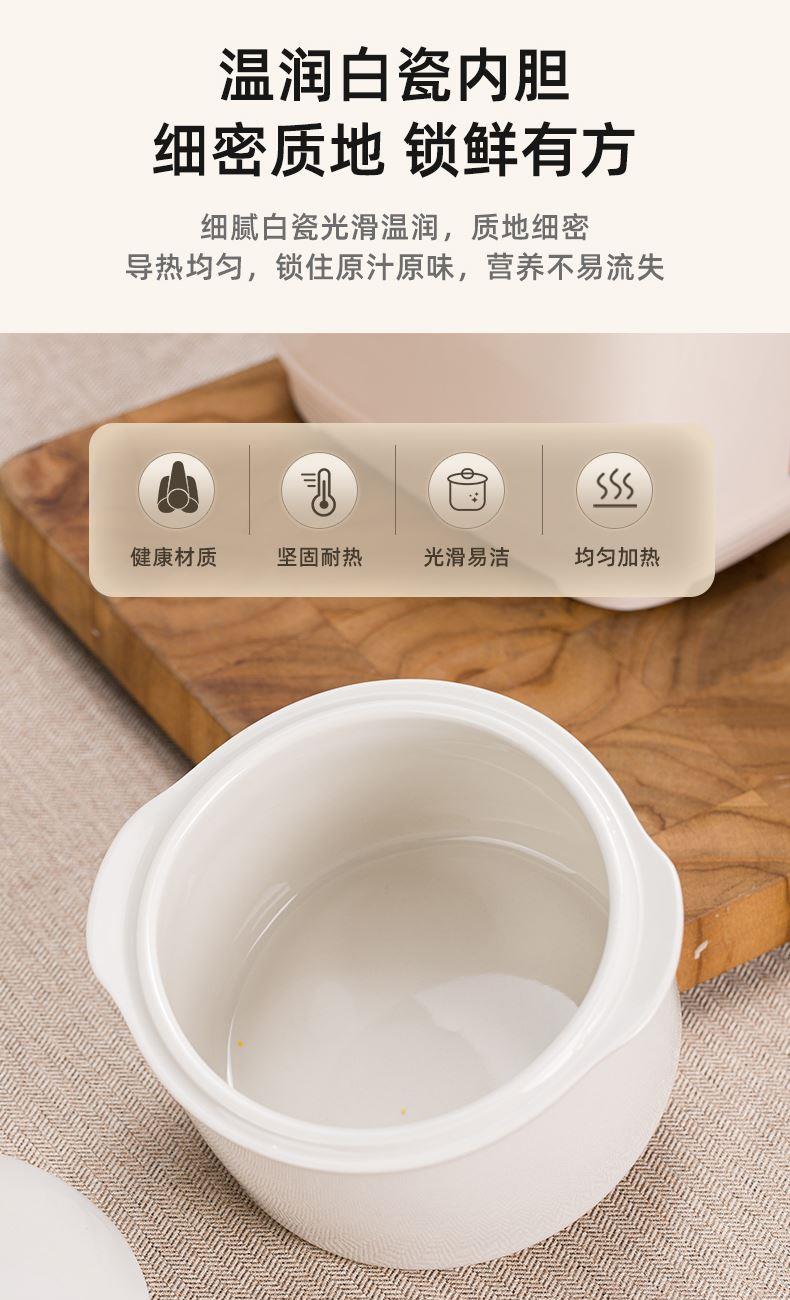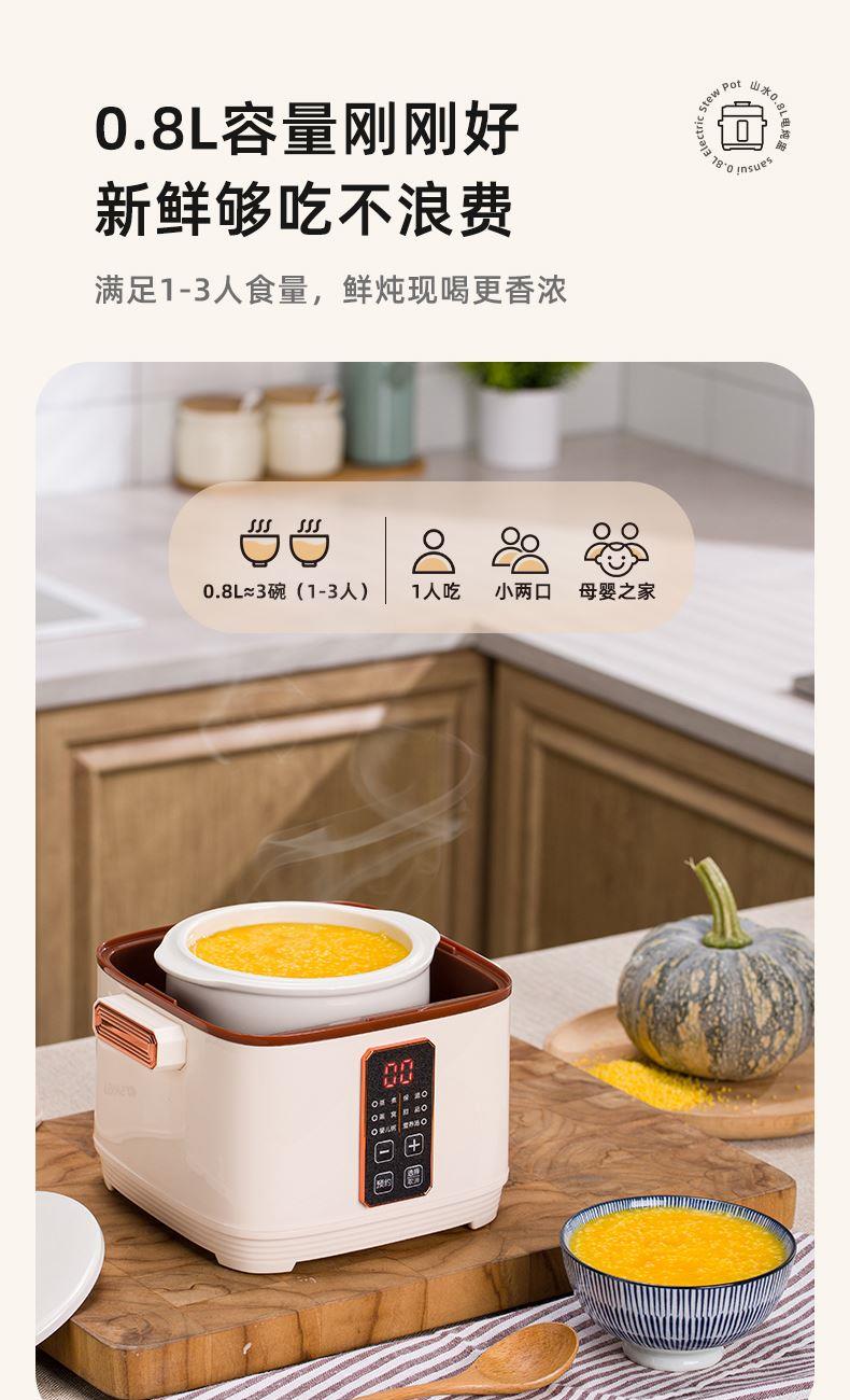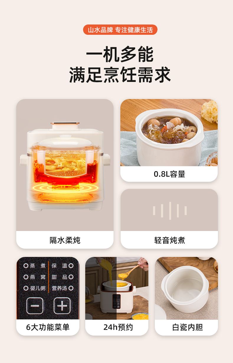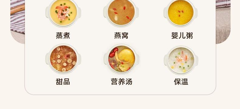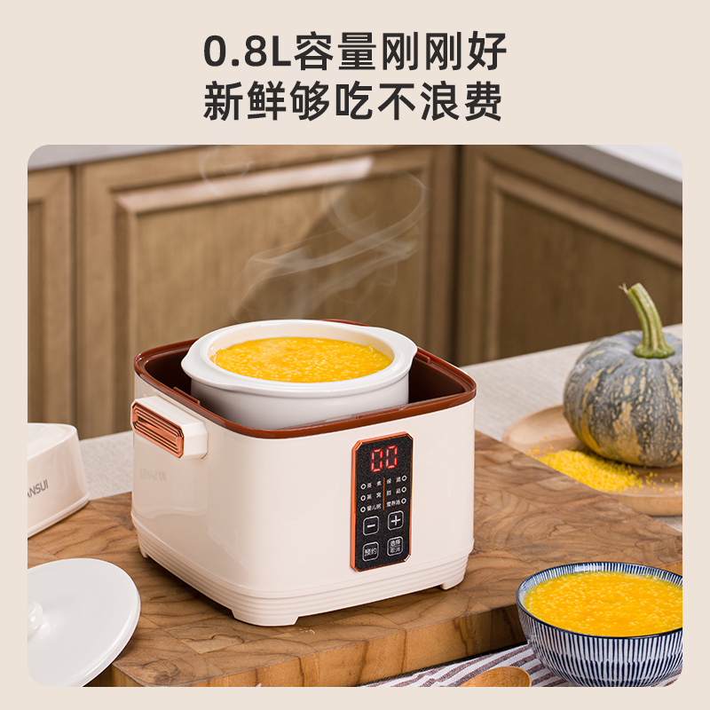 额定功率:200W 额定容量:0.8L 白瓷内胆紧锁营养不串味 8大功能菜单、24小时预约、保温定时功能 PTC发热细火慢炖 防干烧保护功能、隔水软炖不糊底 200W低功率节能省电 宝宝营养辅食、自动免看管、防烫上盖提手 包装方式:彩包+网购包装