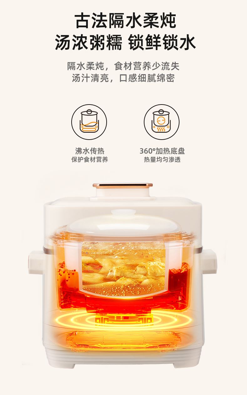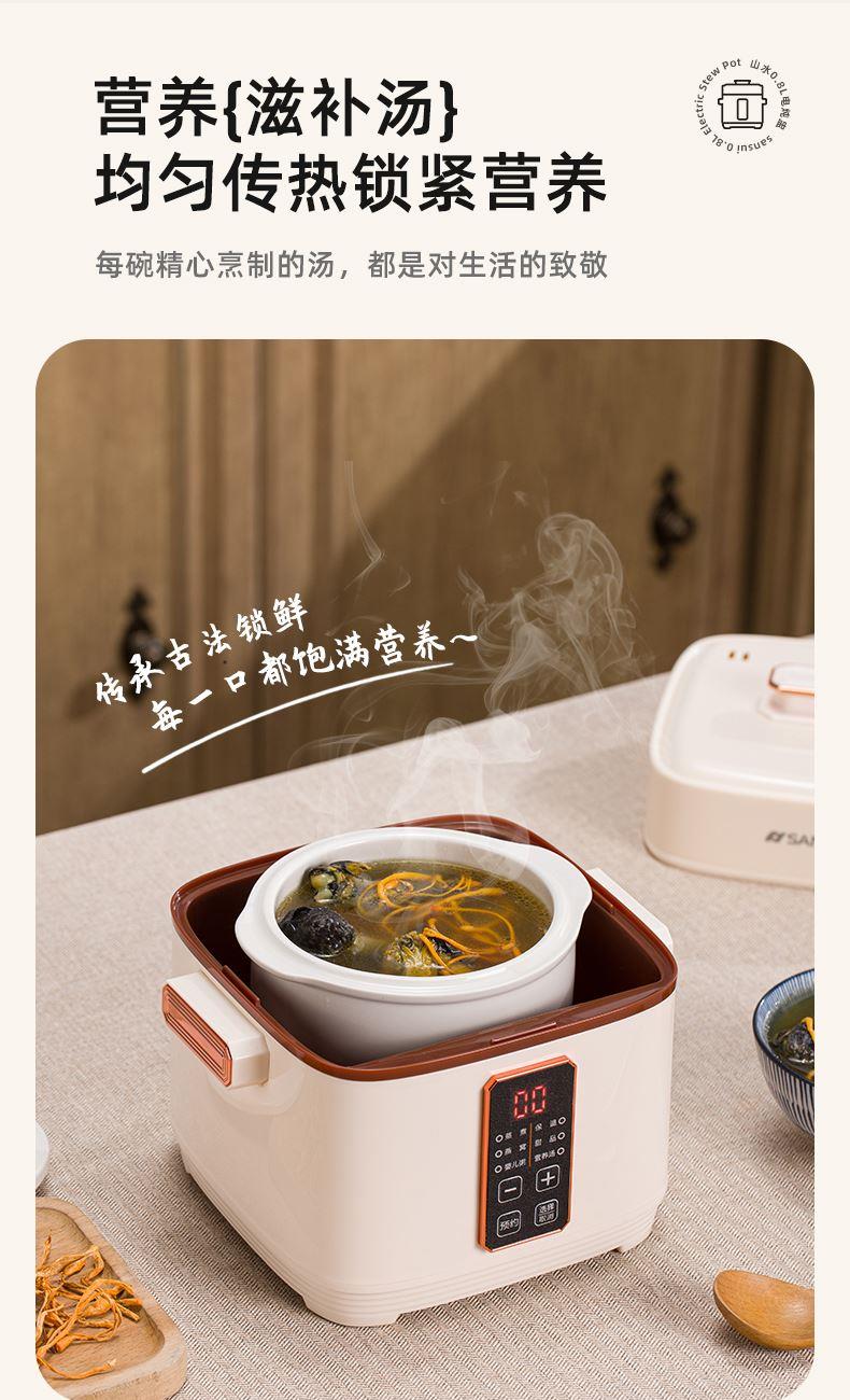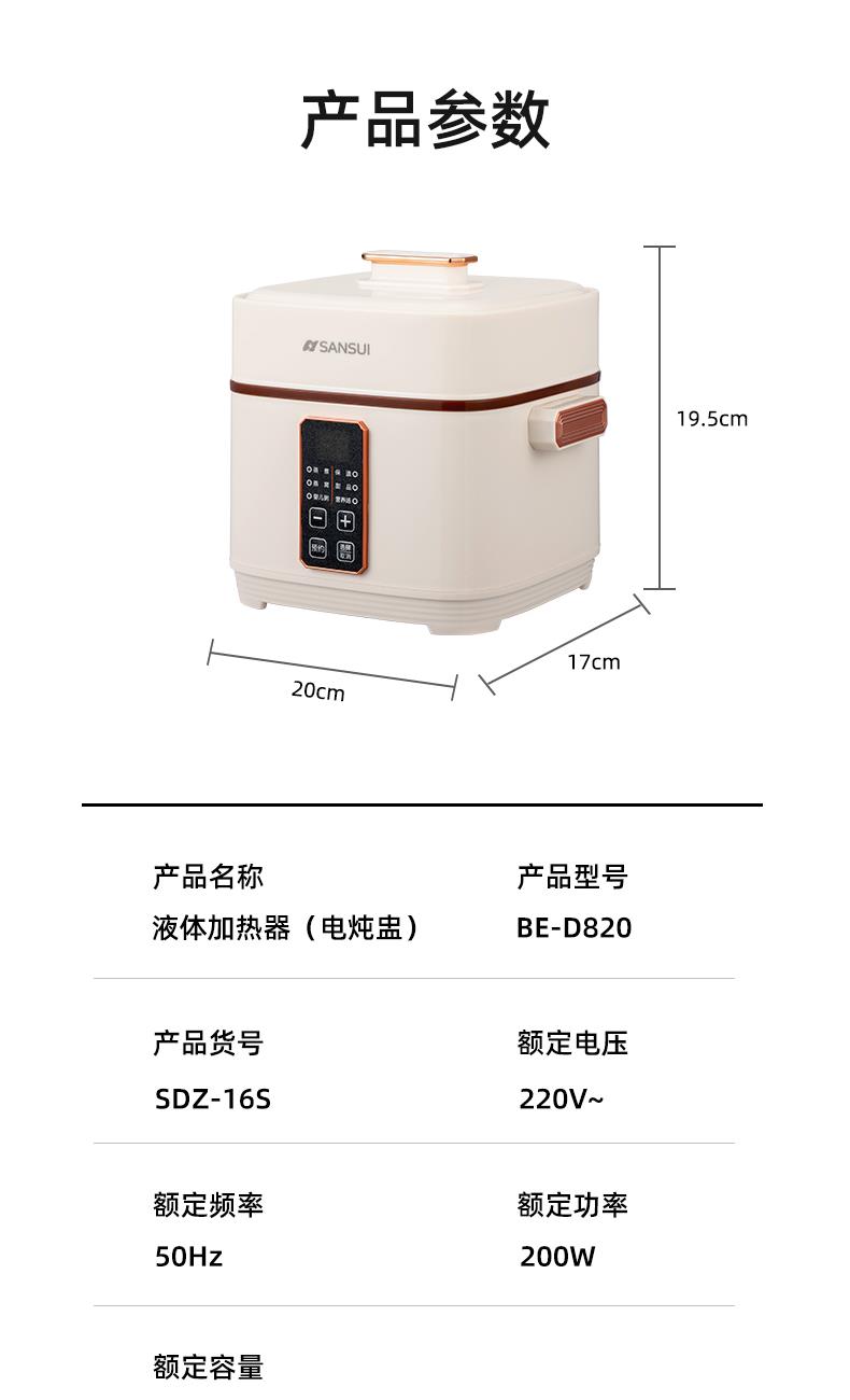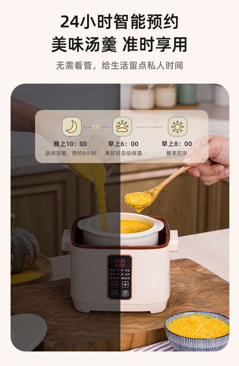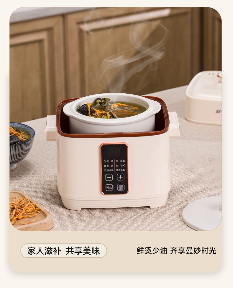 额定功率:200W 额定容量:0.8L 白瓷内胆紧锁营养不串味 8大功能菜单、24小时预约、保温定时功能 PTC发热细火慢炖 防干烧保护功能、隔水软炖不糊底 200W低功率节能省电 宝宝营养辅食、自动免看管、防烫上盖提手 包装方式:彩包+网购包装