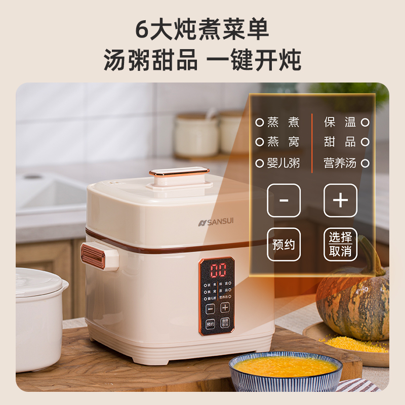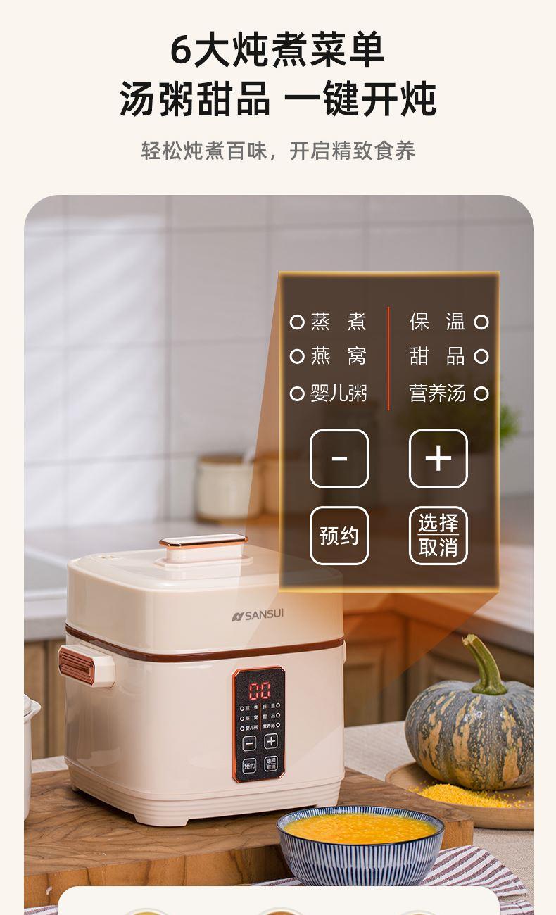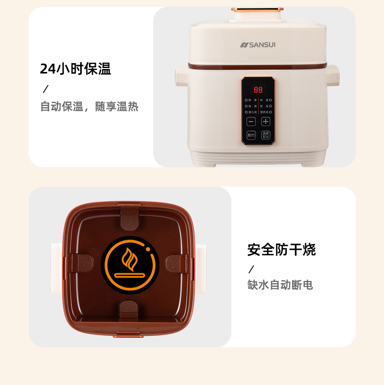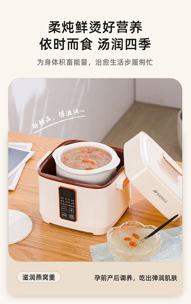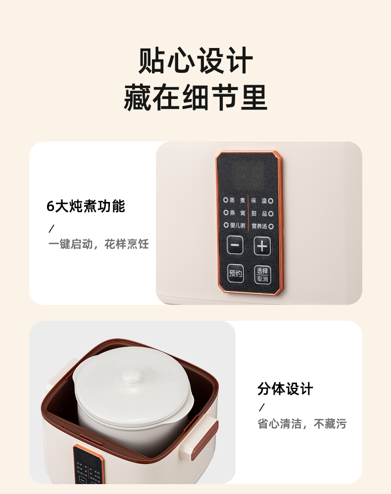 额定功率:200W 额定容量:0.8L 白瓷内胆紧锁营养不串味 8大功能菜单、24小时预约、保温定时功能 PTC发热细火慢炖 防干烧保护功能、隔水软炖不糊底 200W低功率节能省电 宝宝营养辅食、自动免看管、防烫上盖提手 包装方式:彩包+网购包装