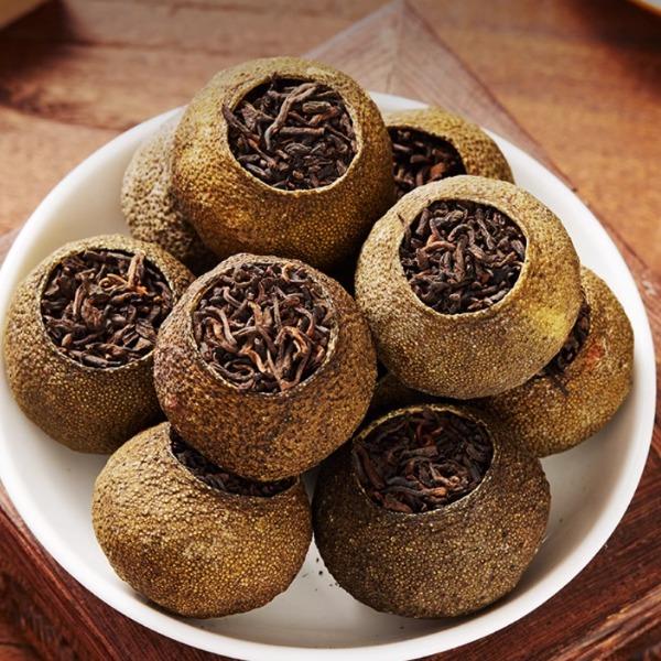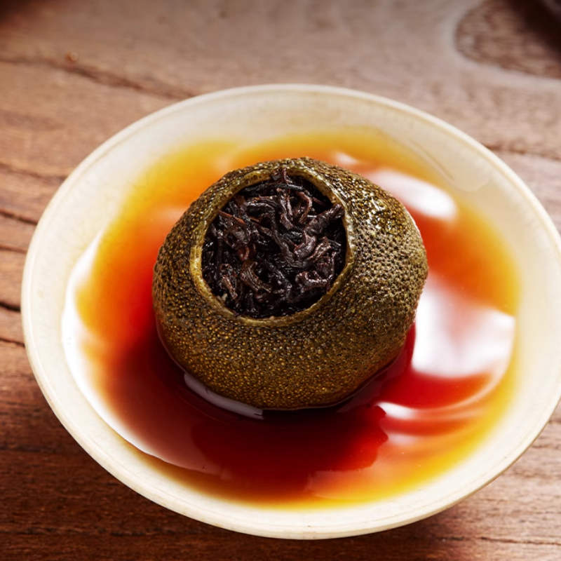 经“半生晒+低温烘焙”传统工艺融合,柑皮油胞饱满、果香清甜,熟普茶汤醇厚顺滑、回甘持久,二者在陈化中自然交融,形成柑香与茶韵交织的独特风味;