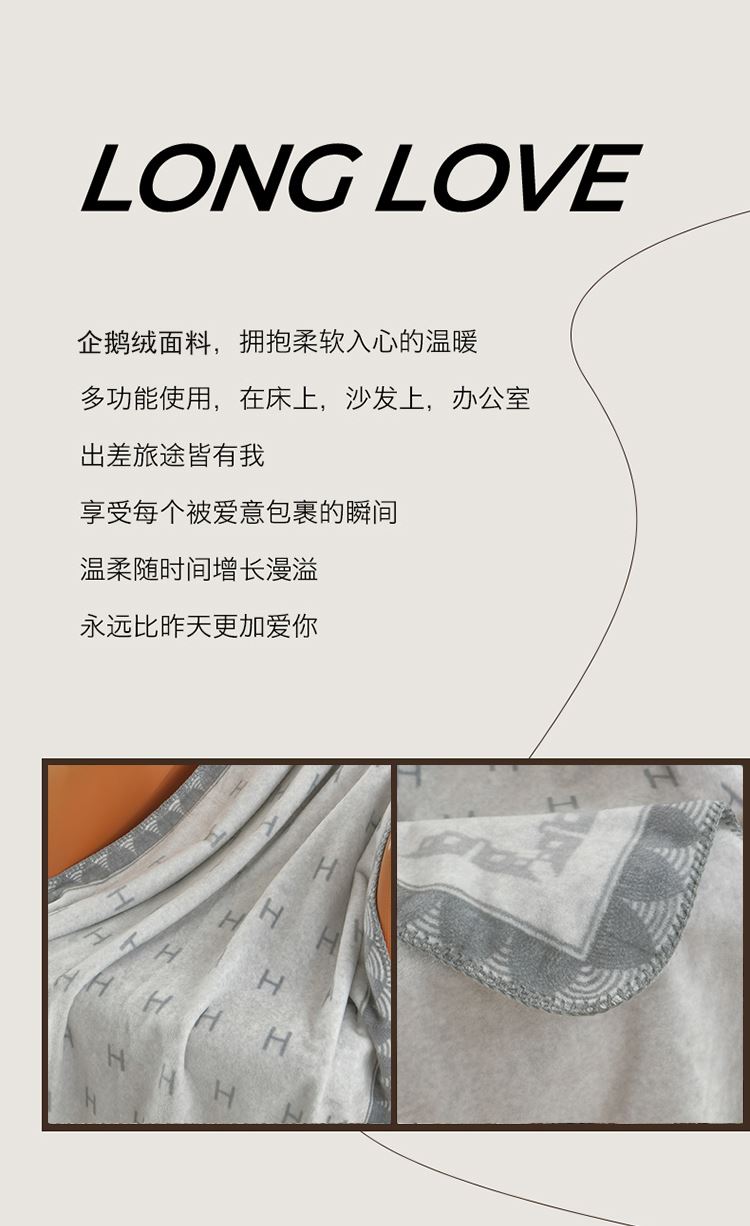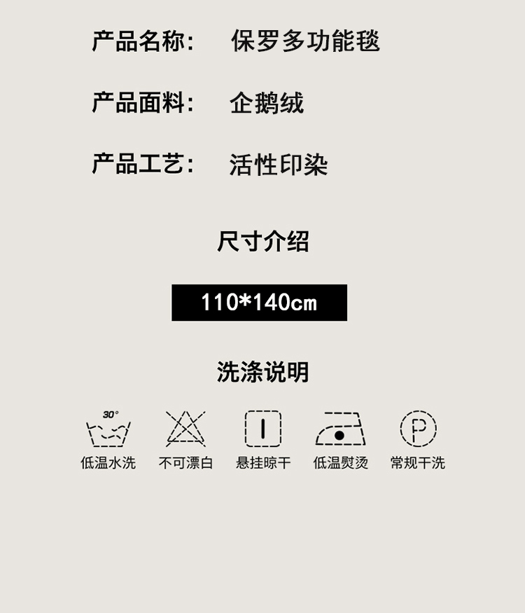规格:100*140cm 面料:企鹅绒 克重:800g 产品包装:精美礼盒 包装尺寸:30*29*13cm 1.企鹅绒面料具有良好的透气性和排湿性,让身体保持干爽,保暖不憋闷。 2.手感 柔软,轻薄透气,滑爽有弹性。