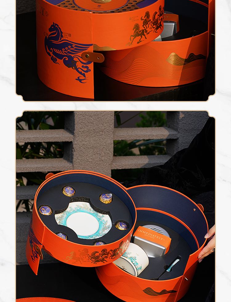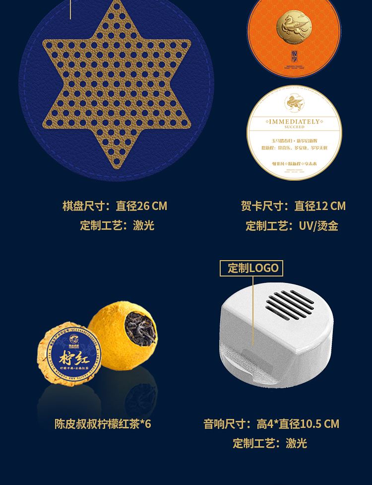 礼品配置清单: 双层主题礼盒、团圆皮革棋盘、马头棋子、三合一智能音响*1、精品柠檬古树红茶*6颗 、永丰源陶瓷咖啡杯蝶加勺子
