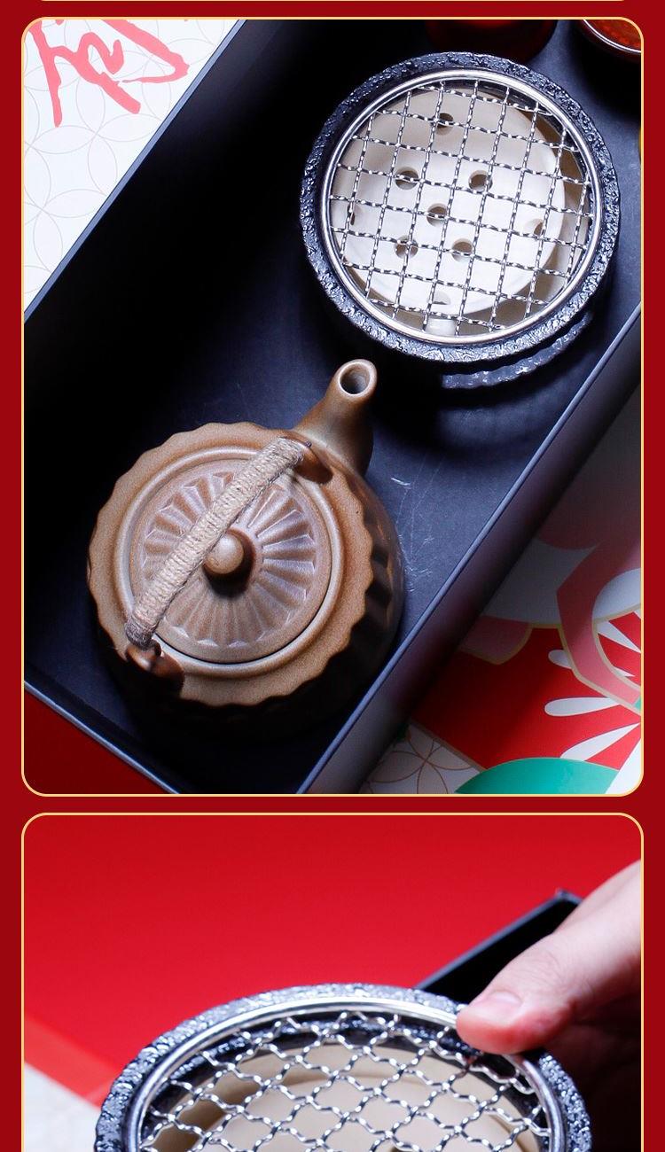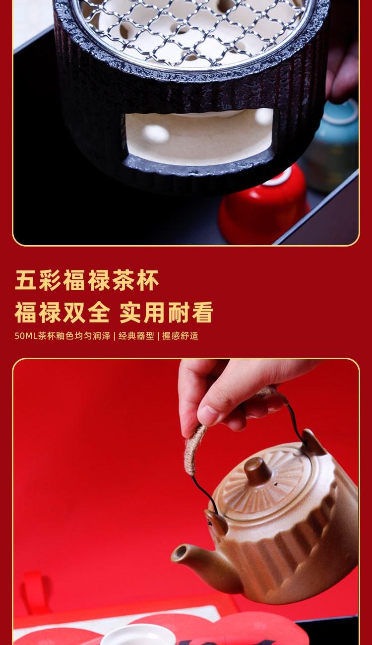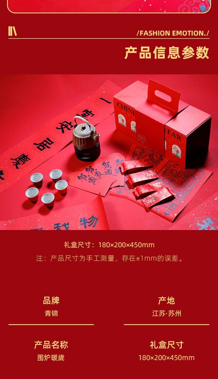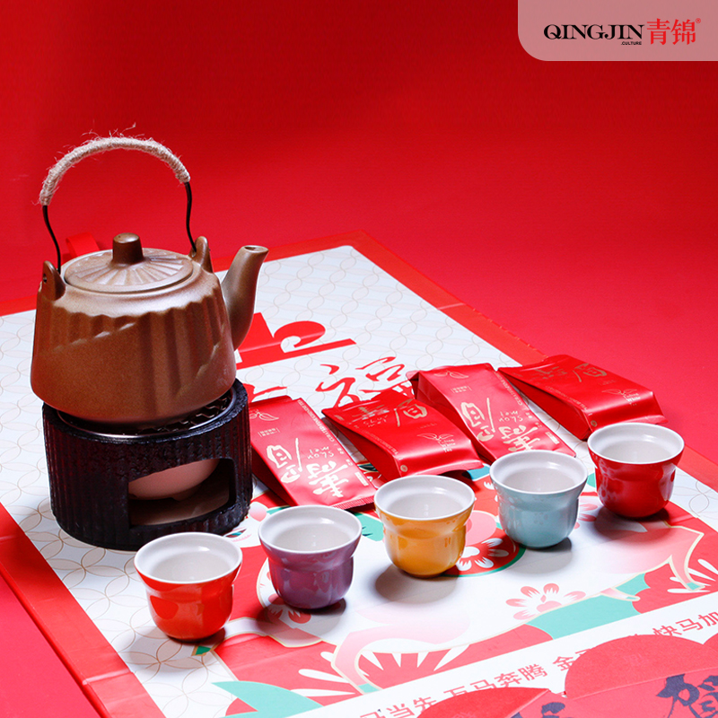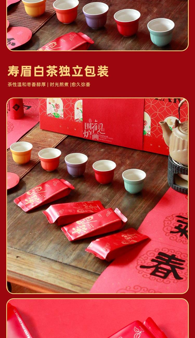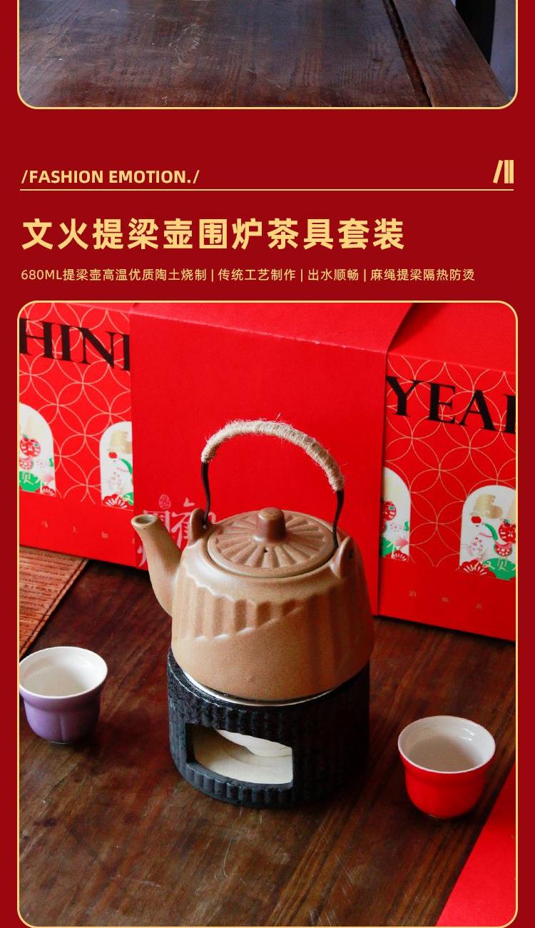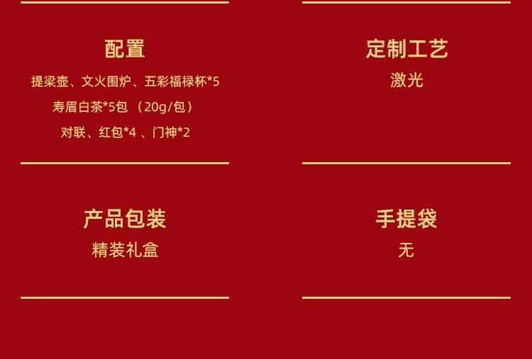 1-文火提梁壶*1 680ml 陶瓷材质 2-文火围炉*1 陶瓷 尺寸:11.5*9.3*6.5cm 3-五彩福禄杯*5 陶瓷 5.8*4.8cm 50ml 4-伯仲之叙寿眉白茶*5包 20克 5-对联*1-红包*4 门神*2 6-精装实用性礼盒*1 包装可做挂历 材质 洒金纸-触感纸 礼盒:18×20×45cm 馈赠重要伙伴彰显不凡品味;敬献至亲长辈,承载孝心与温情。年味,在壶中沸腾,在墙上停驻。首批限量,诚邀品鉴。