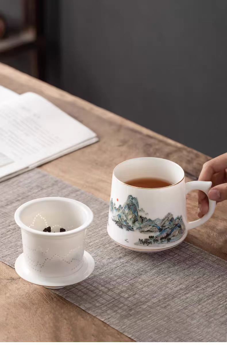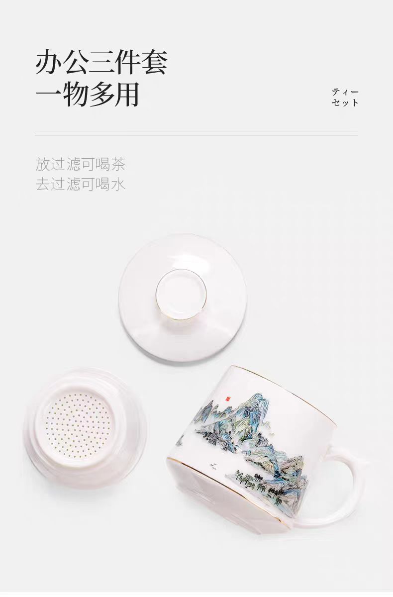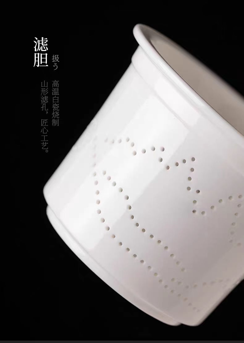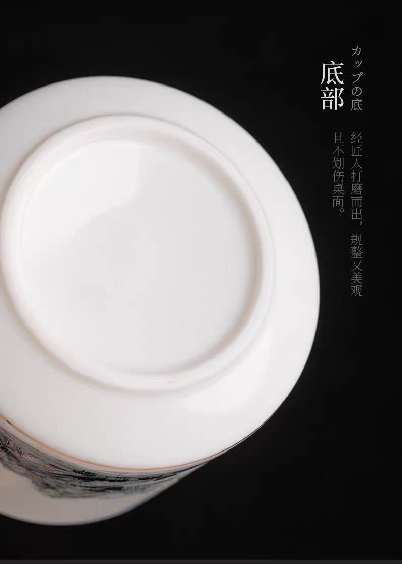 配 制: 1杯 1盖 1茶漏 1礼盒手提袋 规格:高办公杯:14.5*11.5cm 矮办公杯:12*11.5cm 材质:羊脂玉瓷 描24K真金 堆料立体画面 推荐说明:羊脂玉瓷,精选优质高价瓷土 ,瓷质细腻润滑,似凝脂,如美玉。在阳光照射下,呈半透明羊油状,洁白滋润,故称羊脂玉,乃瓷中佳品。做工精细,一丝不苟,儒雅内敛,浑身散发着出凡托俗的高贵气质。