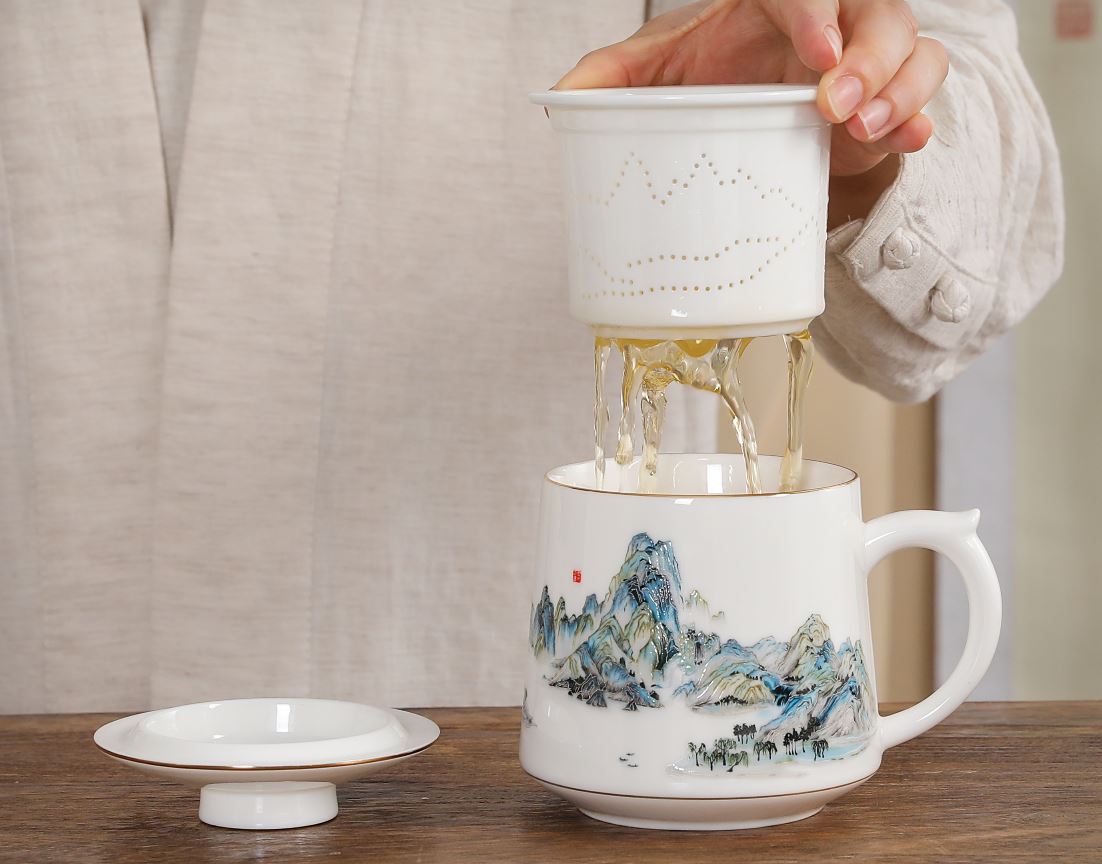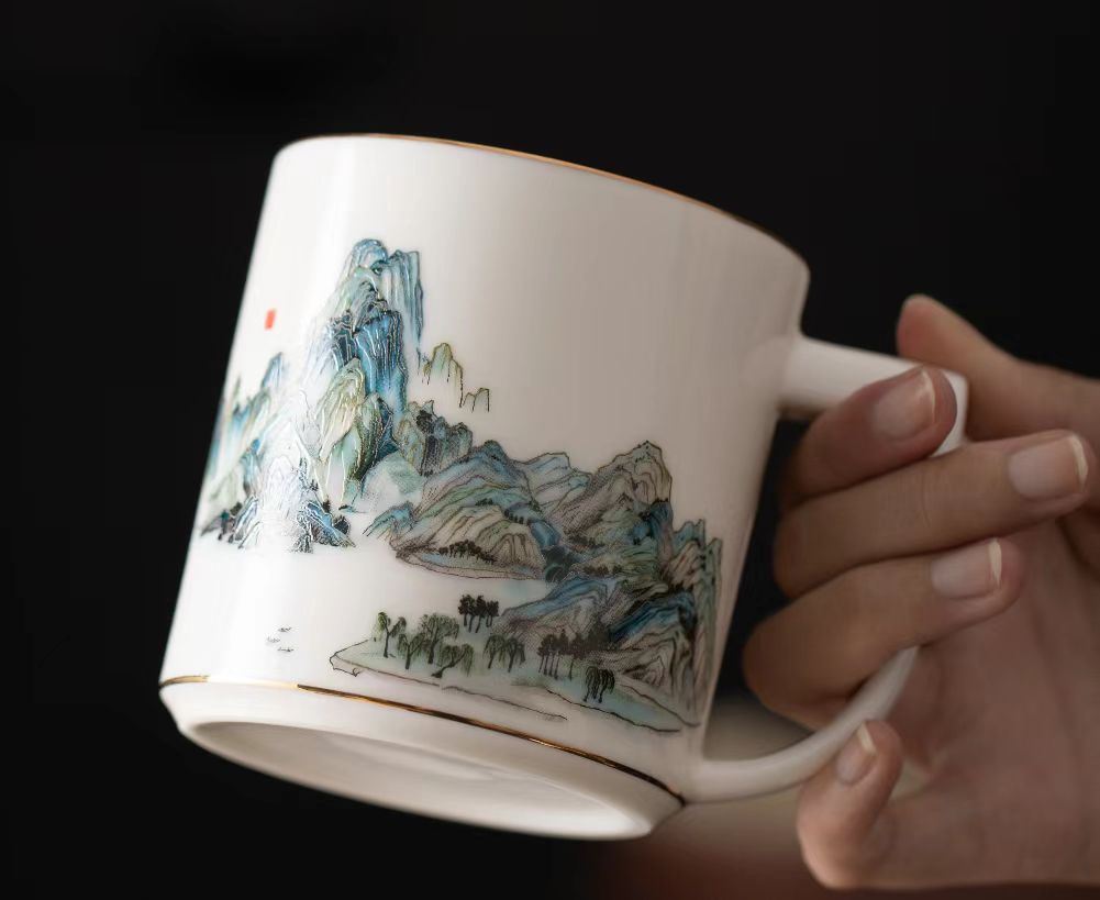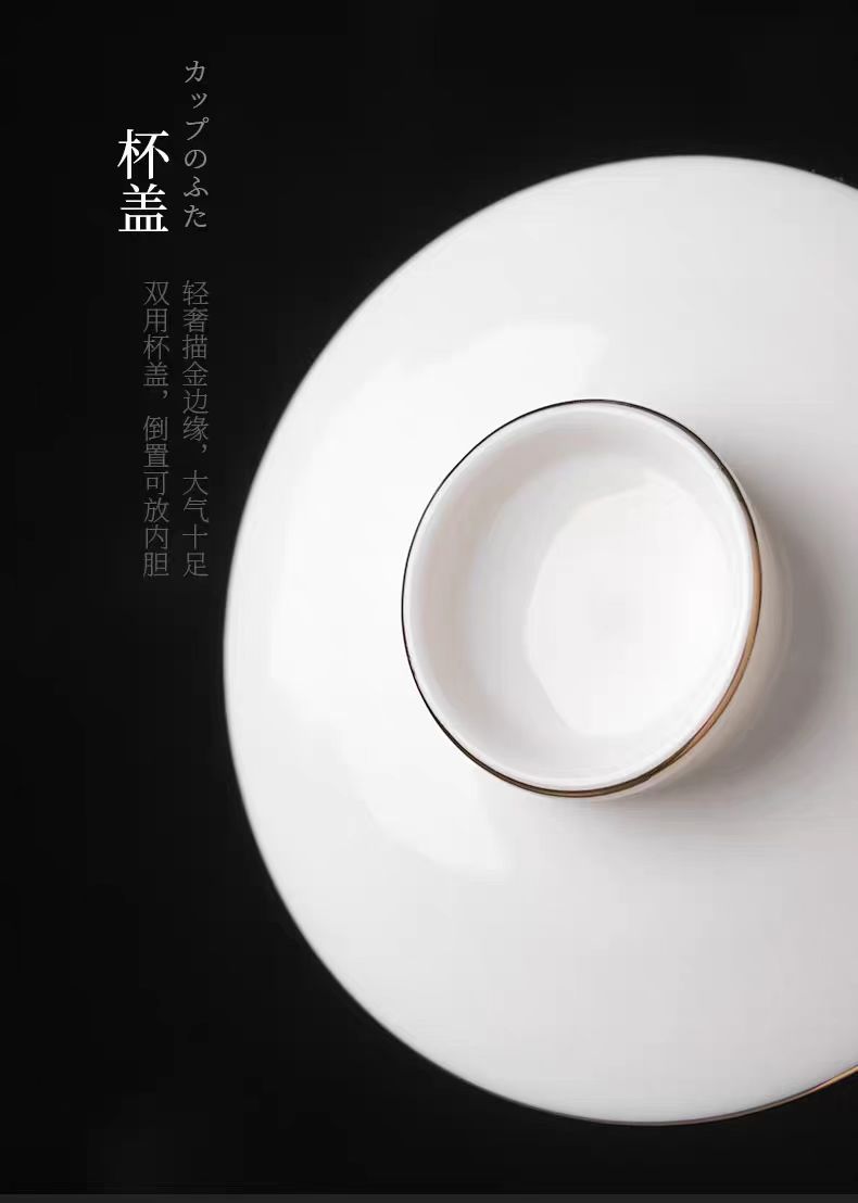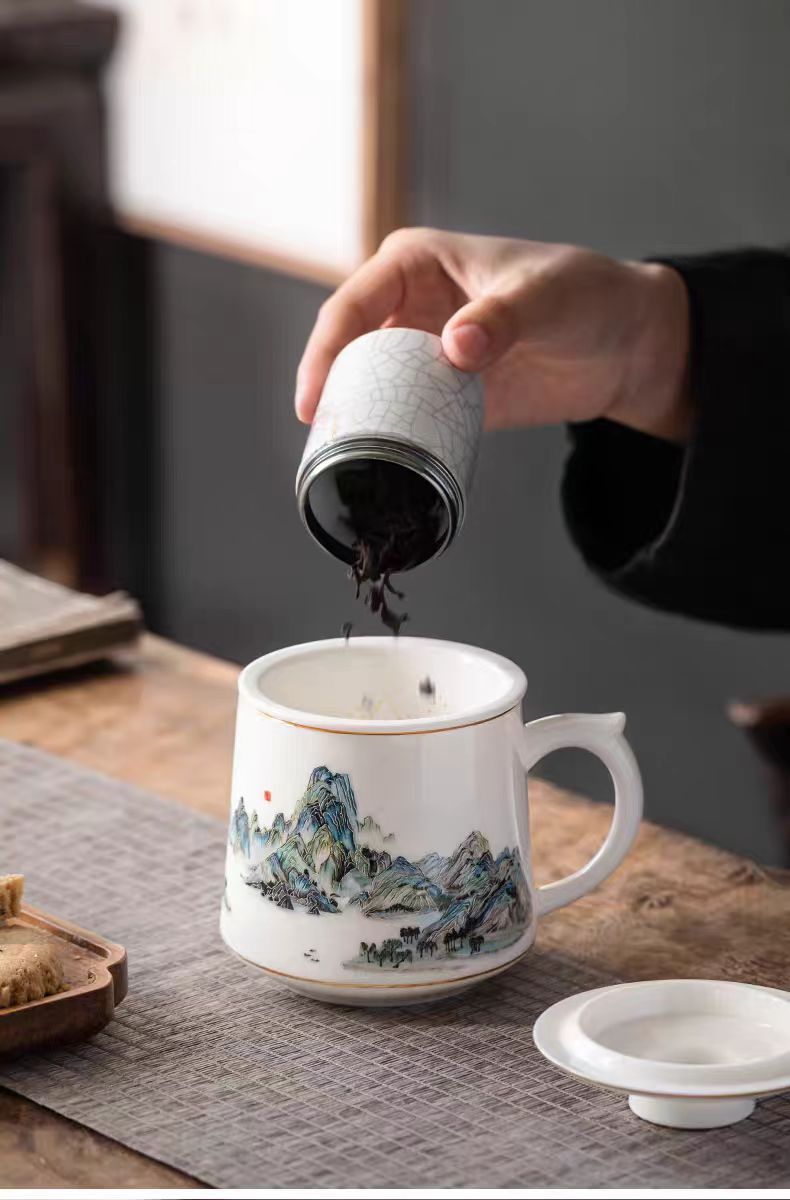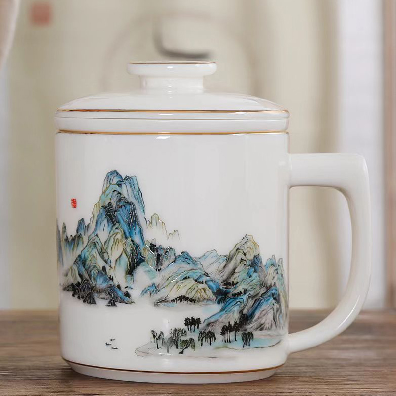 配 制: 1杯 1盖 1茶漏 1礼盒手提袋 规格:高办公杯:14.5*11.5cm 矮办公杯:12*11.5cm 材质:羊脂玉瓷 描24K真金 堆料立体画面 推荐说明:羊脂玉瓷,精选优质高价瓷土 ,瓷质细腻润滑,似凝脂,如美玉。在阳光照射下,呈半透明羊油状,洁白滋润,故称羊脂玉,乃瓷中佳品。做工精细,一丝不苟,儒雅内敛,浑身散发着出凡托俗的高贵气质。
