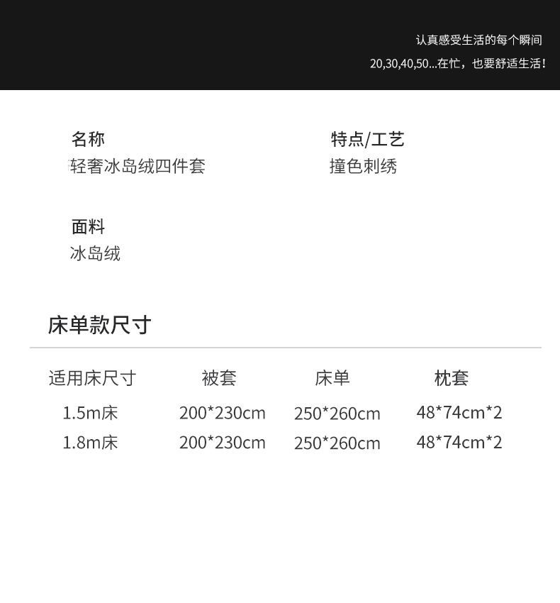 被套:200*230cm 床单:250*260cm 枕套:48*74cm*2 面料:冰岛绒 产品包装:精美礼盒 包装尺寸:50*40*20cm 1.冰岛绒面料结构蓬松,能够留存大量静止空气,具有出色的保暖效果。提供温暖舒适的体验。 2.面料手感非常柔软,接触皮肤时感觉细腻顺滑。 3.具有自然、柔和的光泽。且面料绒毛丰满,质感十足,大气。