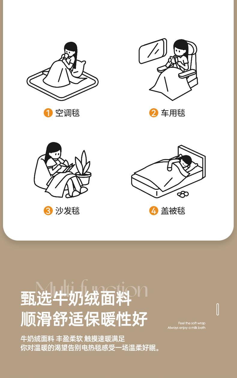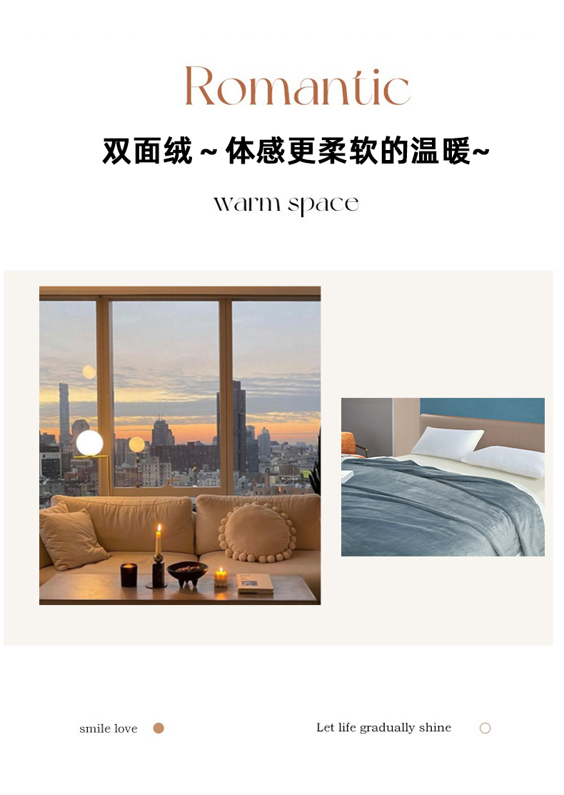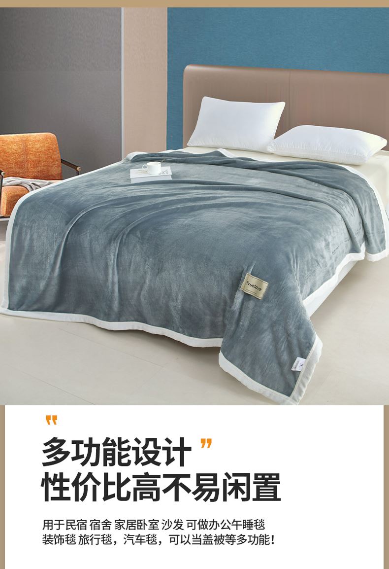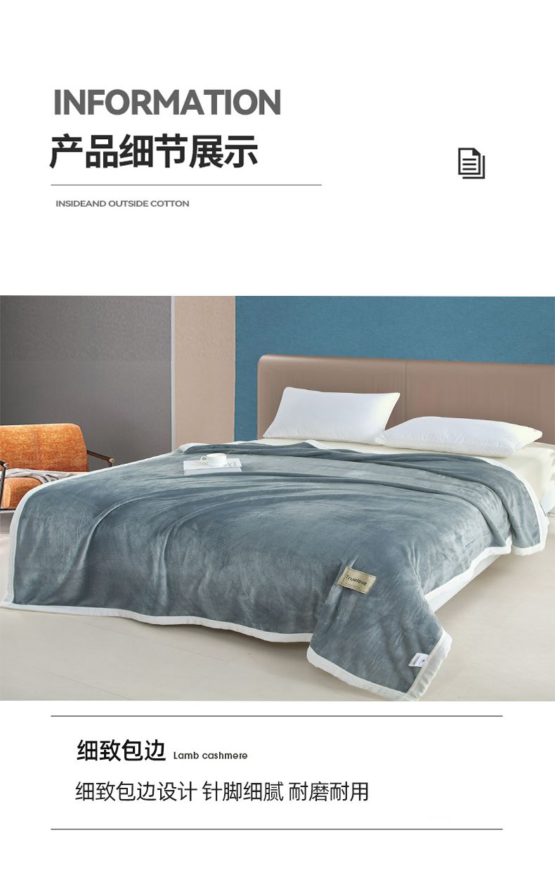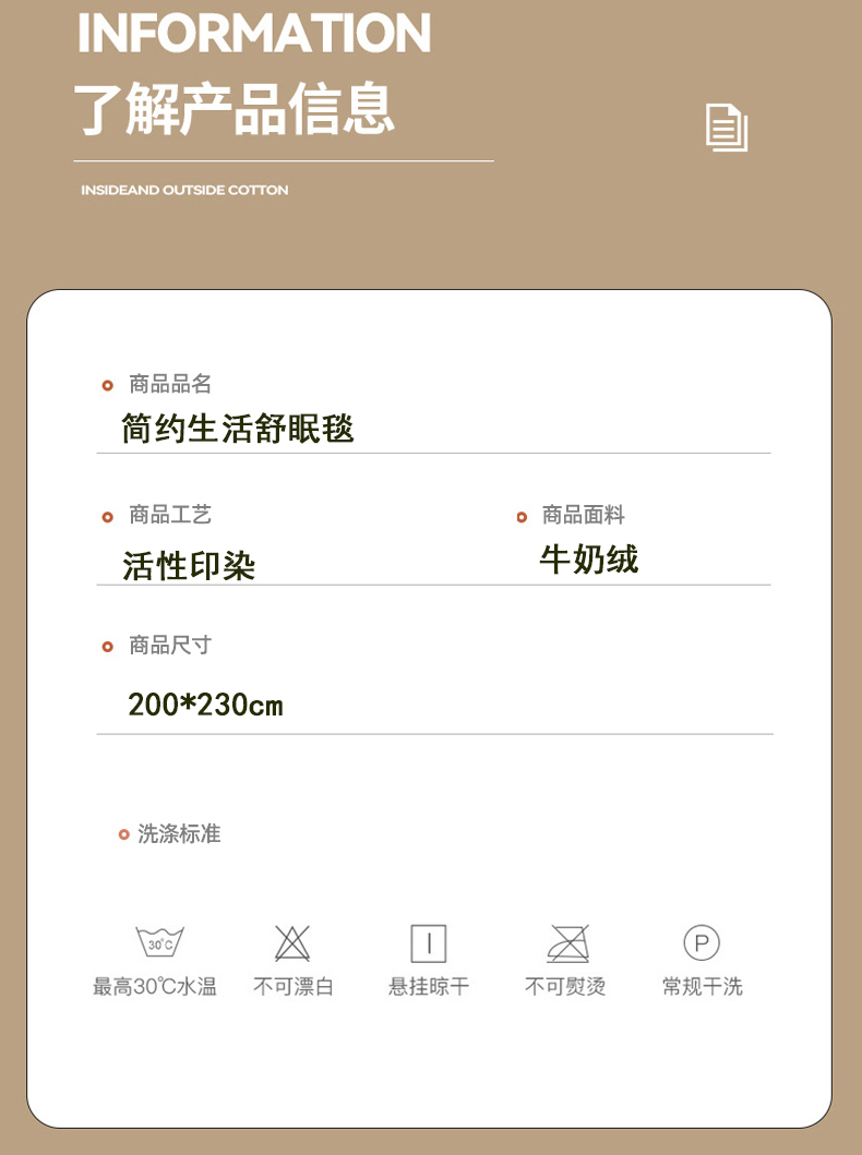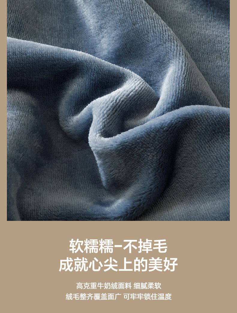 规格:200*230cm 面料:牛奶绒 克重:1500g 产品包装:精美礼盒 包装尺寸:48*35*16cm 特点:牛奶绒面料,充分吸收汗气蒸发产生的热量, 舒适透气,精美大方,绒感细腻,呵护您娇嫩 肌肤新型植绒技术,绒毛结构丰盈紧实,不 易掉毛告别掉毛烦恼。