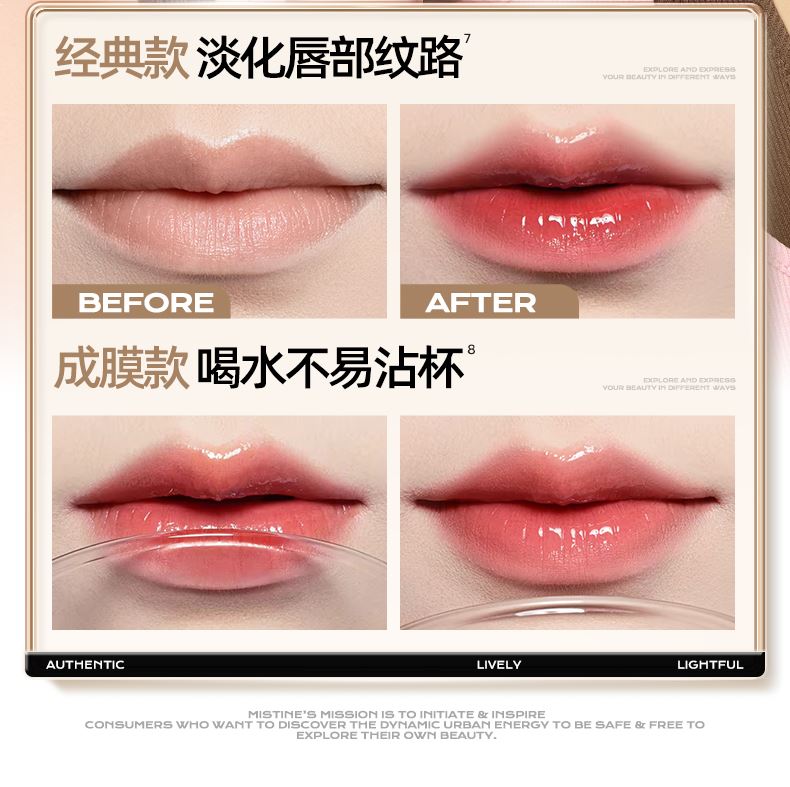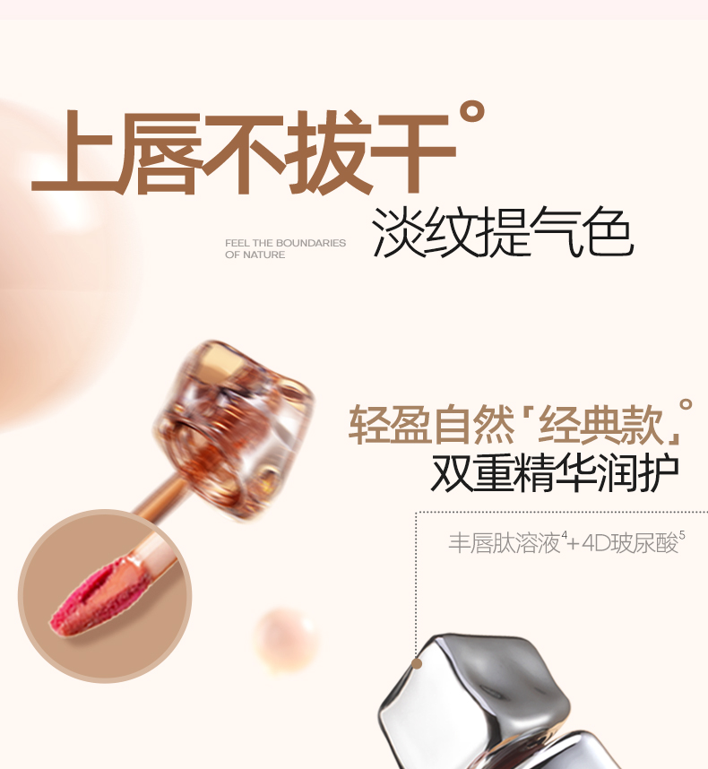 2大妆效: 霜转轻雾、水光嘟嘟 1)霜转雾面款带来丝滑绒绒触感,同时轻薄柔焦,持色不拔干: 01 一抿霜转雾,越抿越滑 • 触唇由霜转雾,一抿激活柔焦粒子,雾感弥漫 • 「熔岩奶咖」般绵密丝滑 02 越抿越润,不拔干不卡纹 • 外哑内润,抚平唇纹 • 玻尿酸入妆,干唇友好 04 融入泰妆精髓 专研低饱和奶咖色系 • 比口棕更显白嫩,比红调更提气色 2)水光款平衡水光唇釉的黏腻感和嘟嘟唇妆效: 01 1%丰唇肽入妆,一抿冻感亮嘟嘟 • 精华凝冻成膜,不粘不腻不拉丝 • 足量添加1%丰唇肽,立显饱满嘟嘟 02 三重奢养精华油,8H持续水嘟嘟 • 持续养护双唇,卸妆后依然软软嫩嫩 03 清透高遮盖,深唇也能嫩嘟嘟 • 专研高显色配方,薄涂即可高覆盖 • 一抹即卸不染唇 04 融入泰妆精髓 专研奶咖色系 • 比口棕更显白嫩,比红调更提气色