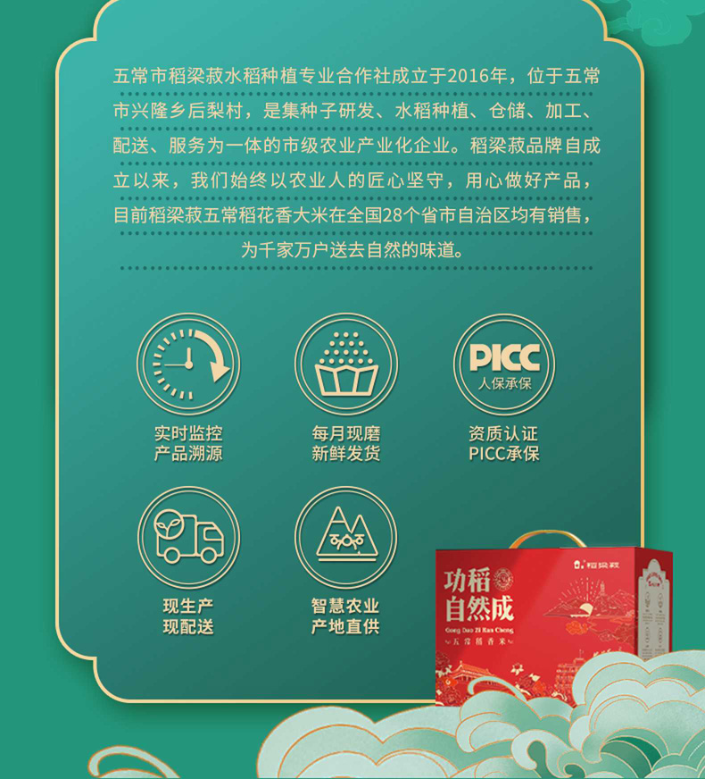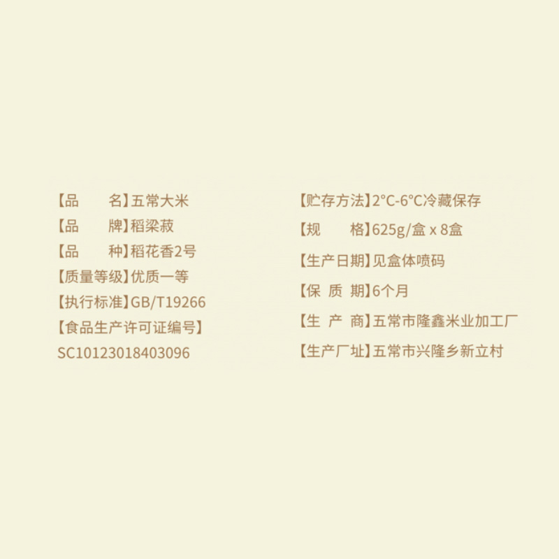 包装:充氮保鲜利乐包装 执行标准:GB/T 19266 保质期:6个月 质量等级:优质一级 产地:黑龙江五常市 产品尺寸:300mm*180mm*210mm 推荐理由: 1、五常有机稻花香2号米。 2、PICC人保承保产品。 3、稻田24小时实时监控。 4、智慧农业系统。 5、当月现磨新米发货。 6、独立溯源码。 7、屋顶盒充氮保鲜技术。
