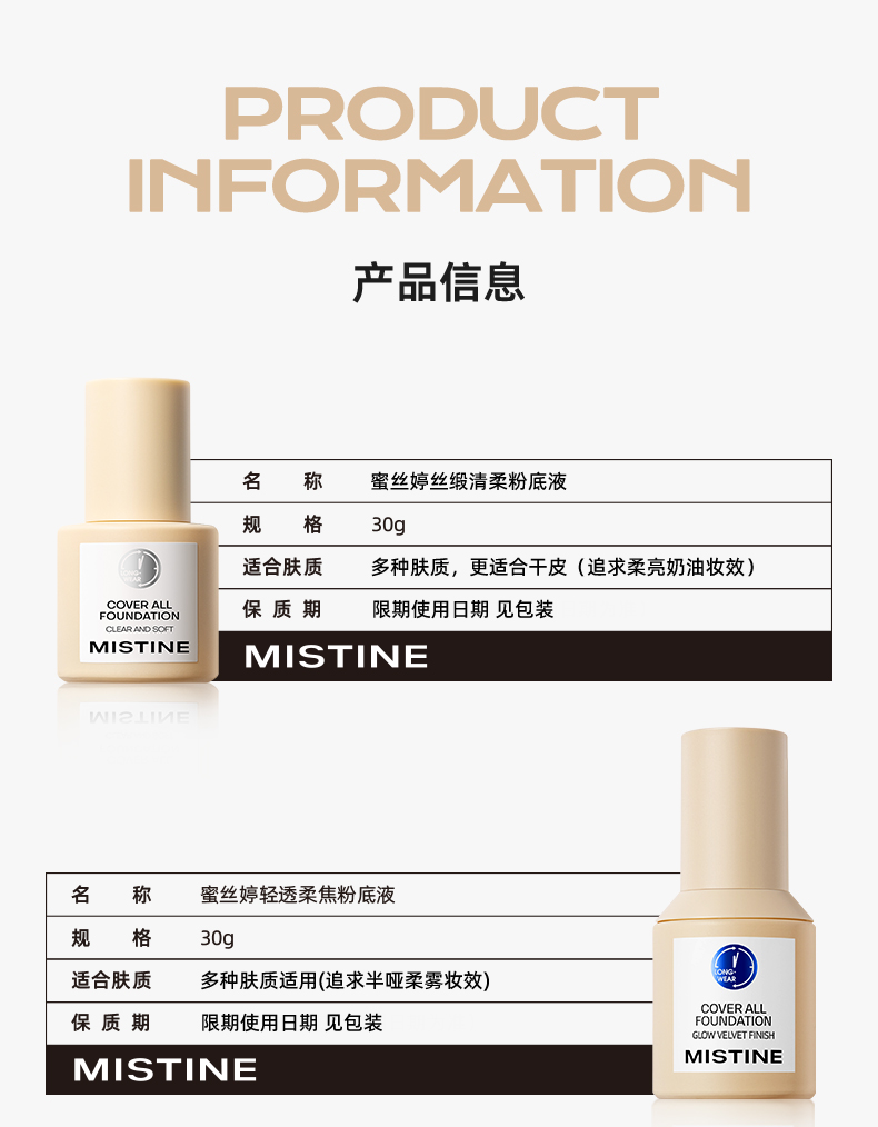 蜜丝婷丝缎清柔蓝盾粉底液适合干皮LF100透亮瓷白色