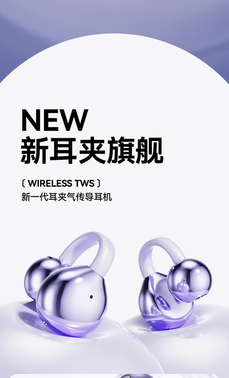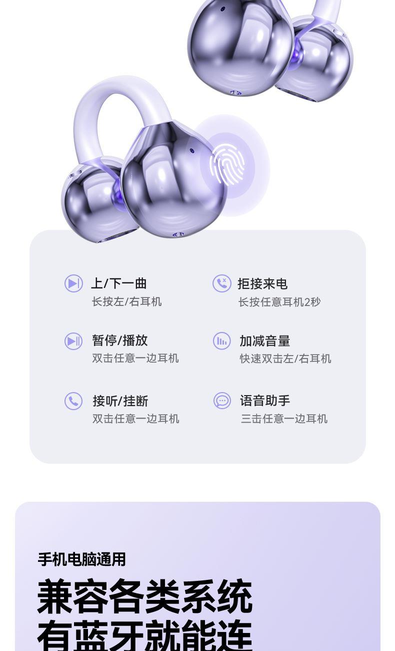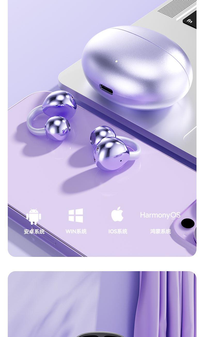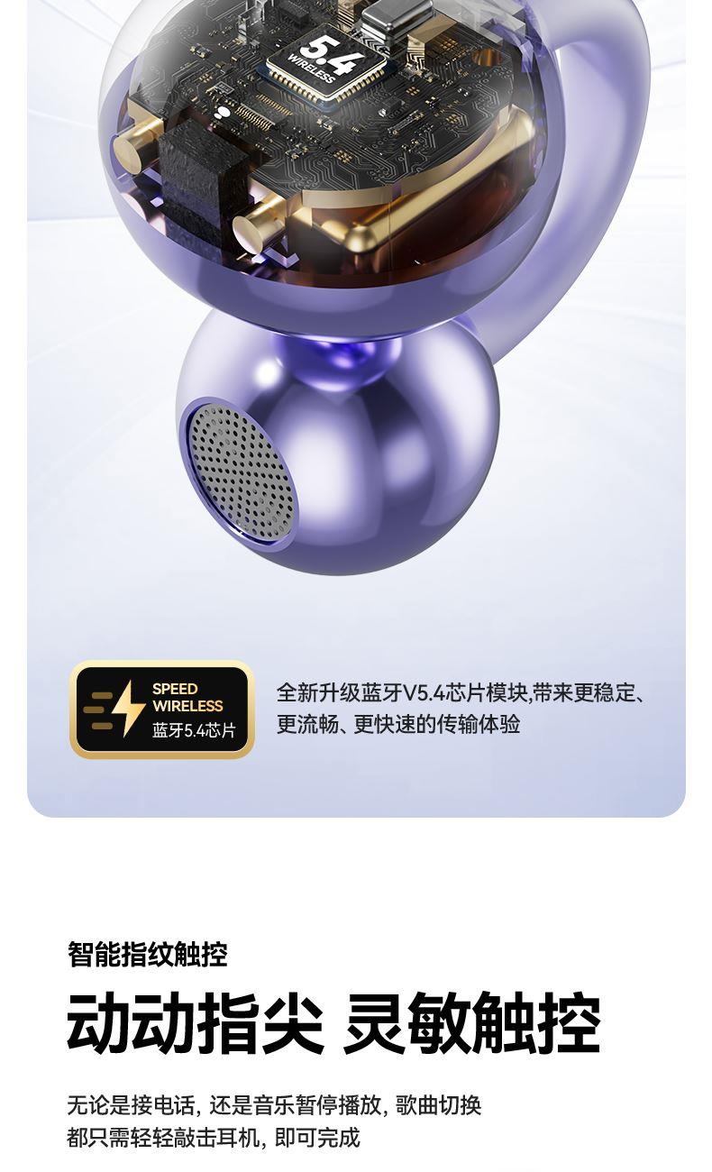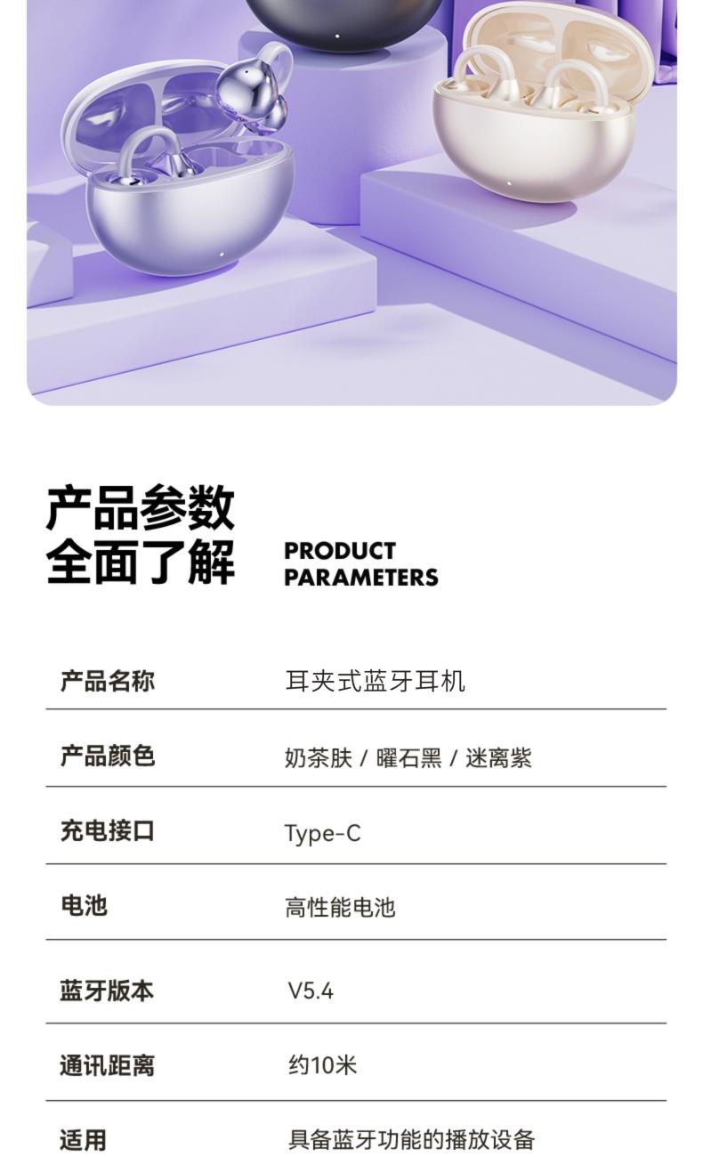 产品规格:6.4*5.1*3cm 产品净重:48g 材 料:ABS 产品颜色:黑色 紫色 肤色 使用时间:2-3小时 连接距离:10m 耳机容量:30mAh 电池容量:230mAh 充电电压:5V 产品特点: 智能指纹触控 触控随心 超轻耳夹 不入耳 真无感 人体工学设计 三角稳固不掉 蓝牙5.4强大内芯 稳定不断连