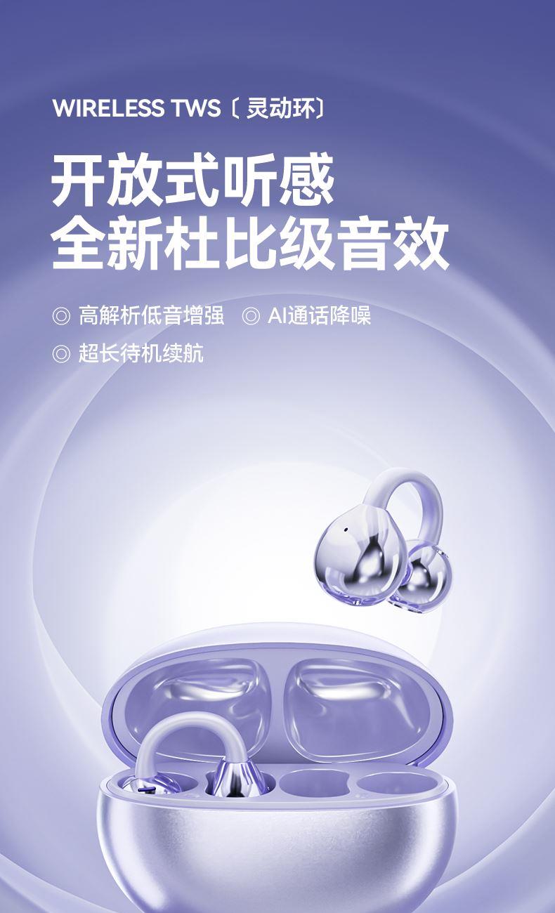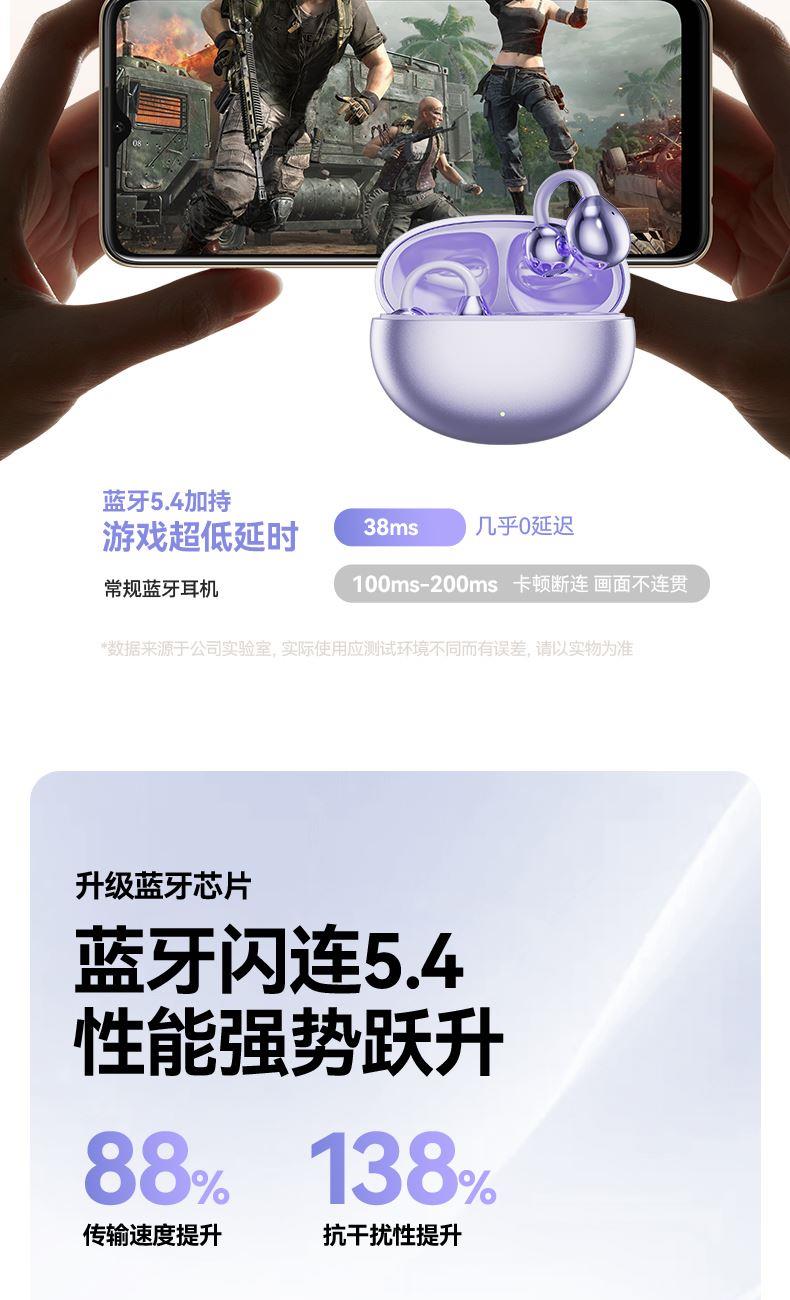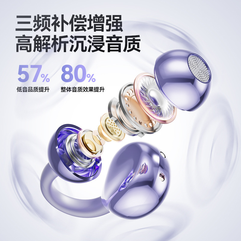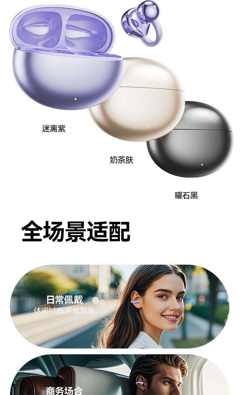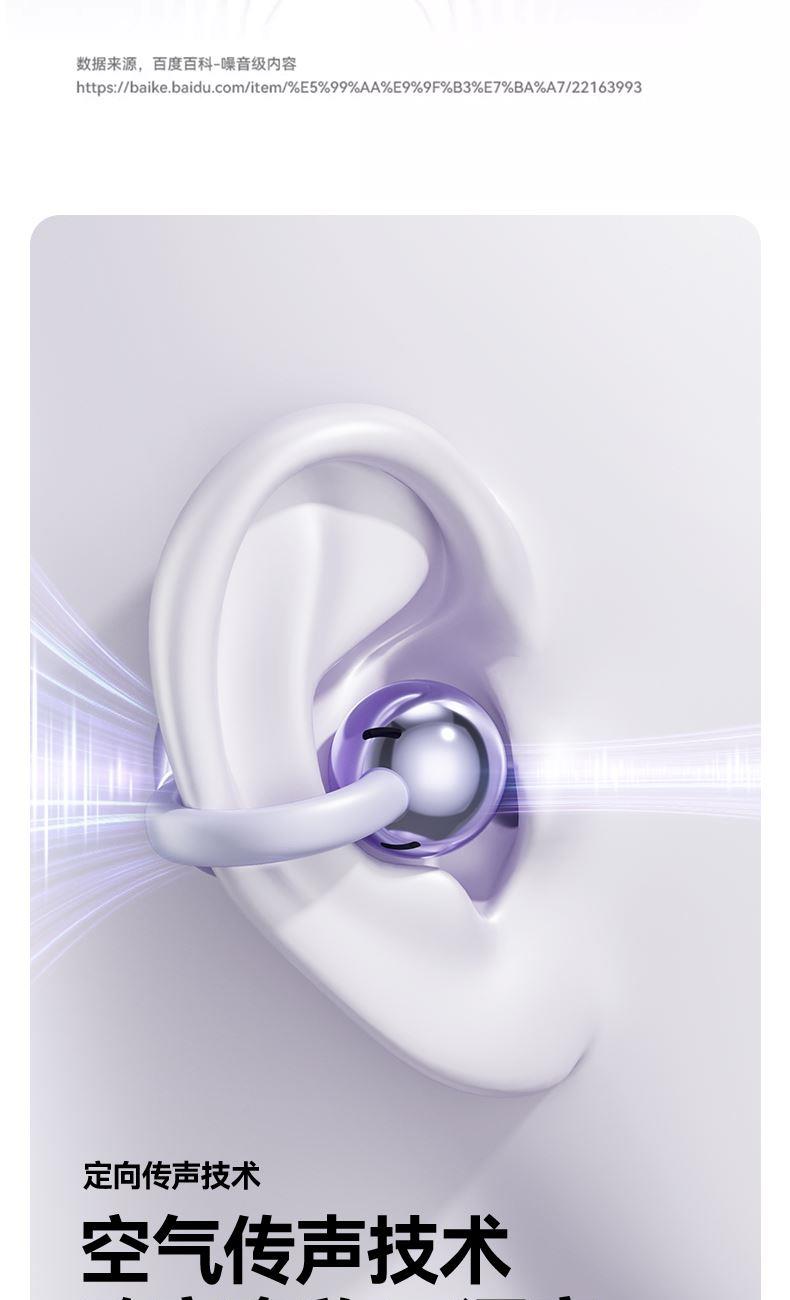 产品规格:6.4*5.1*3cm 产品净重:48g 材 料:ABS 产品颜色:黑色 紫色 肤色 使用时间:2-3小时 连接距离:10m 耳机容量:30mAh 电池容量:230mAh 充电电压:5V 产品特点: 智能指纹触控 触控随心 超轻耳夹 不入耳 真无感 人体工学设计 三角稳固不掉 蓝牙5.4强大内芯 稳定不断连